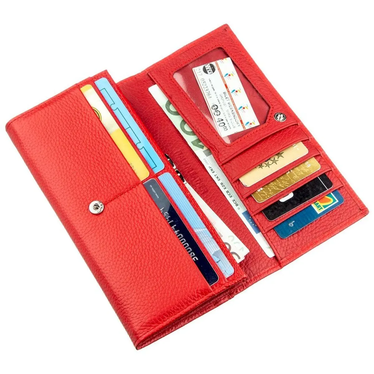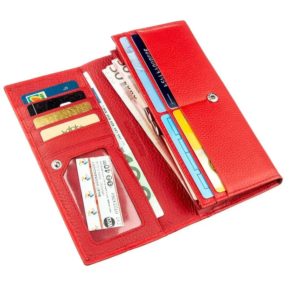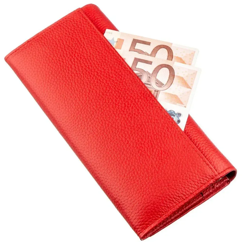 Ефектний жіночий гаманець для яскравих і непересічних особистостей. Матеріал виготовлення – високопробна натуральна шкіра із зернистою фактурою, на дотик м'яка та приємна. Родзинкою гаманця є його насичений червоний колір із матовим відтінком. Всередині аксесуару є багато різних відділень, а саме: три великі відділення для купюр і банкнот, монетниця на клямці, відділення на блискавці по всій довжині, вісім кишень для різних візиток і банківських карток. На тильній стороні є ще одне велике приховане відділення. Запакований гаманець у тверду картонну коробку.