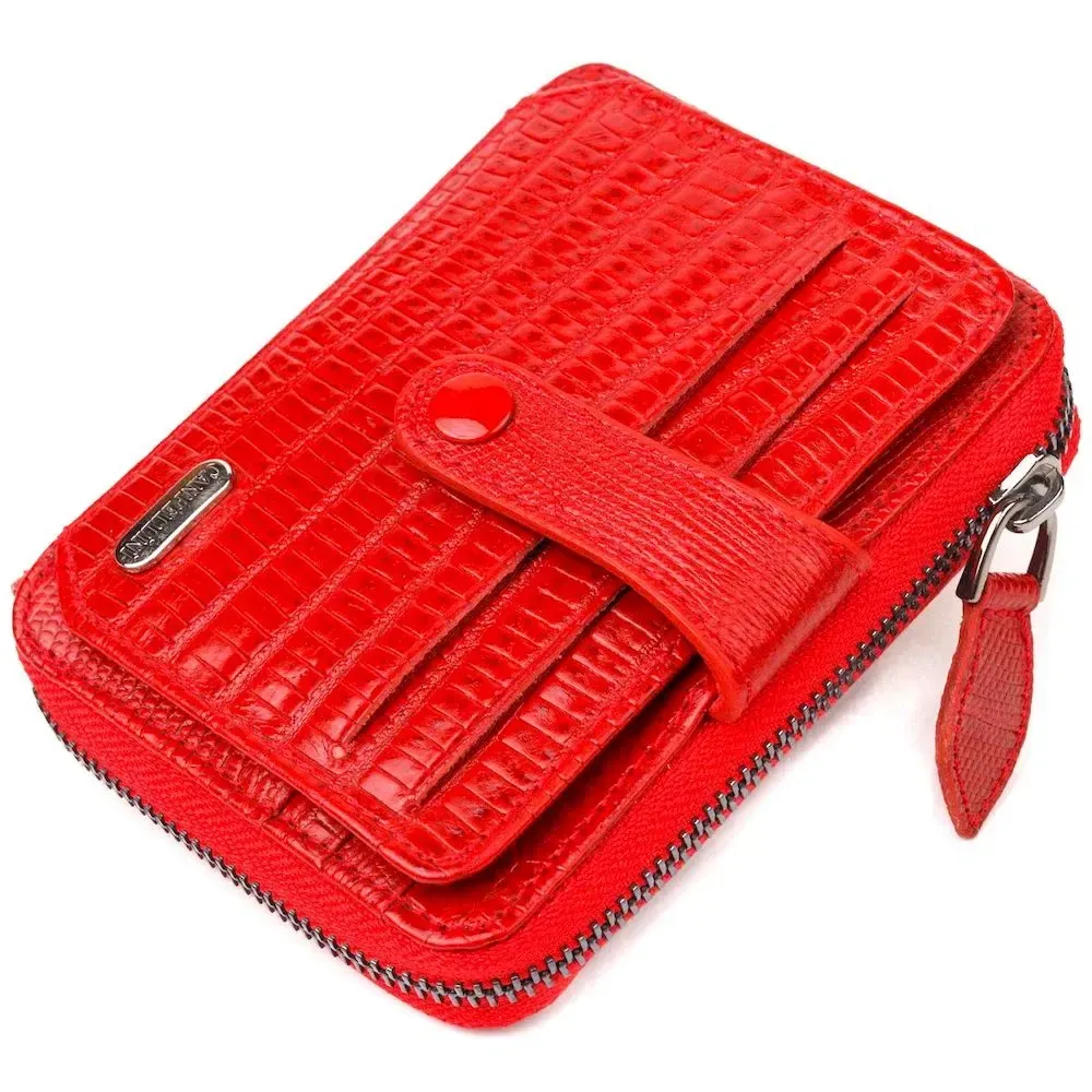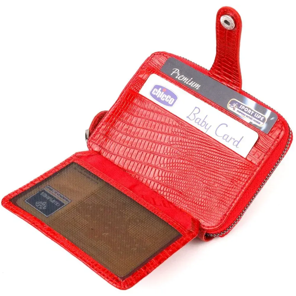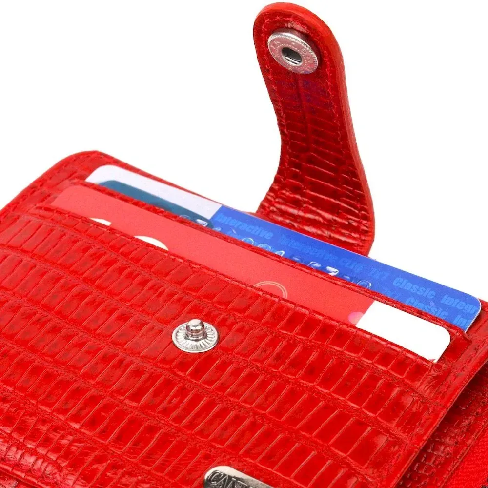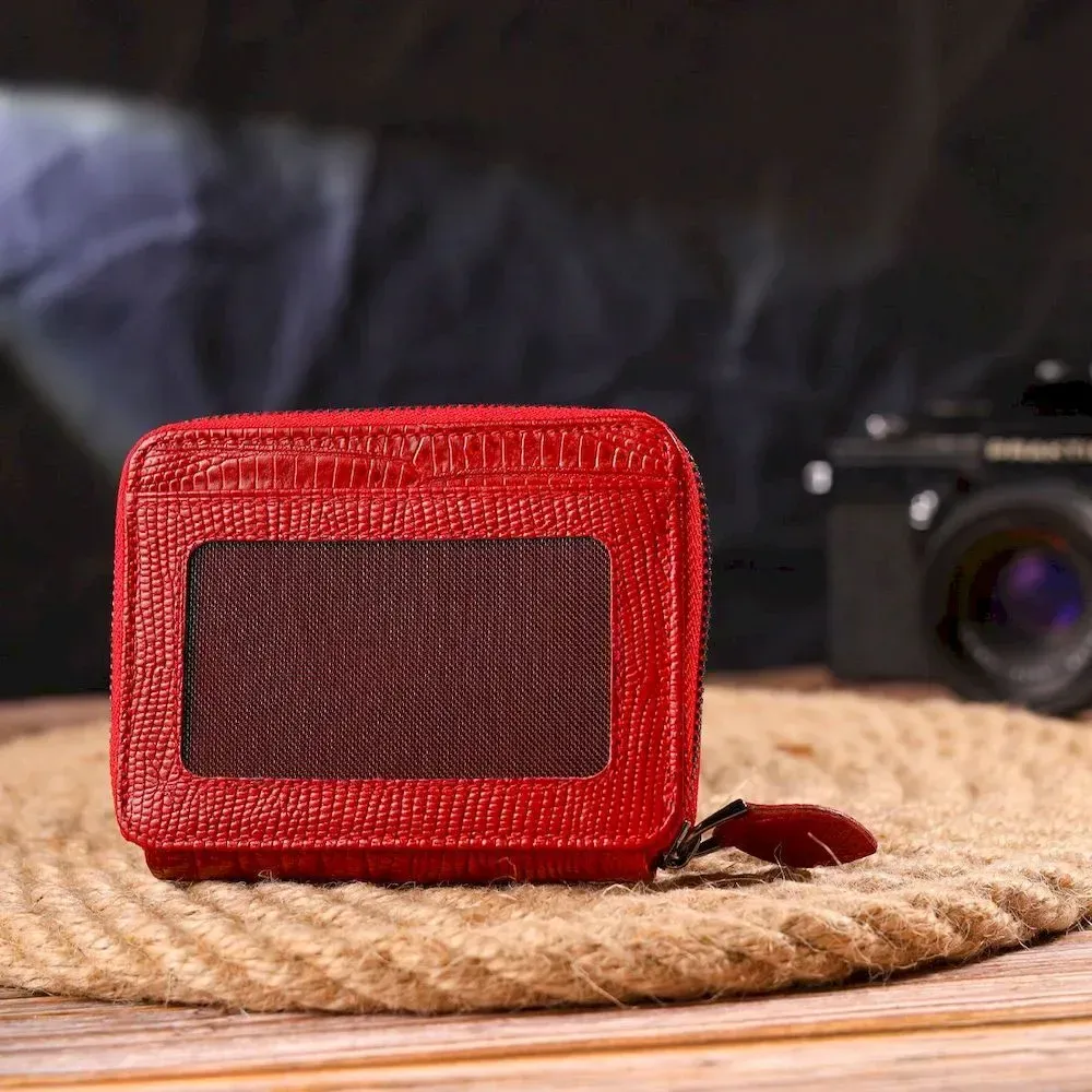 Цікавий гаманець для впевнених у собі жінок, з натуральної фактурної шкіри, з тисненням під рептилію, в яскравому червоному кольорі. Аксесуар має одне основне відділення, в яке поміщаються купюри всіх номіналів, одинадцять кишень для карток, одна з яких під сіточкою, блок для карт із зовнішнього боку, а також кишеня для пропуску під сіточкою з лицьового боку. Закривається аксесуар на блискавку, а блок для карток хлястиком на кнопку. Колір фурнітури – темне срібло. Шкіряний гаманець є дивовижним подарунком для дружини, дівчата, подруги.