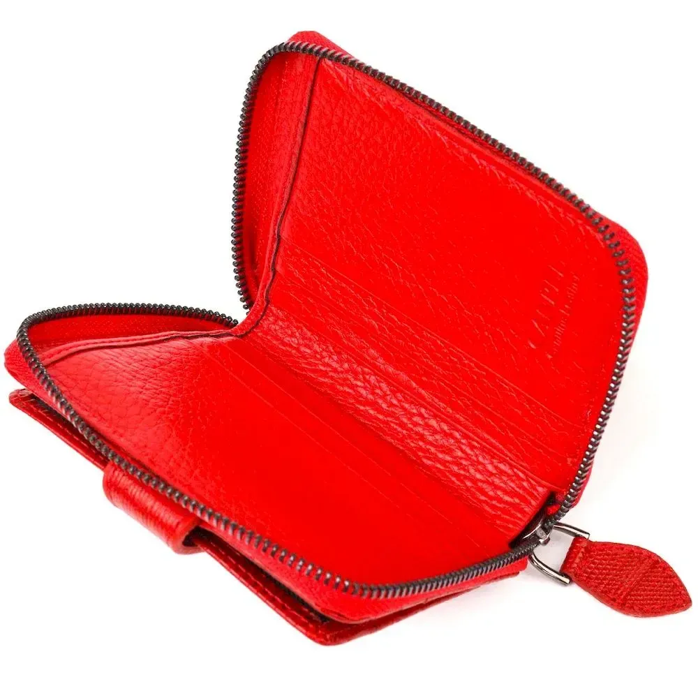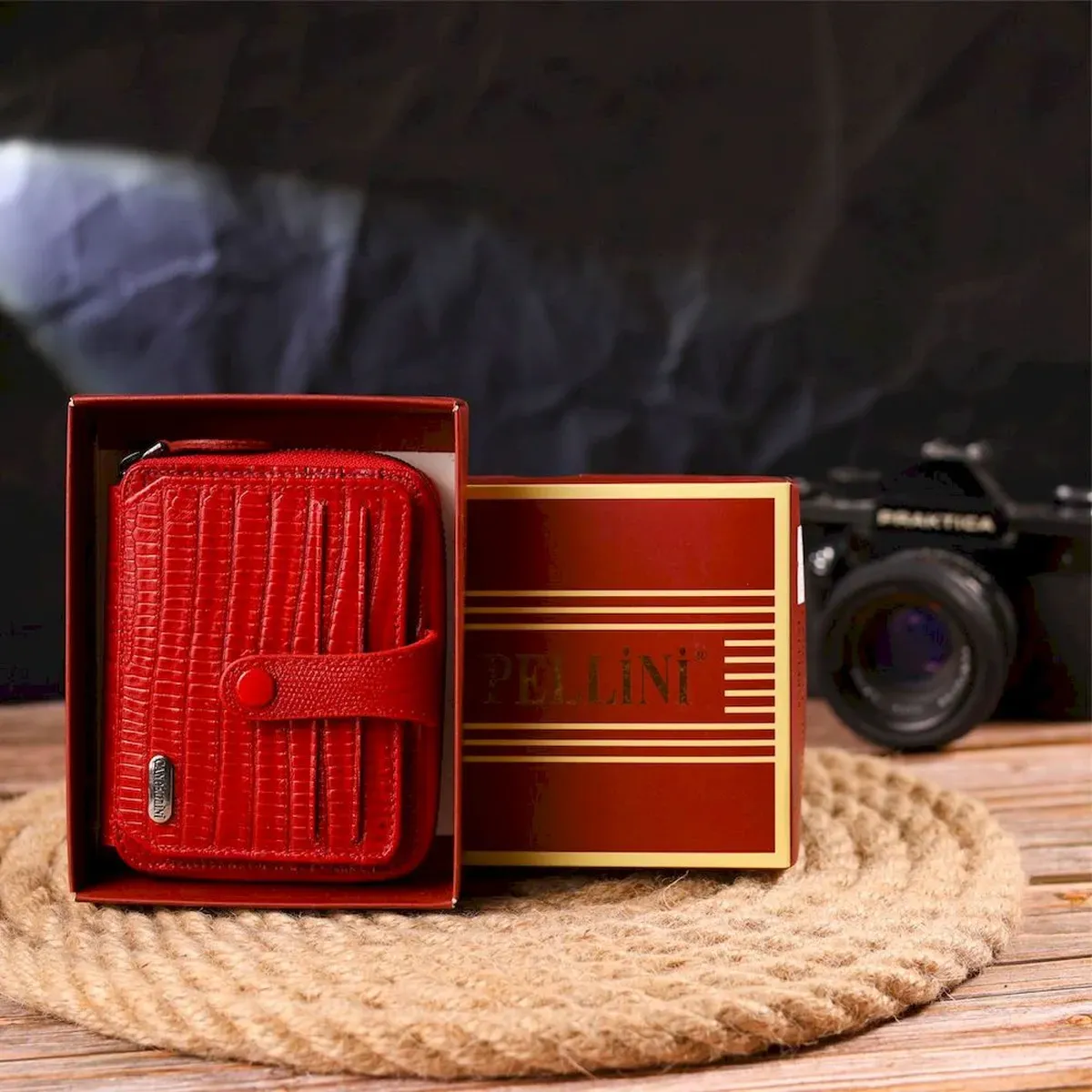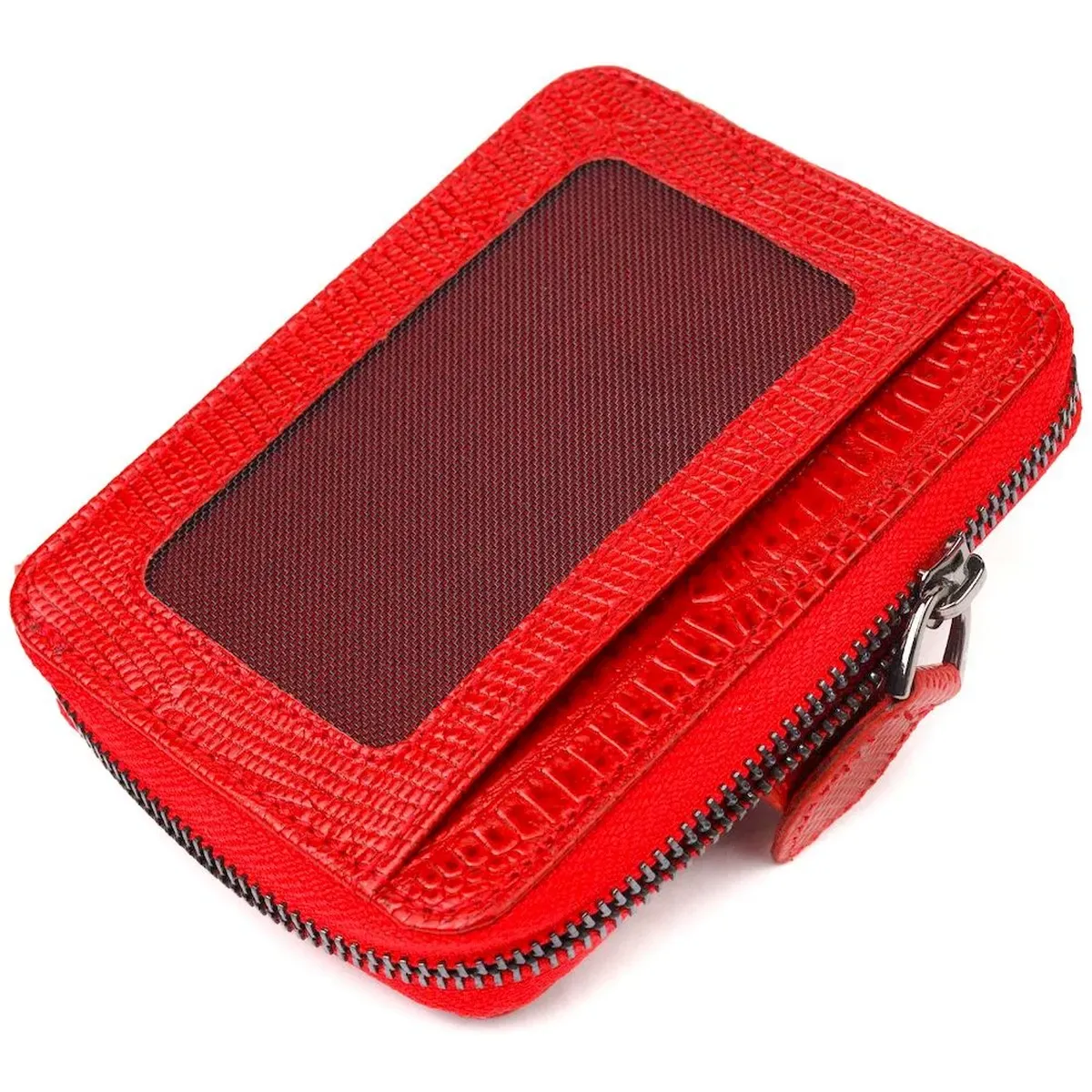 Цікавий гаманець для впевнених у собі жінок, з натуральної фактурної шкіри, з тисненням під рептилію, в яскравому червоному кольорі. Аксесуар має одне основне відділення, в яке поміщаються купюри всіх номіналів, одинадцять кишень для карток, одна з яких під сіточкою, блок для карт із зовнішнього боку, а також кишеня для пропуску під сіточкою з лицьового боку. Закривається аксесуар на блискавку, а блок для карток хлястиком на кнопку. Колір фурнітури – темне срібло. Шкіряний гаманець є дивовижним подарунком для дружини, дівчата, подруги.