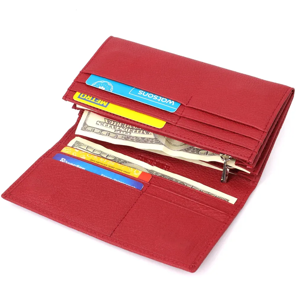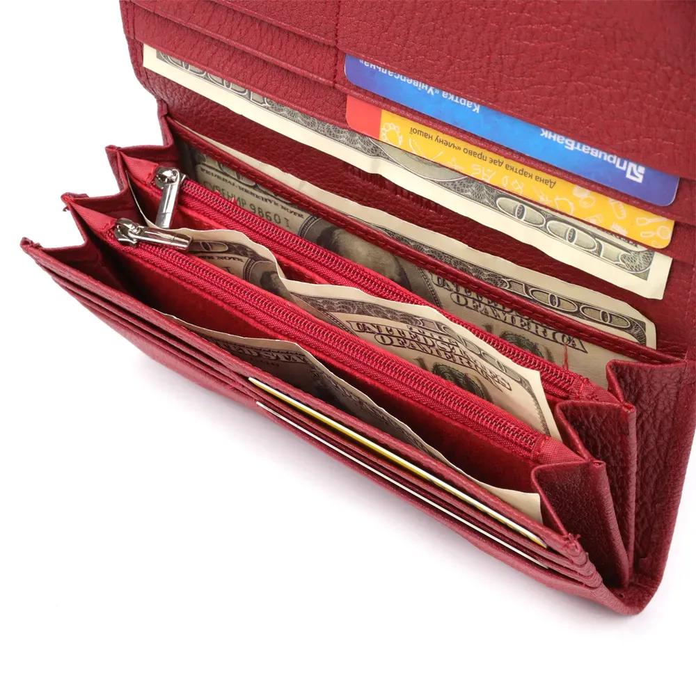 Яскравий жіночий гаманець для тих, хто цінує якість, функціональність та стиль. Цей аксесуар, виготовлений з високоякісної натуральної шкіри, ретельно продуманий до дрібниць, забезпечуючи максимальний комфорт у використанні. Усередині гаманця — три відділення для купюр, дві кишені на блискавці, прозора кишеня, вісім осередків для пластикових карток і два приховані відділення. Зовні є зручна кишеня для монет. На лицьовій стороні, в нижньому кутку, розташований акуратний металевий логотип бренду, який підтверджує оригінальність та високу якість виробу. Гаманець оснащений міцною підкладкою та надійною фурнітурою. Поставляється у фірмовій білій коробці, що робить його чудовим вибором як для особистого користування, так і для подарунка.