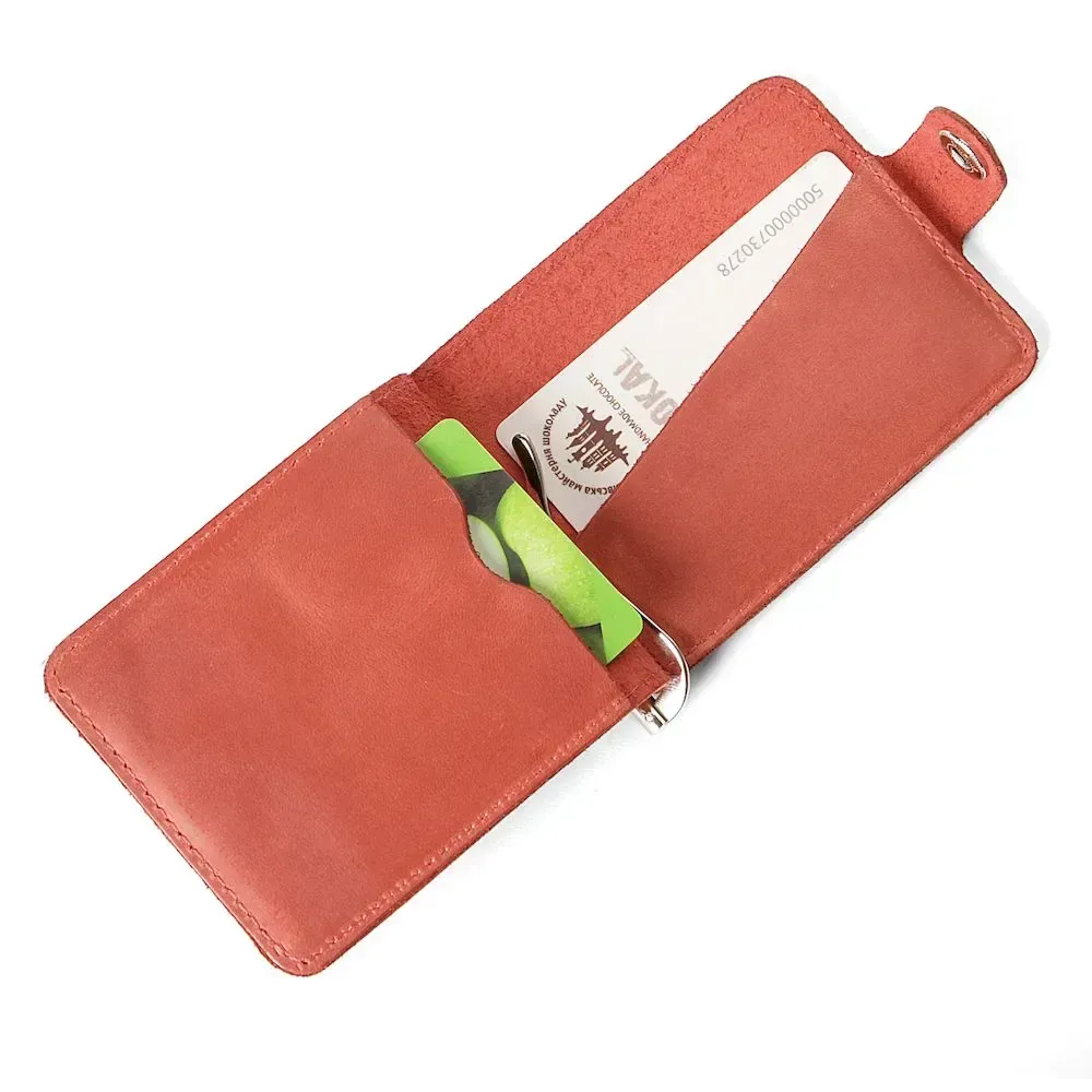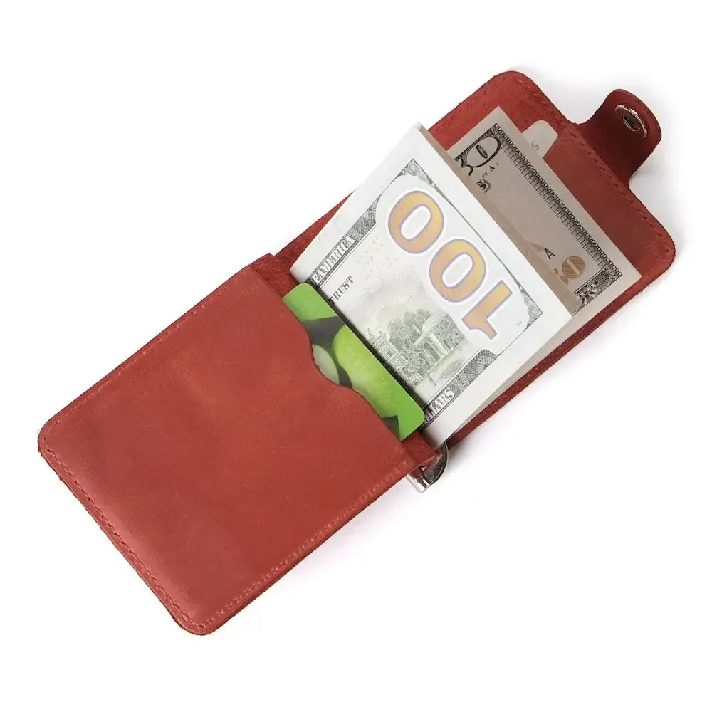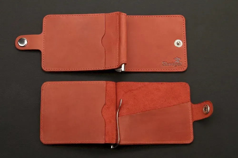 Стильний шкіряний затискач червоного кольору. Аксесуар виконаний із натуральної високоякісної вінтажної шкіри. Колір фурнітури: срібло. Виріб акуратно прошито надміцною червоною ниткою. На задній зовнішній стороні аксесуара знаходиться кишенька для пластикових карток. Затискач упакований у фірмовий текстильний пилозахисний чохол. ;">Всередині: