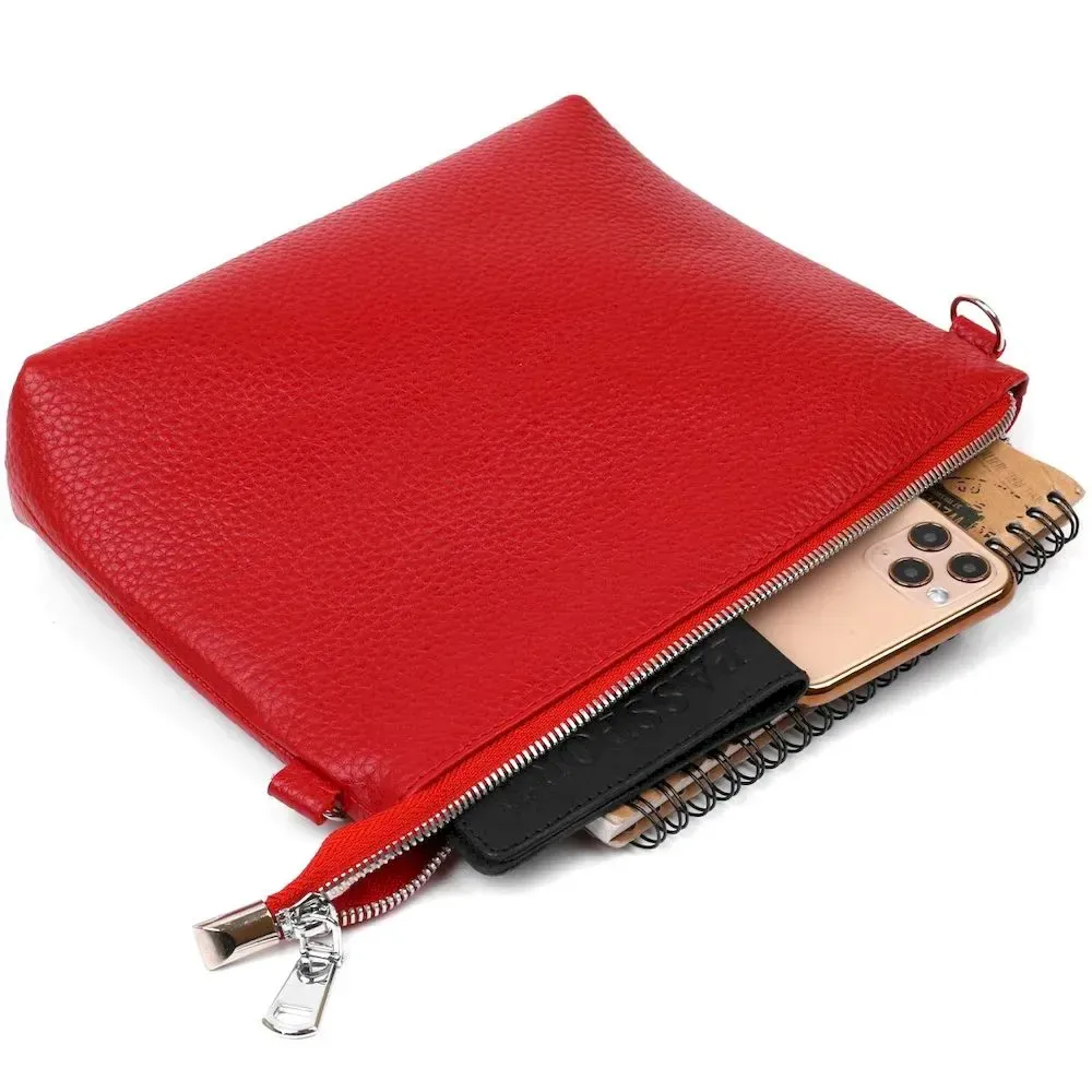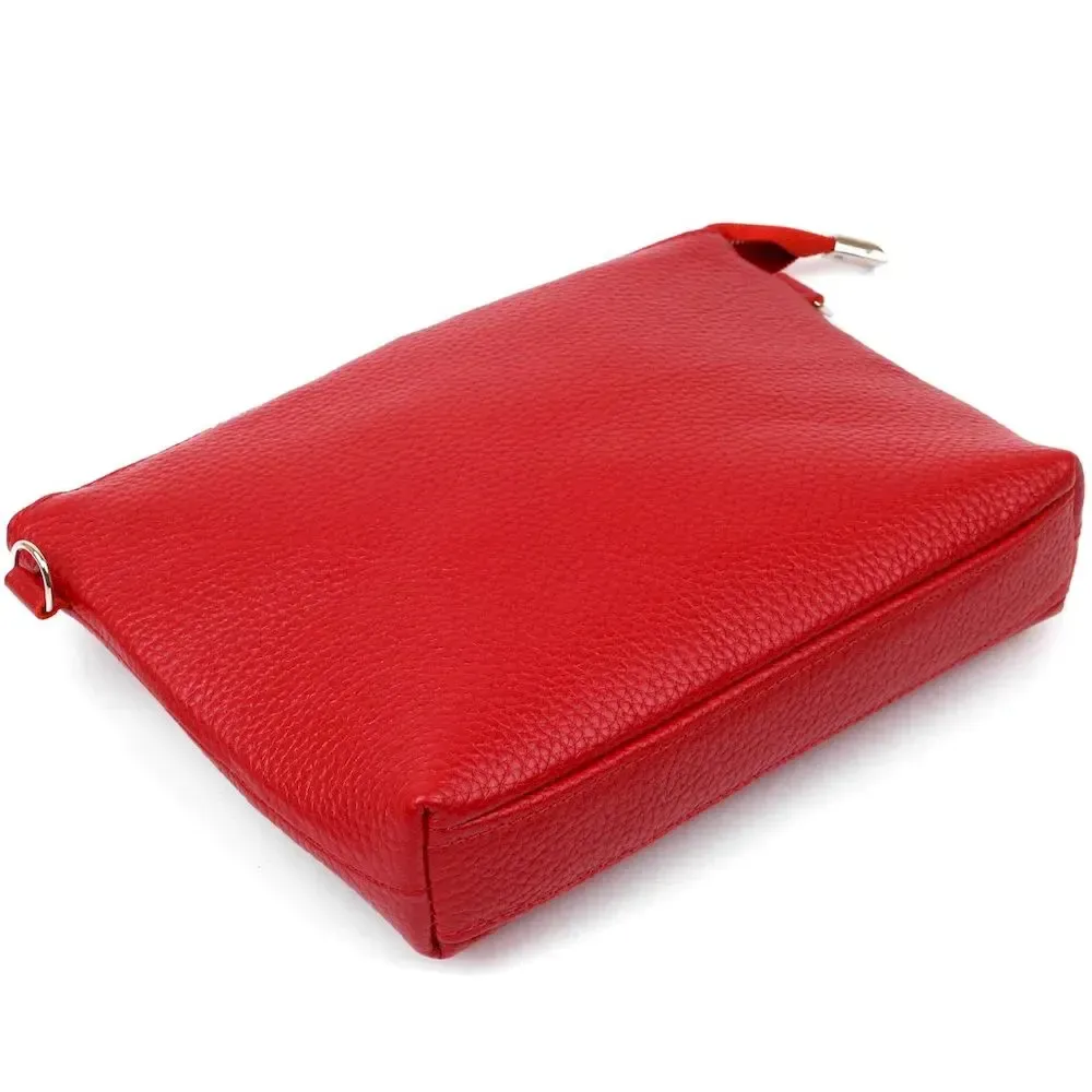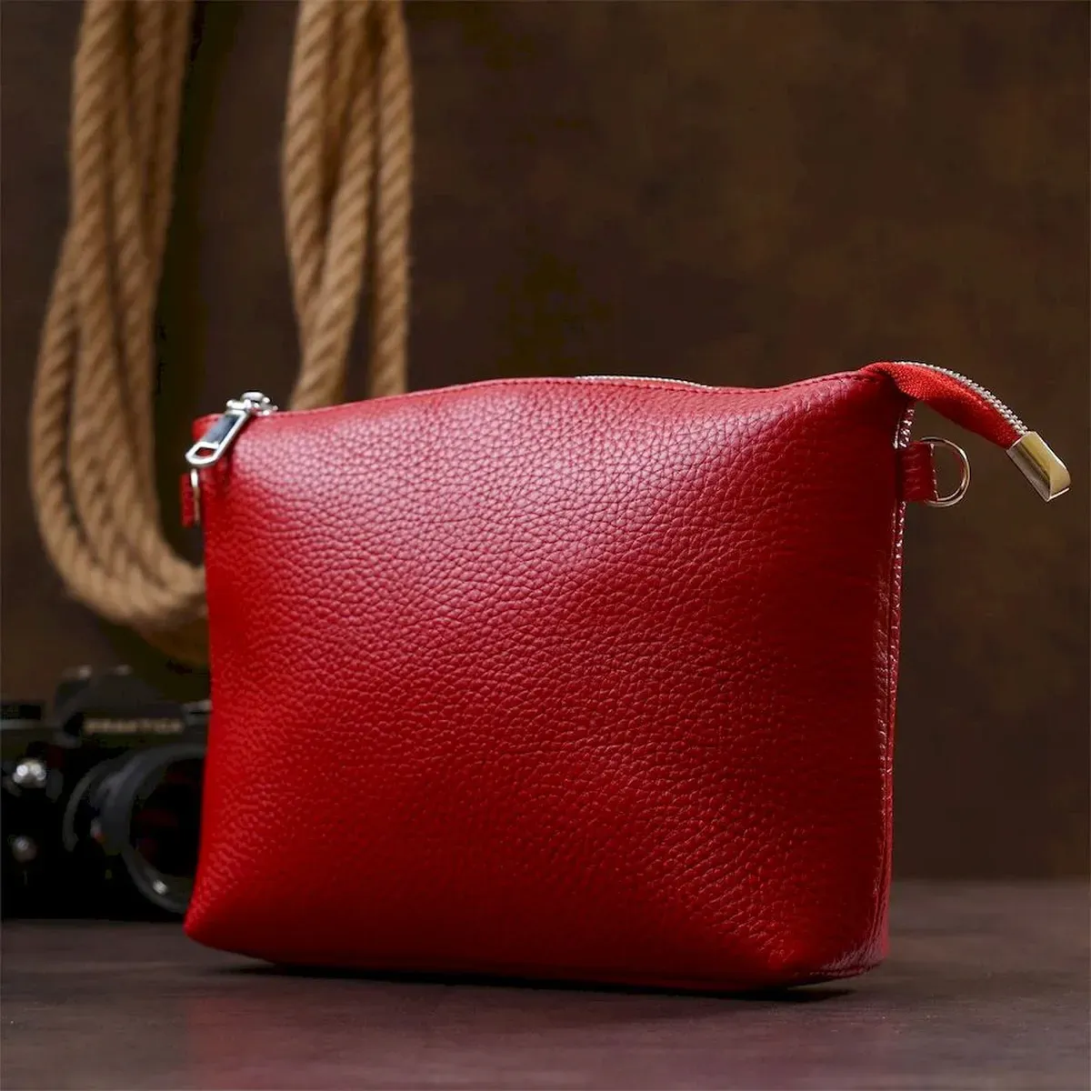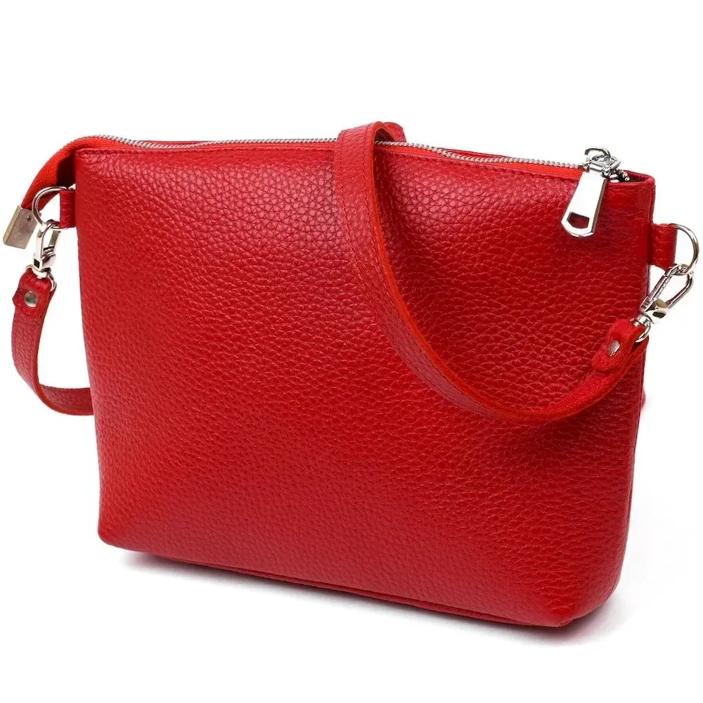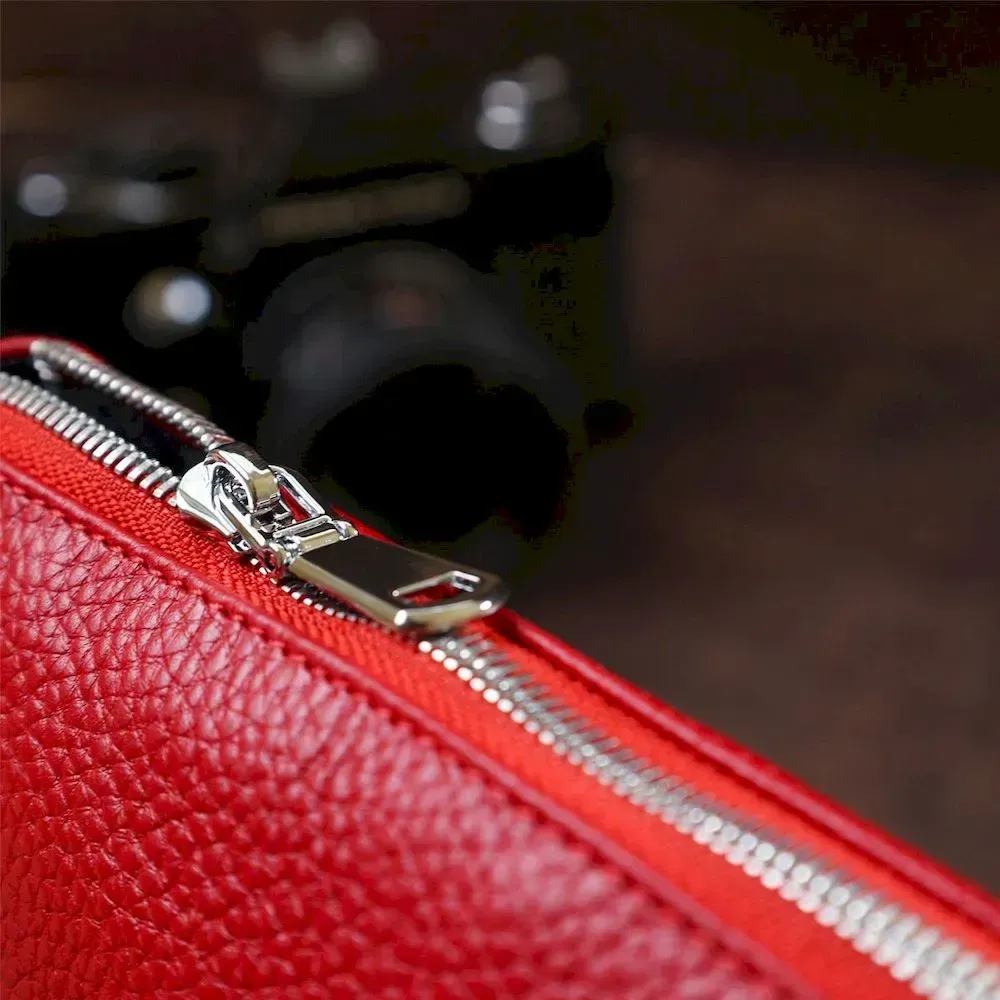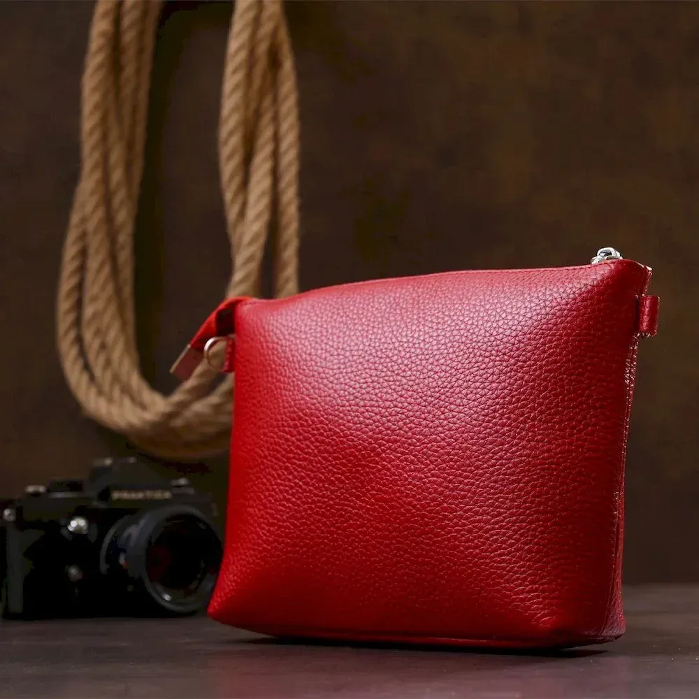 Яскрава шкіряна сумка з висококласної натуральної шкіри з покращеними характеристиками зносостійкості. Має одне містке відділення та кишеню для цінних речей на блискавці. Колір цієї моделі – насичений червоний, фактура – зернистий. Ремінь виконаний з натуральної шкіри та регулюється по довжині. Фурнітура виготовлена під срібло.