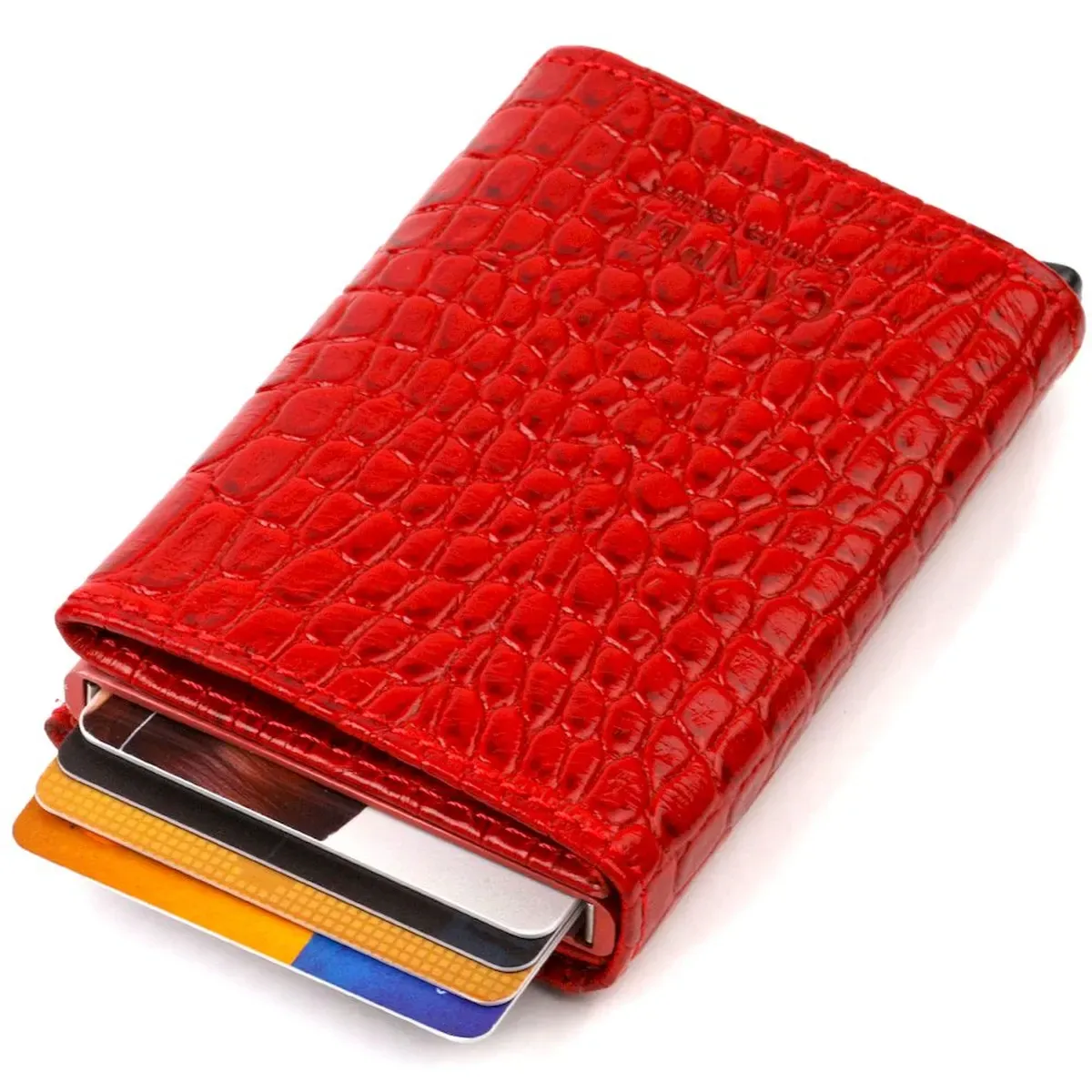 Жіночий картхолдер у три складання з автоматичним механізмом з натуральної шкіри з тисненням під крокодила CANPELLINI 21929 Червоний