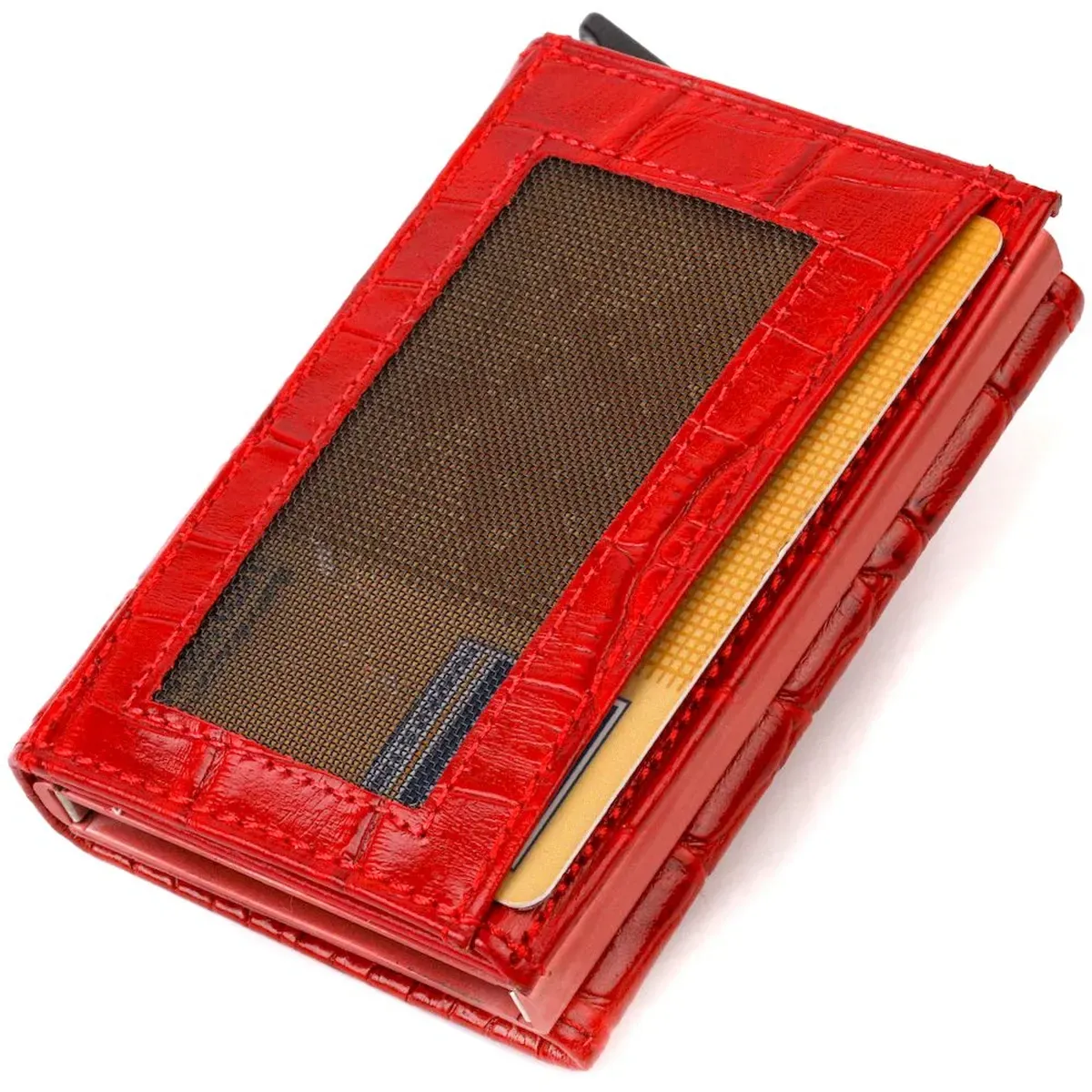 Чудовий картхолдер з натуральної шкіри, з тисненням під крокодила, призначений для зберігання банківських і дисконтних карток та невеликої кількості готівки. Має лаконічний дизайн, відмінно лягає в руку, поміщається в кишеню, а також будь-яку сумку. Шкіра м'яка, приємна на дотик. Механізм працює надійно та зручний у використанні; картки добре закріплені в аксесуарі. Відмінна ідея для подарунка близькій людині.