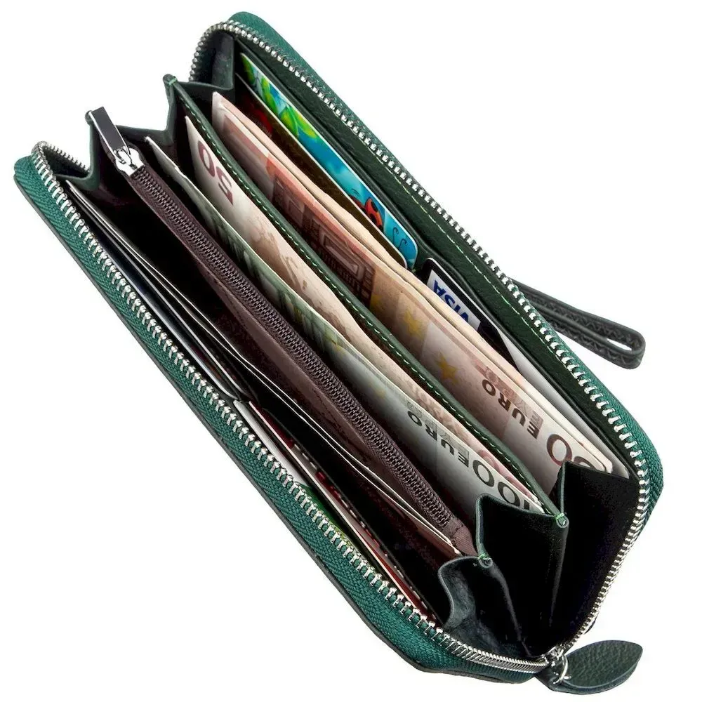 Вишуканий жіночий клатч- гаманець для дам з відмінним почуттям стилю та смаком. Матеріал виготовлення – Високопробна натуральна шкіра з прекрасною зносостійкістю, а значить гаманець прослужить дуже довго. Виріб має мальовничий і соковитий темно-зелений колір, який виглядає дуже багато і виграшно на тлі інших звичайних забарвлень, які вже так набридли за довгий час. Ця модель чудово підійде як для молодих дівчат, так і для жінок у віці. Аксесуар має у комплекті спеціальний ремінець на зап'ястя, що дозволяє носити його самостійно. Закривається він на металеву блискавку срібного кольору. Гаманець-клатч упакований у білу картонну коробку з фірмовим логотипом.