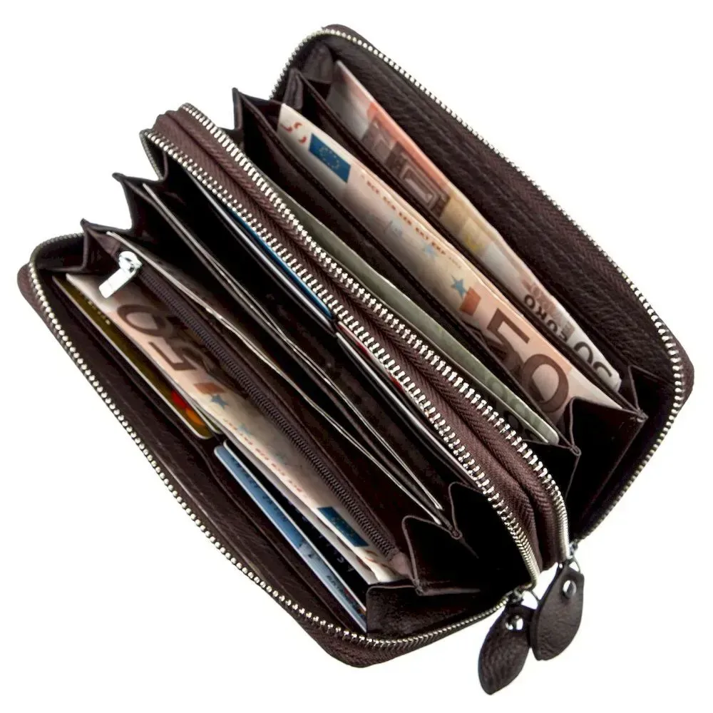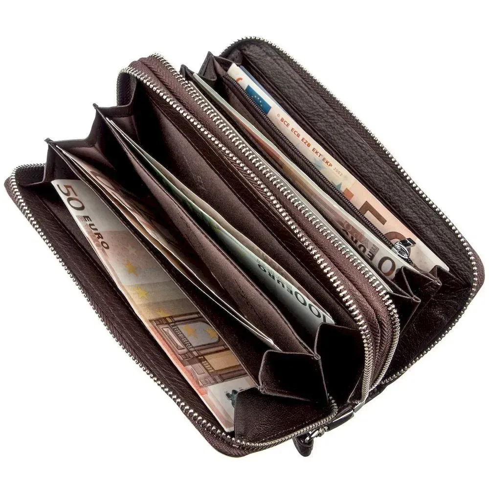 Зручний та багатофункціональний клатч для ділових та підприємливих людей. Виконаний із м'якої першокласної натуральної шкіри високої якості. Колір виробу – темно коричневий. Відмінно підходить як для жінок, так чоловіків. Має два автономні відділення, кожне з яких закривається на блискавку. Усередині є багато відділень для купюр, документів та дрібниць, для яких передбачено відділення на блискавці. Також є кишені для візитних та кредитних карток. Цей клатч цілком може замінити невелику сумку. Для зручності використання також передбачено знімний кистьовий ремінь. Запакований аксесуар у білу щільну картонну коробку з фірмовим логотипом.