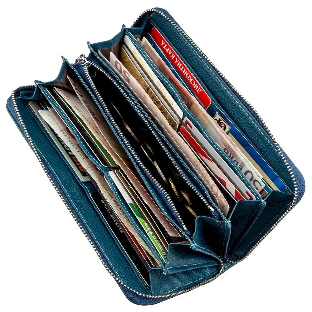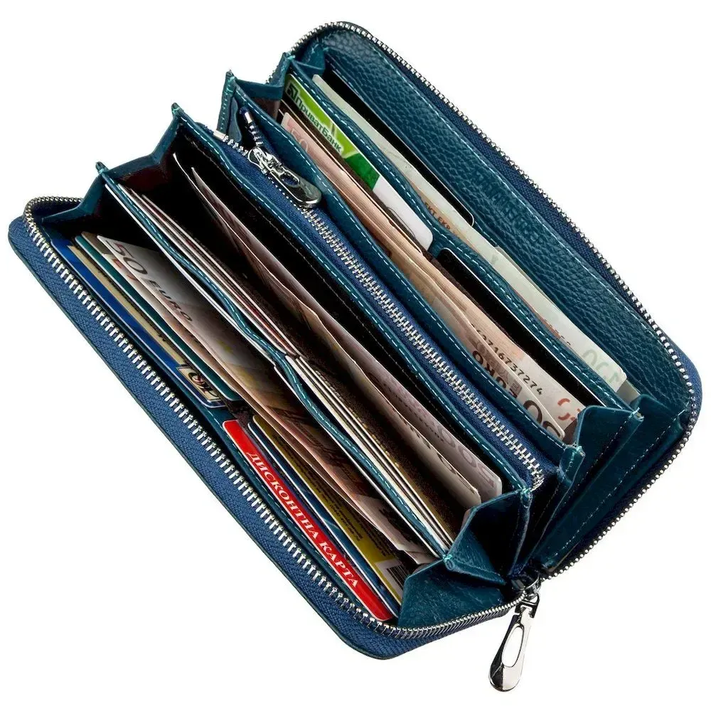 - закривається гаманець на блискавку. Чудовий багатофункціональний клатч для сучасних ділових жінок. Виконаний з натуральної високоякісної шкіри, ніжної та м'якої на дотик. Має стильний та модний дизайн, а особливий шарм надає гаманцю освіжаючий колір морської хвилі. Головною відмінною характеристикою є безліч кишень для різних карток і візиток, таких є аж тридцять шість штук. Тому клатч гордо можна називати також візитницею. Вас неодмінно порадують багато різних відділень для купюр та інших цінностей. Для швидкого доступу до дрібниці монетниця розташована на зовнішній стороні клатчу і закривається на блискавку. Запакований виріб у білу щільну картонну коробку з фірмовим логотипом.