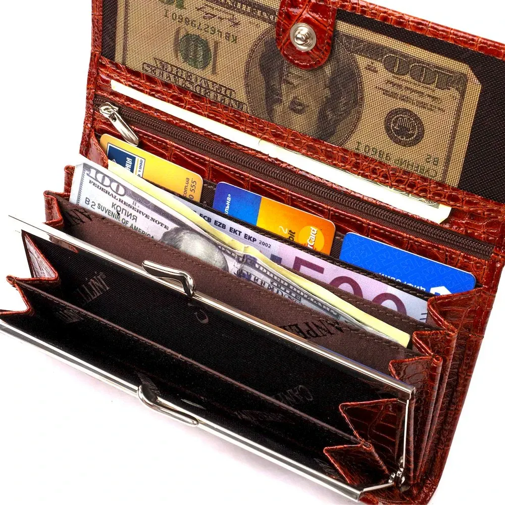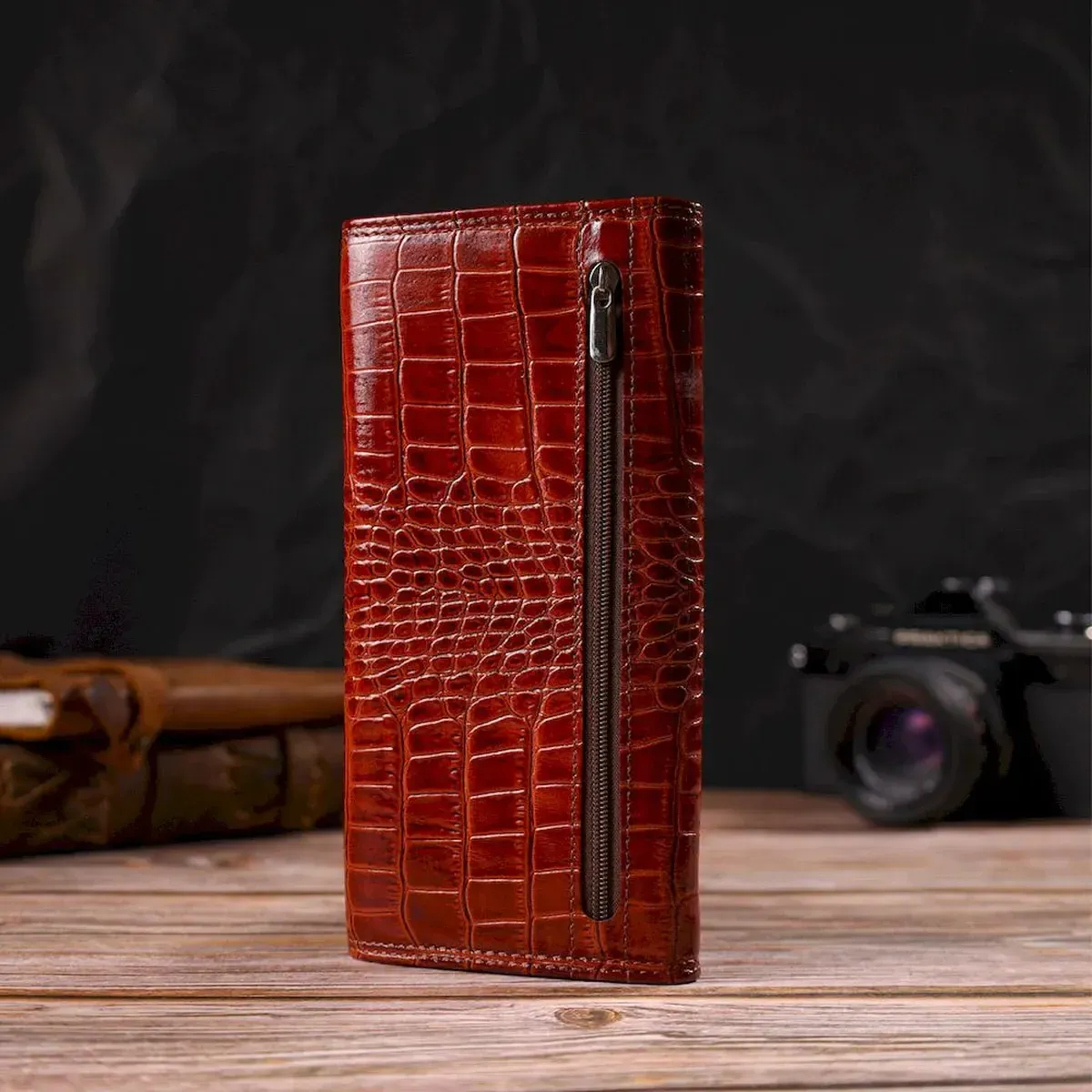Місткий жіночий портомон горизонтального типу з якісної натуральної шкіри, з тисненням під крокодила. Аксесуар має три широкі відділення для купюр, дві кишені на блискавці, кишеню для документів під сіточкою, одну прилеглу кишеню та монетницю. Закривається аксесуар наполовину клапаном на кнопку. Купуючи шкіряний аксесуар цієї фірми, собі або на подарунок, будьте певні, що він прослужить Вам не один рік.