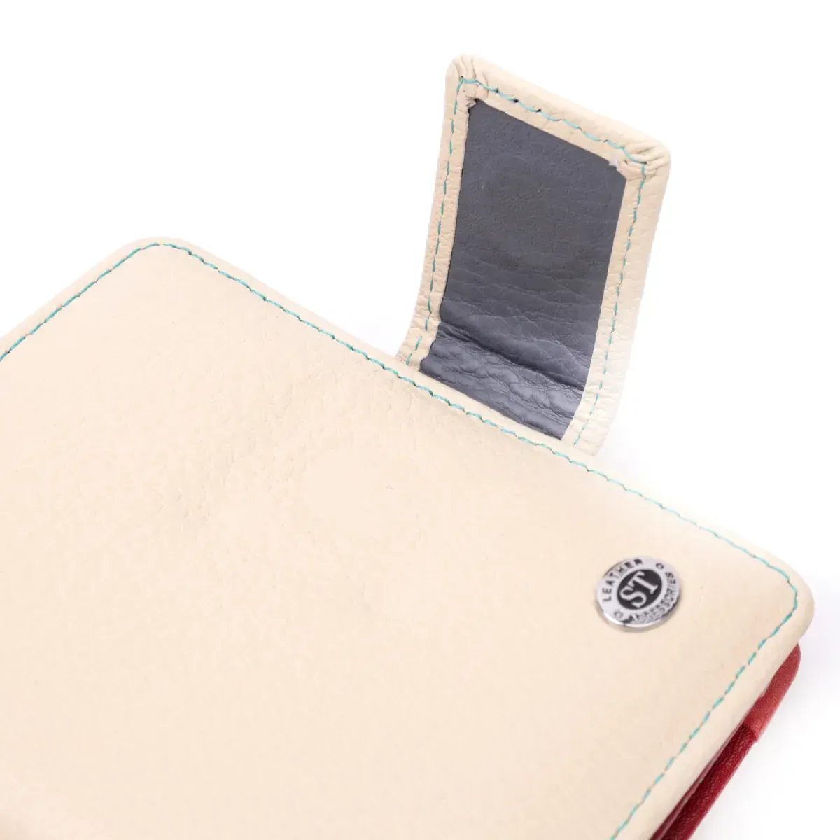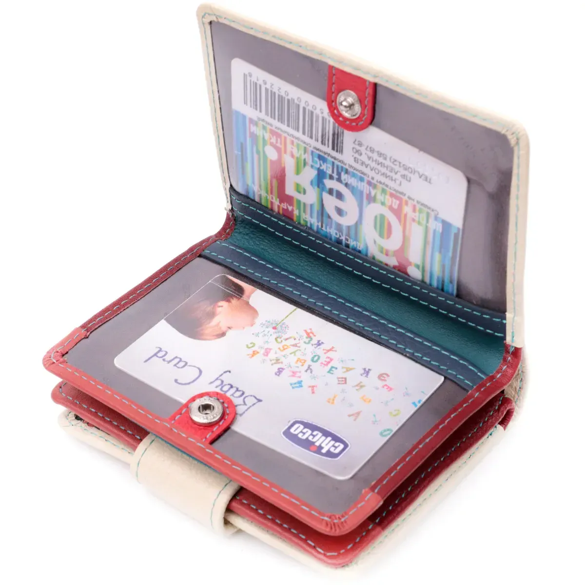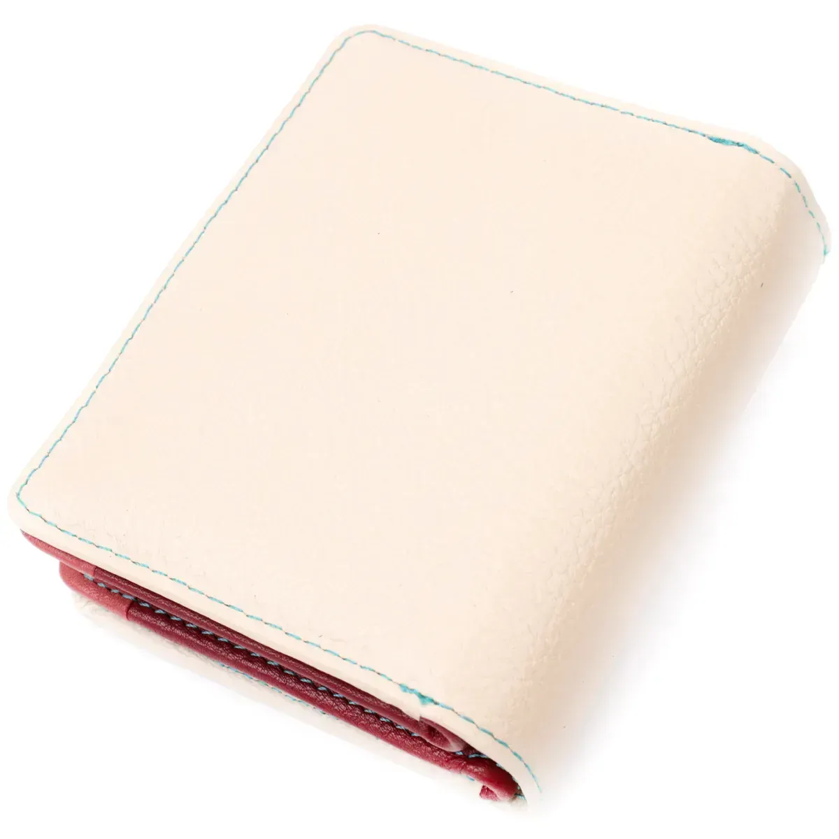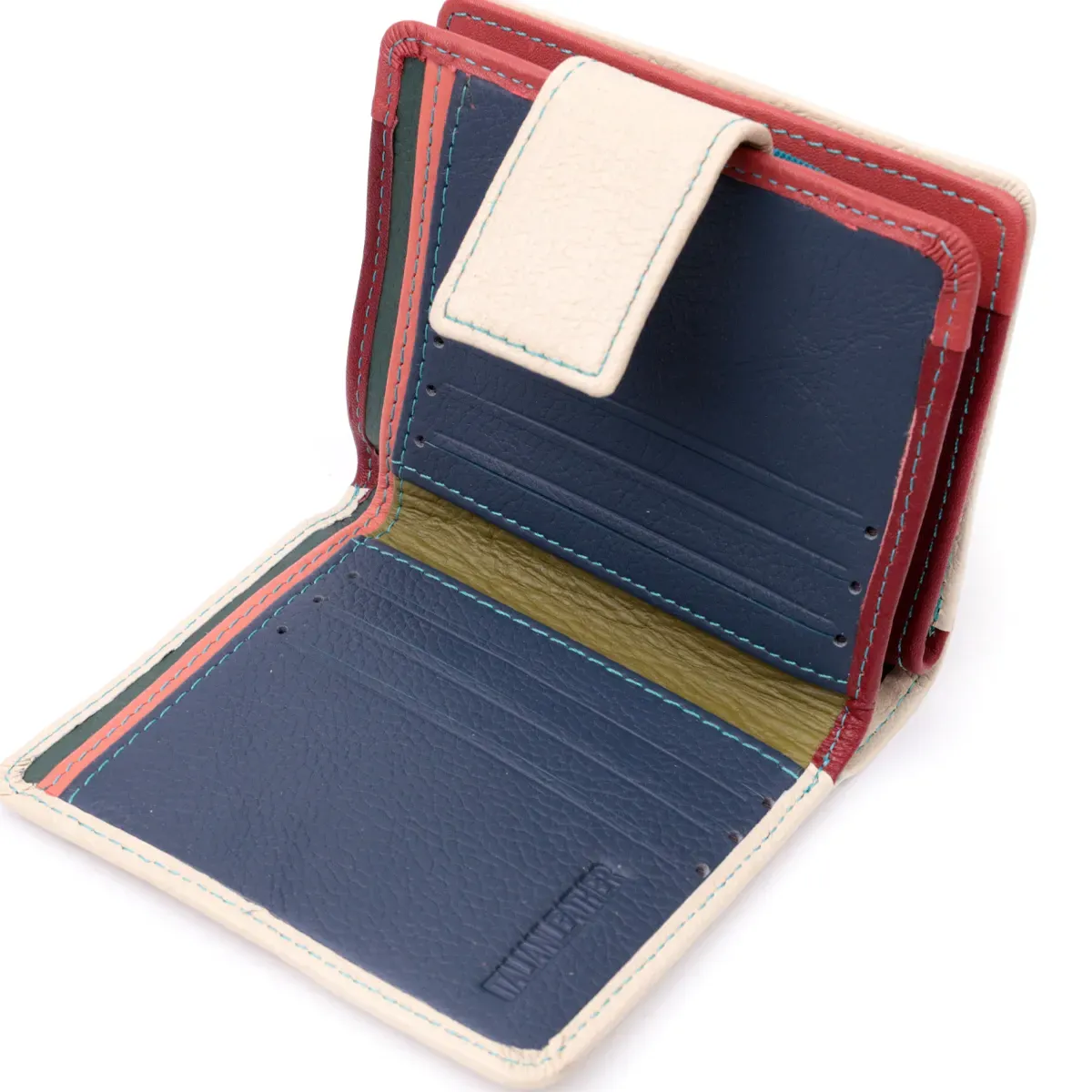 - 6 слотів для кредиток; - 2 кишеньки під плівкою; - закривається хлястиком на магніт. Гаманець кремово-білого кольору зовні та різнобарвний усередині, що дуже стильно та сучасно. Шкіряне портмоне дуже практичне і служить досить довго. Аксесуар складається з двох містких кишень для купюр, кишені на блискавці для монет, шести осередків для карт, двох прозорих віконців для перепусток або фотографій та двох прихованих кишень. Портмоне доповнено надійною фурнітурою і прошито по краю рівним рядком бірюзового кольору. Укомплектований гаманець у фірмову картонну коробку білого кольору. Виріб стане ідеальним подарунком для дівчини будь-якого віку.