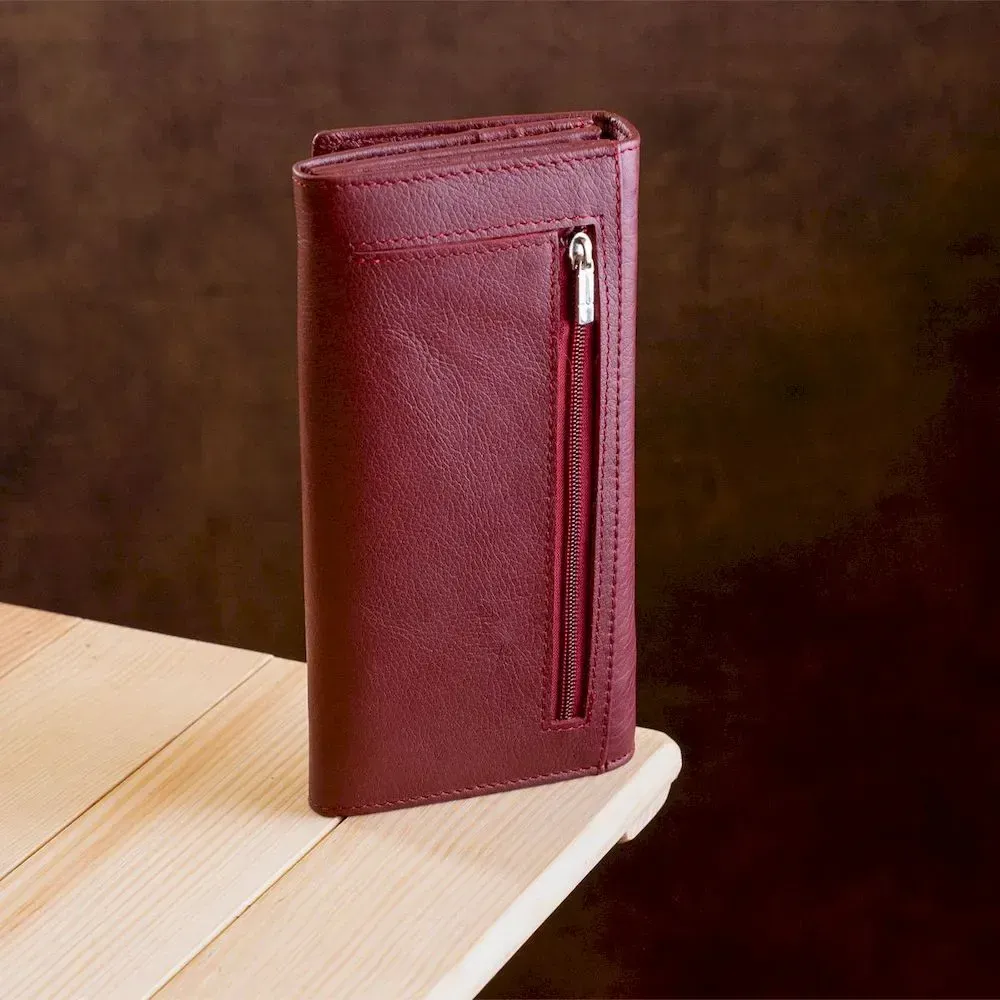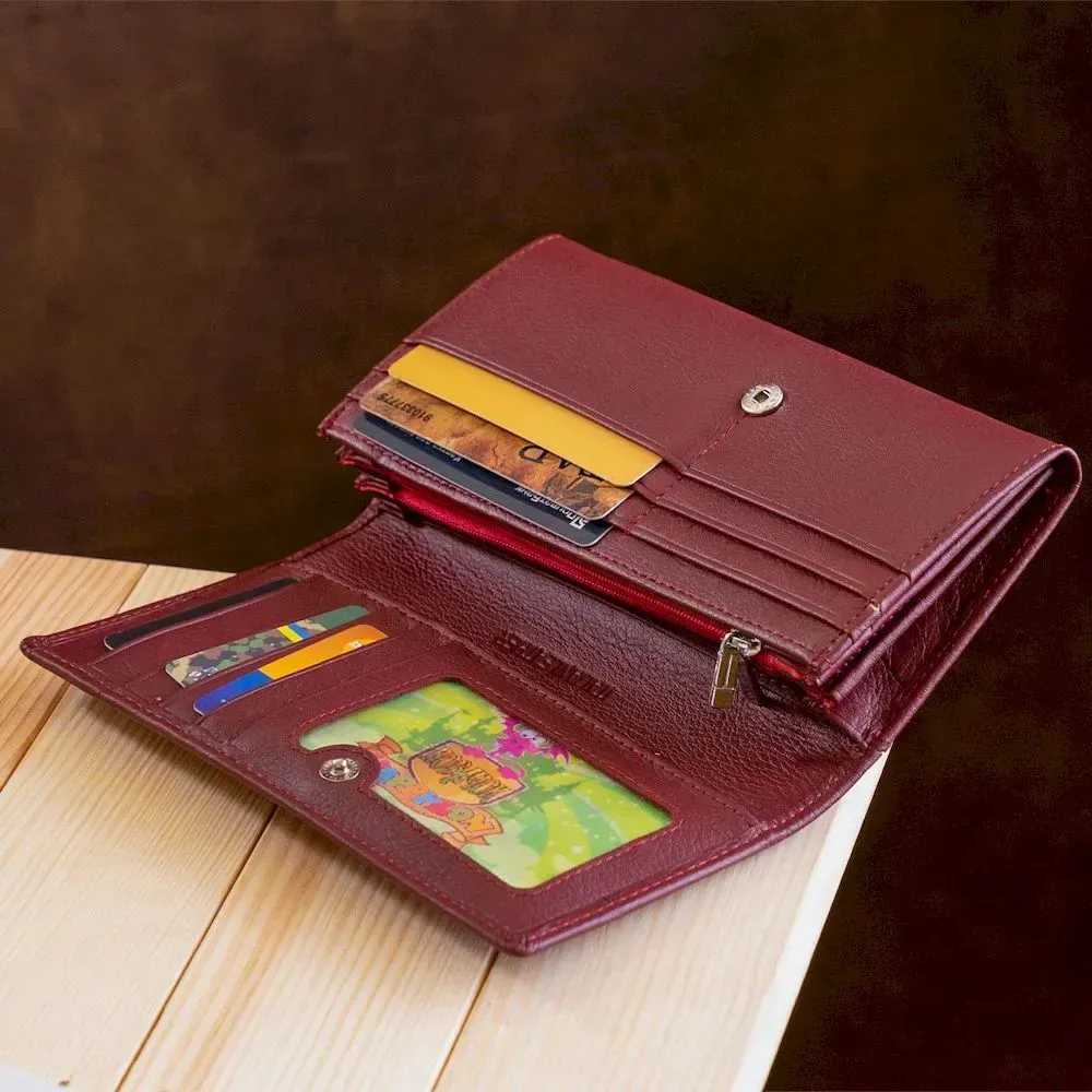 Гарний шкіряний гаманець для витонченої та безпосередньої жінки. Має красивий матовий темно-червоний колір із нотками бордового. Дуже місткий та функціональний, багато різних відділень для купюр, карток, документів та інших цінностей. Монетниця на блискавці розташована на тильній стороні гаманця, що дуже зручно, оскільки є швидкий доступ до дрібниць. Дизайн аксесуару не залишить нікого байдужим. Такий гаманець стане чудовим подарунком на будь-яке свято коханій жінці або колегі по роботі. Запаковано виріб у картонну білу коробку з фірмовим логотипом.