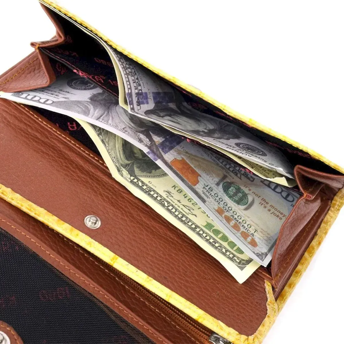 Гарний жовтий зовні і коричневий всередині, жіночий гаманець, з натуральної шкіри з тисненням під крокодила. Усередині є відділення для купюр та осередки для кредитних карток. У виробі використано якісну фурнітуру, а також міцну фірмову підкладку. Модель закривається на клапан з кнопкою. Такий гаманець, однозначно, порадує будь-яку жінку.