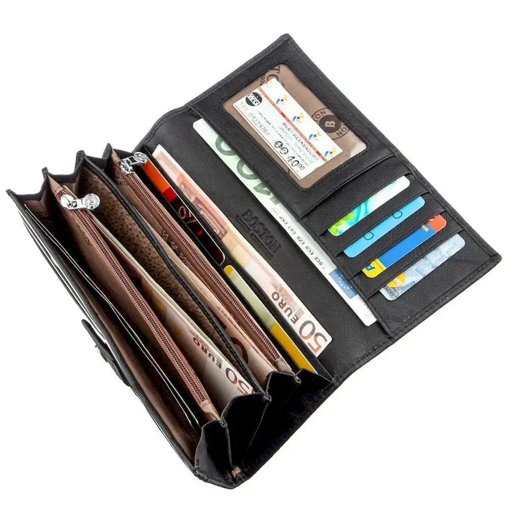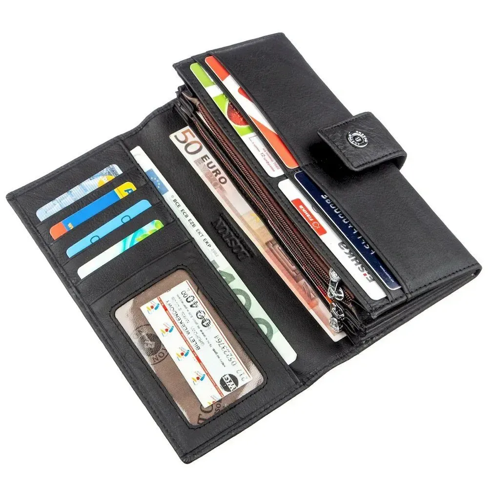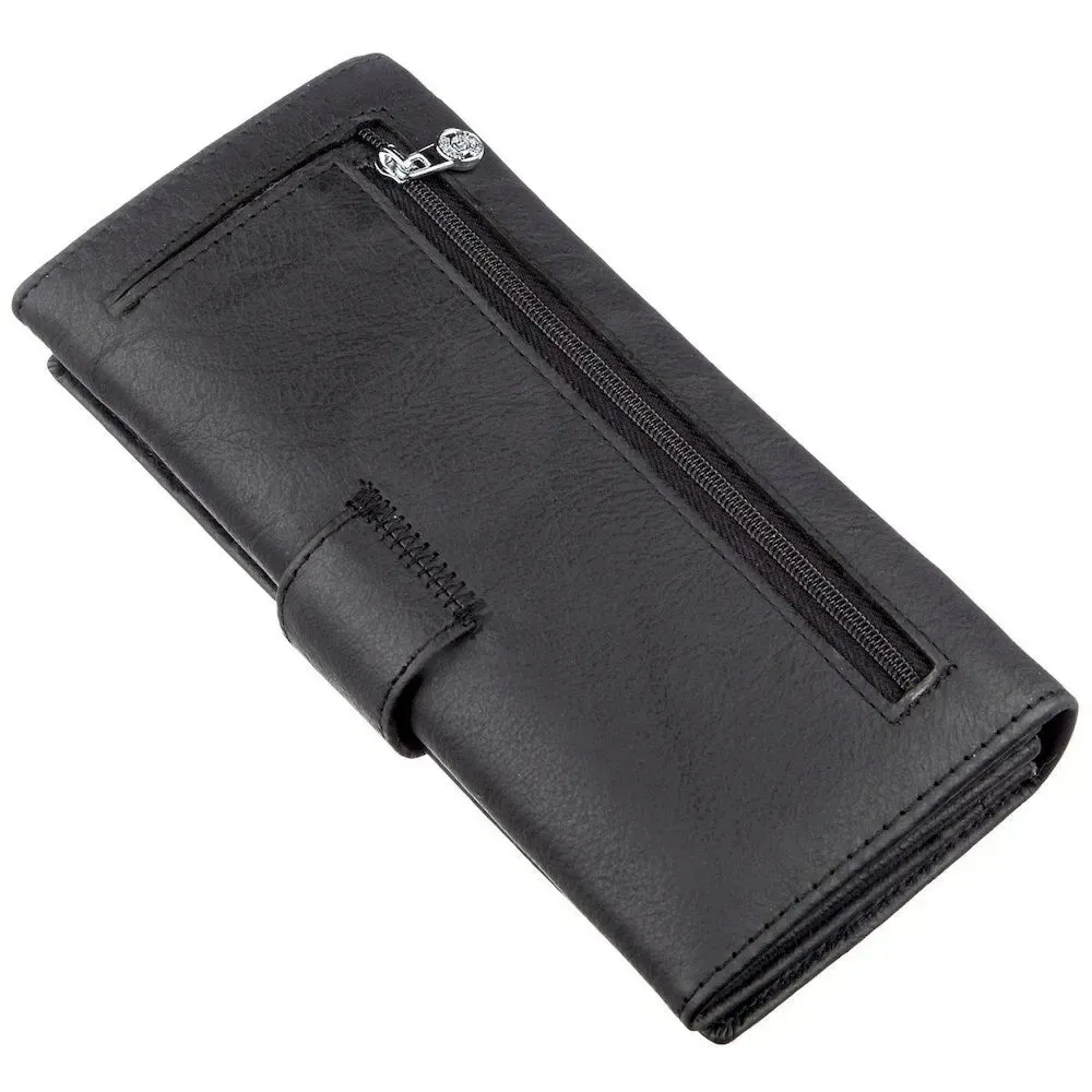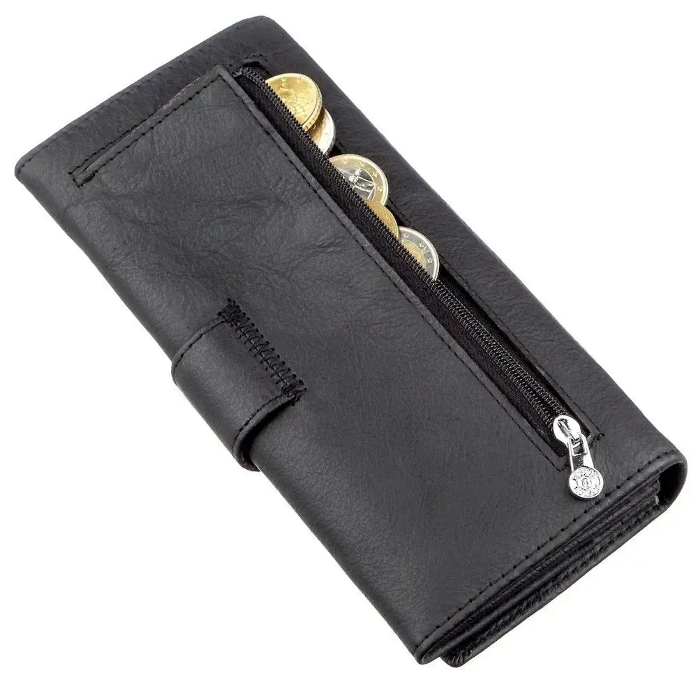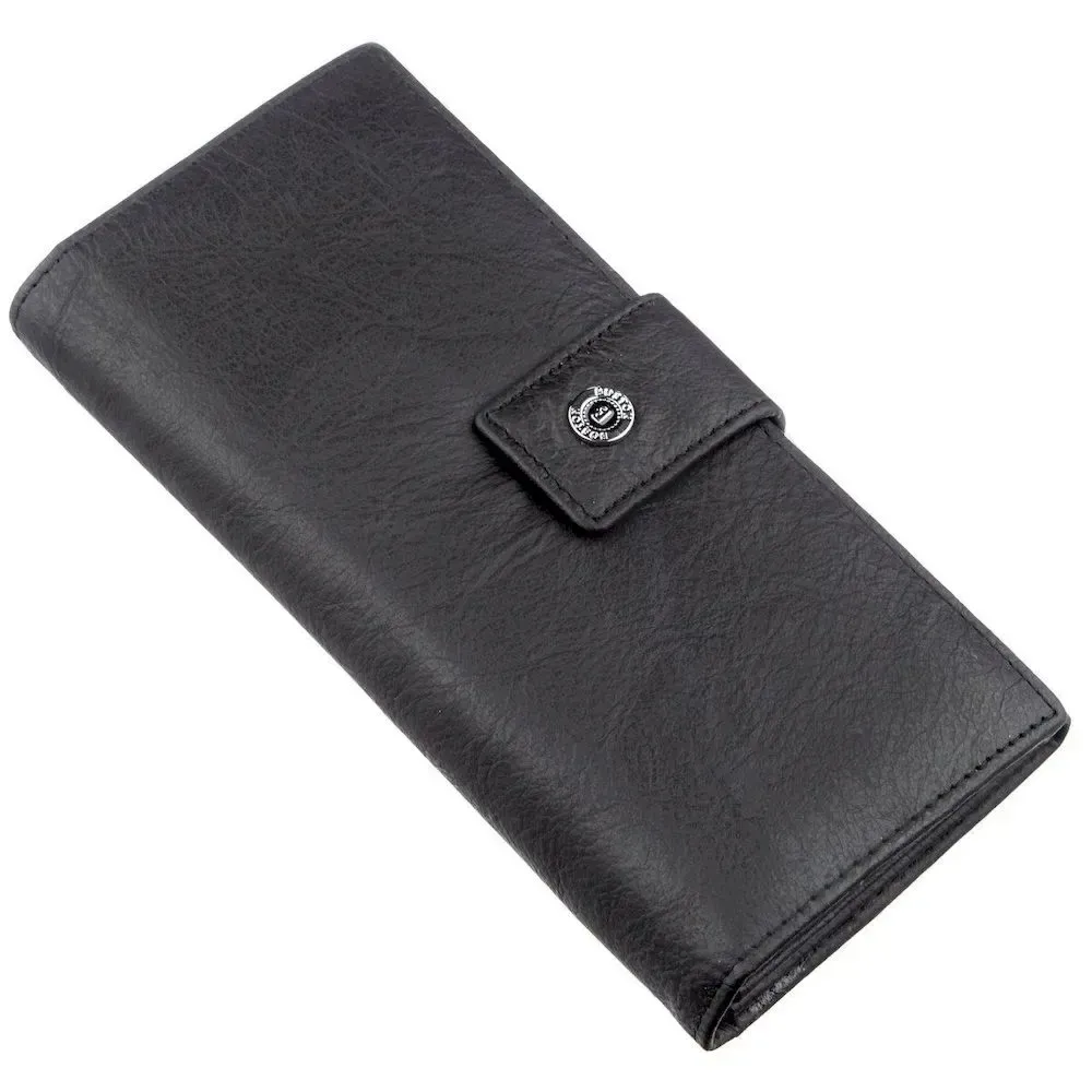 Шикарний жіночий гаманець із висококласної натуральної шкіри, яка порадує Вас своєю м'якою та ніжною фактурою. Колір цього гаманця – чорний, який чудово підійде для прагматичних та ділових жінок будь-якого віку. Цей аксесуар має чотири великі відділення для купюр і документів, відділення на блискавці для різних цінностей, кишені для кредитних та візитних карток, а також на тильній стороні є відділення для монет або інших дрібниць, які вимагають швидкого доступу до них. Закривається гаманець на зручну та практичну кнопку. Запакований виріб у білу щільну картонну коробку з фірмовим логотипом.