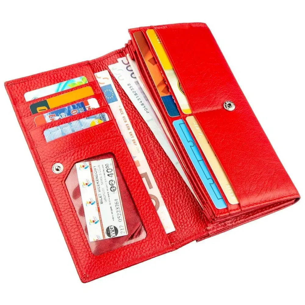 Ефектний жіночий гаманець для яскравих та впевнених у собі жінок. Має красивий та стильний дизайн для сучасних дам. Матеріал виготовлення – відмінна натуральна шкіра з високими показниками якості та зносостійкості. Особливістю гаманця звичайно є його експресивний червоний колір, що запам'ятовується. Усередині виробу розташовані місткі відділення для купюр та банкнот, для необ'ємних документів, для різних кредитних та візитних карток. Монетниця знаходиться на тильній стороні і закривається на масивну металеву клямку в золотому кольорі. Упаковано виріб у щільну картонну коробку білого кольору з логотипом виробника.
