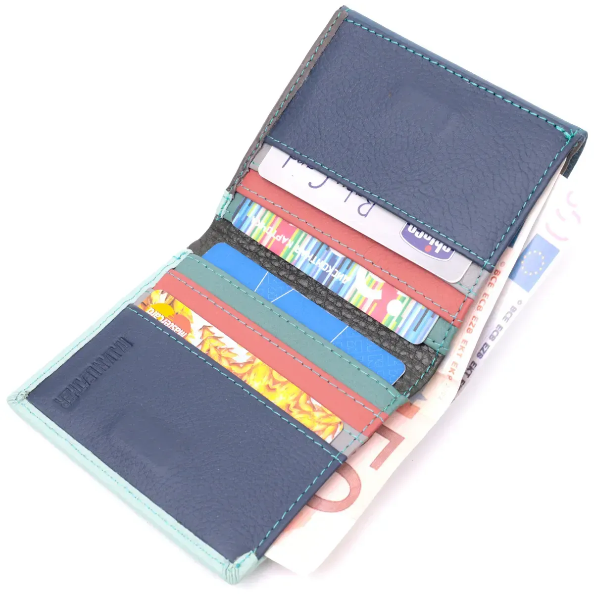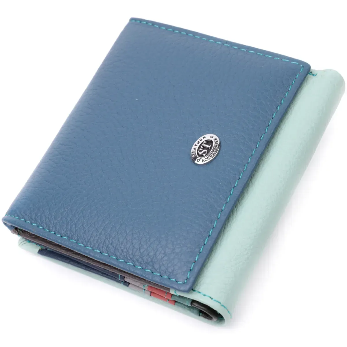 Жіноче ідеальне портмоне в два складення з натуральної шкіри найвищої якості. Фішкою цього гаманця є його багатобарвна гама, такий аксесуар одразу впадає у вічі, складається він з двох містких відділень для купюр, шести осередків для карт, двох прихованих кишень та кишені для монет. Зовні виріб прошитий рівним рядком бірюзового кольору по краю і прикрашений металевим логотипом компанії виробника. Портмоне доповнено надійною фурнітурою та міцною підкладкою. Укомплектований гаманець у фірмову картонну коробку білого кольору.