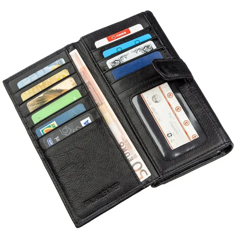 Чудовий жіночий гаманець з натуральної шкіри найвищої якості, яка прослужить Вам довгий час. Має м'яку і ніжну на дотик зернисту фактуру. Колір виробу – чорний, який за загальним визнанням є найпрактичнішим. Усередині гаманця розташовані три основні відділення, монетниця на металевій клямці, прозора кишеня для фото та відділення для карт. На тильній стороні – візитниця на одинадцять кишень та потайне велике відділення. Закривається візитниця на кнопку, яку можна регулювати за довжиною. При покупці цей аксесуар упакований у картонну фірмову коробку.