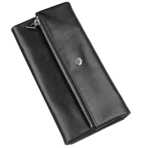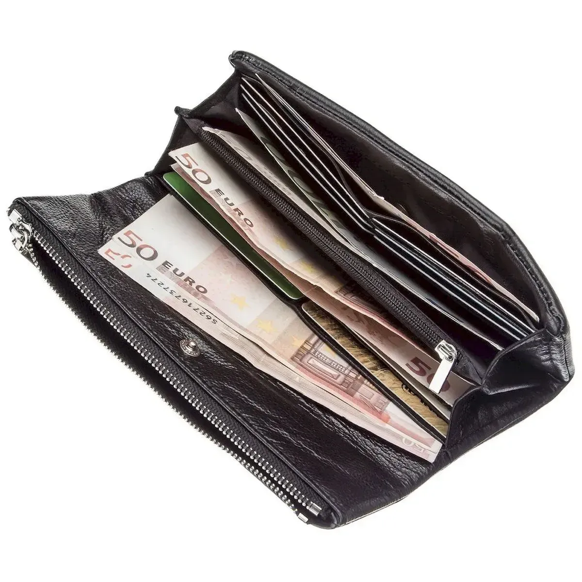 Стильний жіночий гаманець-клатч з натуральної шкіри, яка м'яка і приємна на дотик має матову поверхню. Виконаний гаманець у класичному чорному кольорі. Підійде для жінок з відмінним почуттям стилю і прекрасним смаком. Даний виріб досить практичний і вміщує багато потрібних цінностей. Також у гаманці є зручне зовнішнє відділення на замку для дрібниць, які мають бути легкодоступними. Повірте, такий гаманець-клатч мріє мати кожна жінка, тож якщо Ви вибираєте подарунок, то це чудовий варіант. Купуючи гаманець, він буде упакований у фірмову картонну коробку білого кольору.