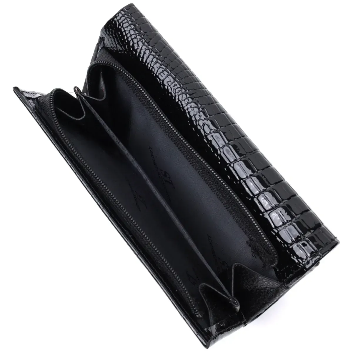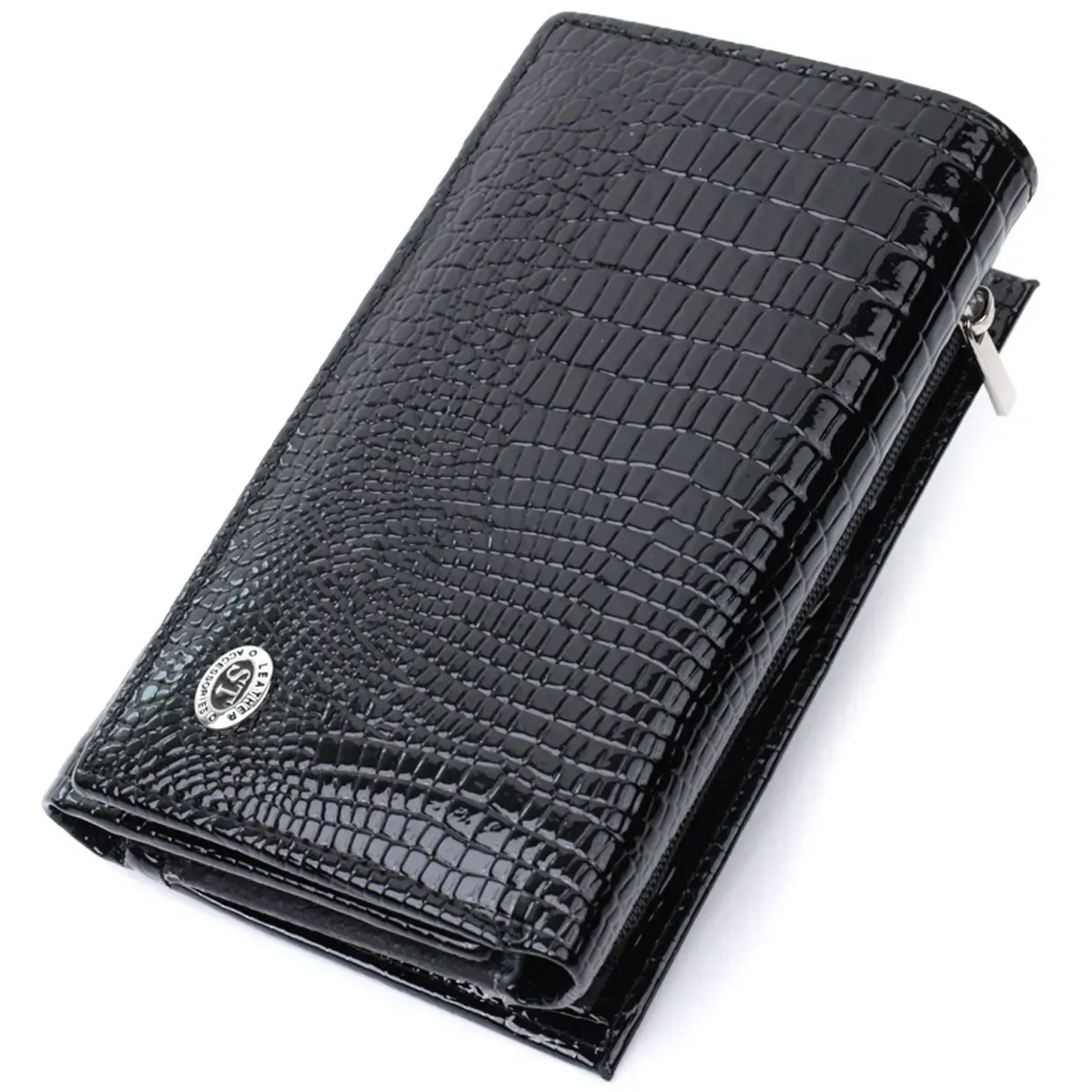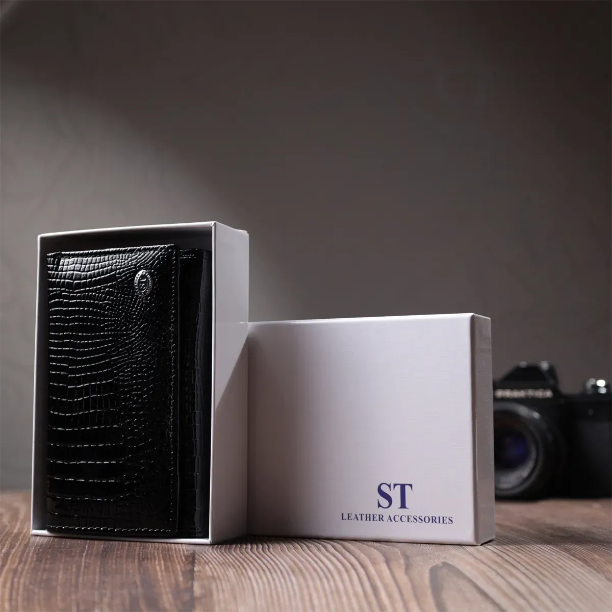 Жіночий гаманець у три складання з лакованої фактурної натуральної шкіри ST Leather 22707 Чорний