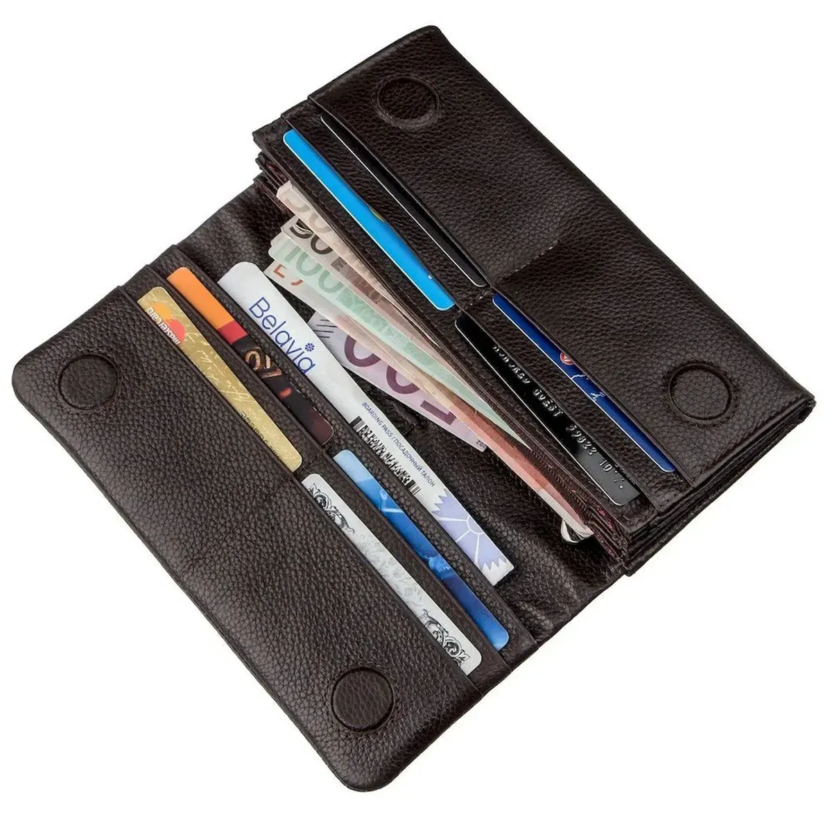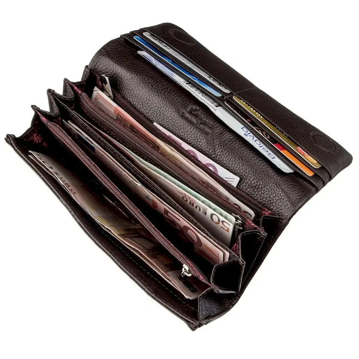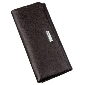 Суворий коричневий жіночий та дуже місткий гаманець турецького виробництва. Виріб виготовлений виключно з натуральної шкіри найвищої якості. Закривається гаманець на два магніти. На лицьовій стороні аксесуара металевий логотип бренду. На тильній стороні є кишеня на блискавці для необхідних дрібниць. По краях аксесуар прошитий коричневою ниткою. Усередині – поєднання шкіри та міцного текстилю. Якщо ви любите красиво розкладати гроші та цінуєте порядок – рекомендуємо вам цю модель. Аксесуар буде чудовим подарунком для будь-якої дівчини. У комплекті йде фірмова картонна коробка.