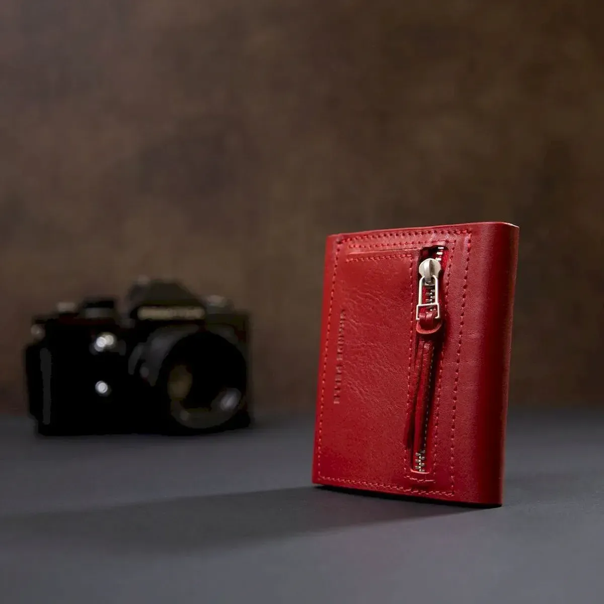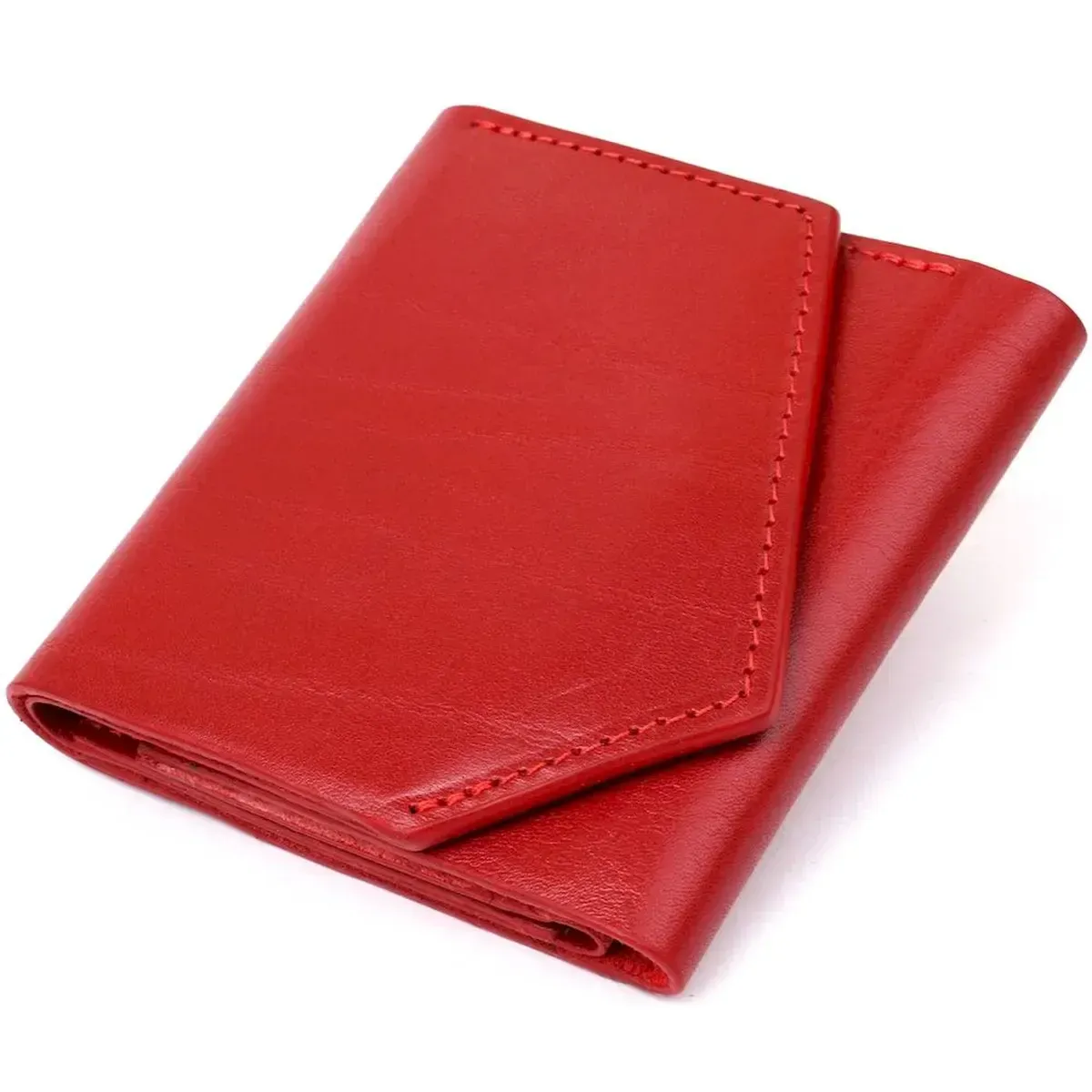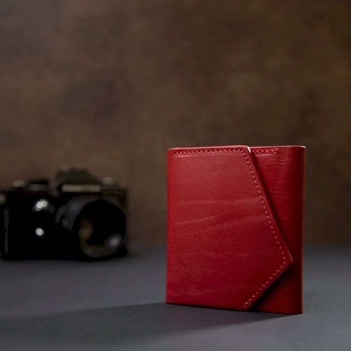 Красивий жіночий гаманець з оригінальним скошеним клапаном на магніті. Всередині має просторе відділення на всю довжину для купюр, слоти для пластикових карток і доступну монетницю на блискавці на зовнішній стороні. Матеріал виготовлення – Натуральна шкіра високого класу. Колір виробу – соковитий червоний.