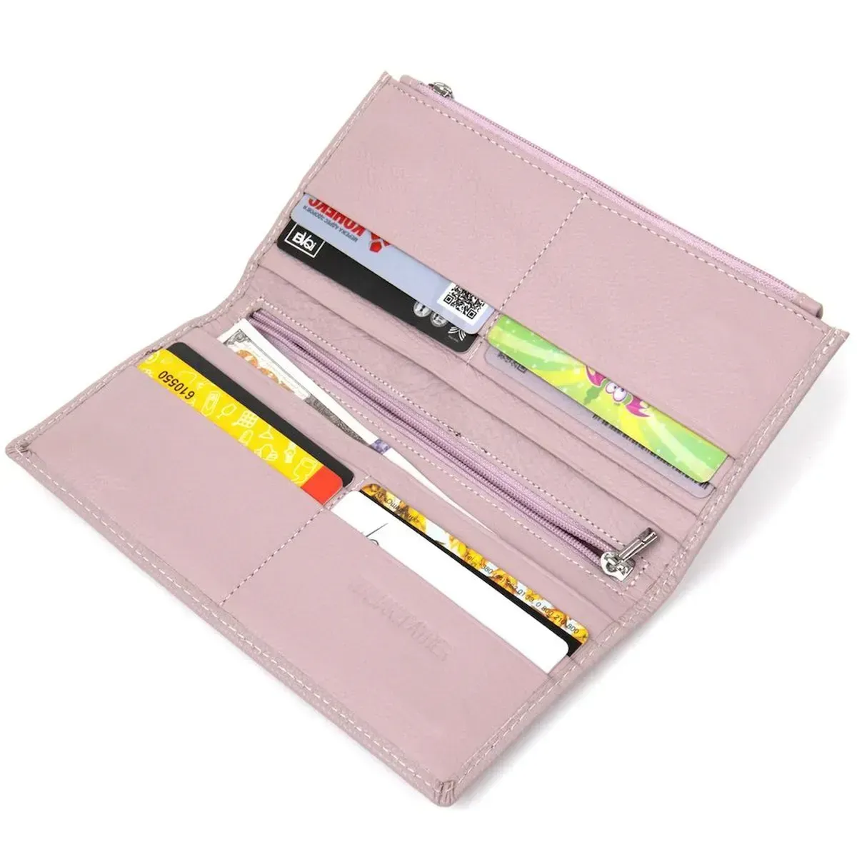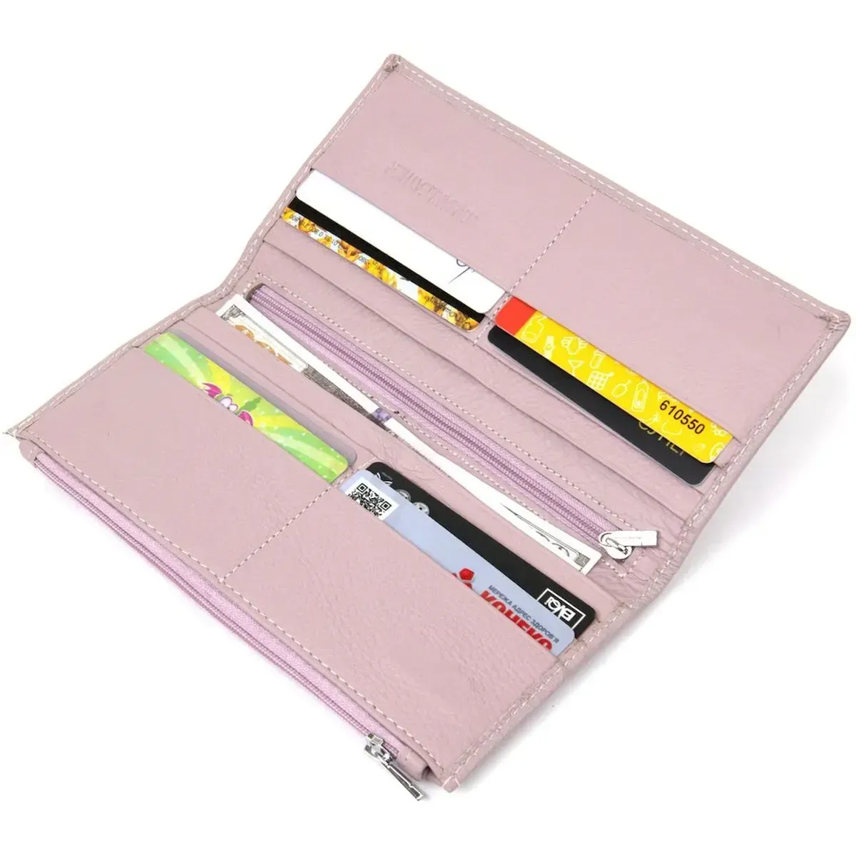 Всім, хто шукає гарний і функціональний жіночий гаманець благородного блідо-лілового кольору, необхідно звернути свою увагу на цю модель. Цей шкіряний виріб має достатню кількість відділень для купюр та карток, а також монетницю на блискавці на тильній стороні, що дуже зручно. Гаманець упакований у фірмову тверду білу коробку, тому стане не лише чудовим придбанням для вас, а й гарним подарунком для близької людини.