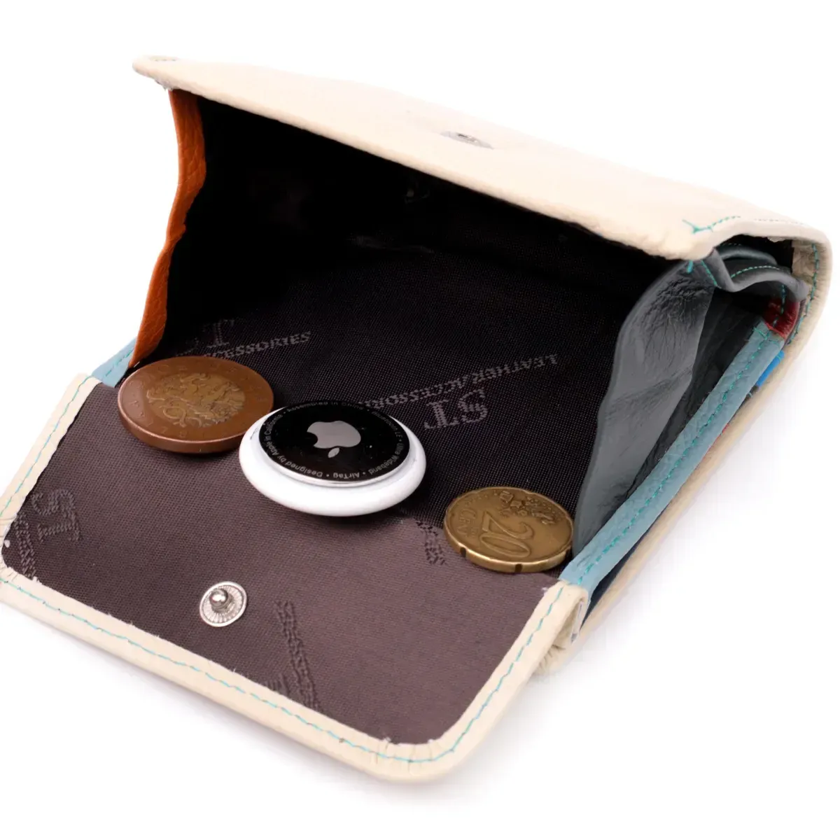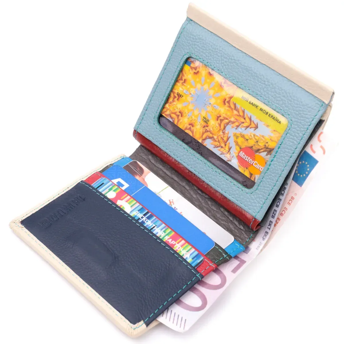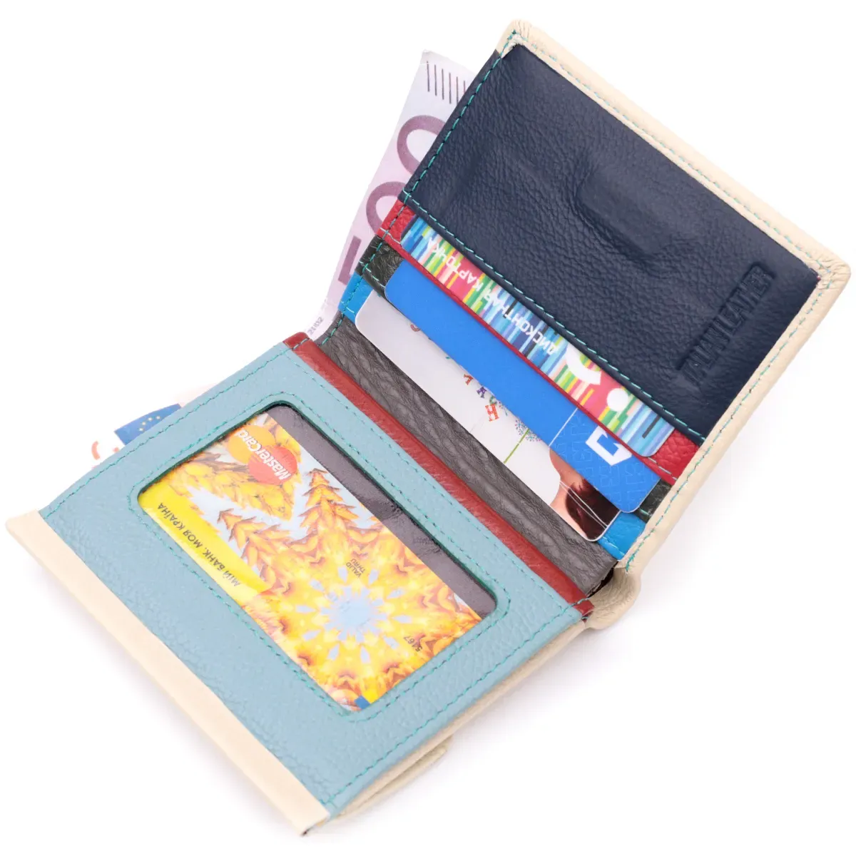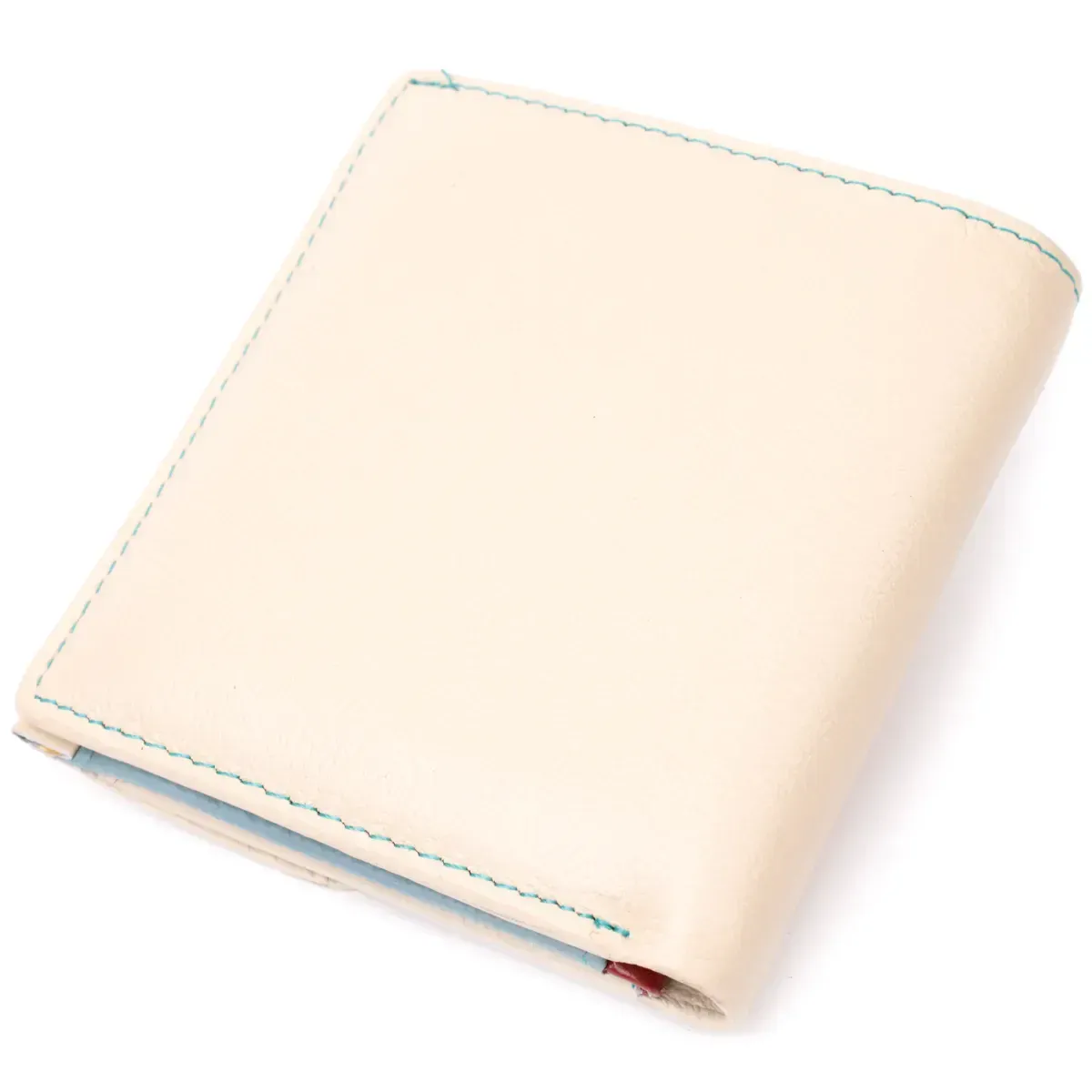 Стильний кольоровий портмоне для жінок середнього розміру з натуральної шкіри найвищого якості. Акцентом цього гаманця є колір, точніше кілька кольорів – він кремово-білого кольору зовні та багатобарвний усередині. Аксесуар складається з двох містких відділень для купюр, кишені на блискавці, чотирьох осередків для карт, прихованої кишені, прозорої кишені та кишені для монет. Зовні виріб прошитий рівним рядком бірюзового кольору по краю і прикрашений металевим логотипом компанії виробника, який розміщений вгорі посередині. Портмоне доповнено надійною фурнітурою та міцною підкладкою. Укомплектований гаманець у фірмову картонну коробку білого кольору.