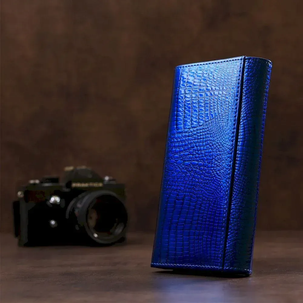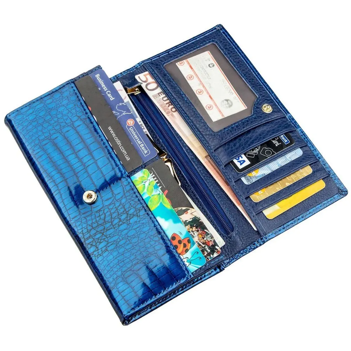 Вишуканий жіночий гаманець у класичному стилі для жінок будь-якого віку. Зроблений аксесуар з натуральної першосортної шкіри, яка м'яка та гладка на дотик, а також покрита лаком. Тому виглядає виріб дуже красиво та фешенебельно. Колір гаманця – насичено синій із блакитним відливом. Наповнення гаманця теж можна сказати – класичне. Це відділення для купюр та банкнот, для необ'ємних документів, відділення для монет та іншої дрібниці, а також кишені для візитних та кредитних карток. Динний аксесуар неодмінно стане чудовим подарунком не тільки самій собі, але й для іншої близької людини, особливо якщо є привід. Упаковка представлена у вигляді щільної фірмової картонної коробки.