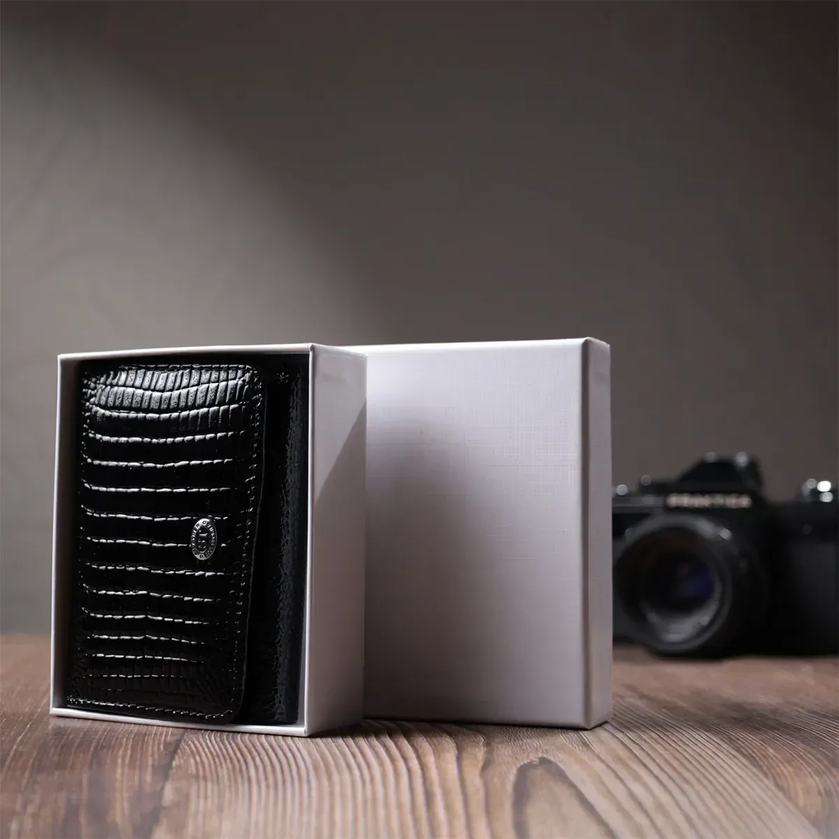 Жіночий гаманець з натуральної лакованої шкіри, з тисненням під рептилію. Модель має зручний розмір та закривається на магніт. Зовні можна побачити відділення монет, яке закривається клапаном на магніт. Аксесуар всередині оснащений двома відділеннями для купюр та вісьмома осередками для карт. Запакований аксесуар у білу щільну картонну коробку з фірмовим логотипом.