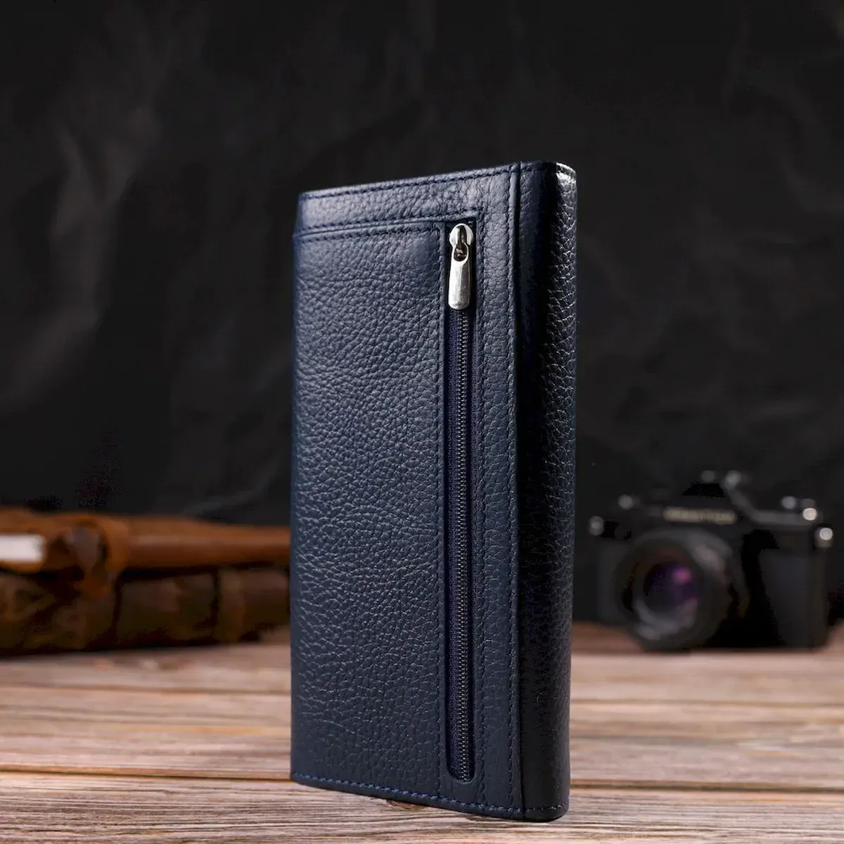 Відмінний жіночий гаманець, з натуральної зернистої шкіри. Аксесуар має три основні відділення, в які поміщаються купюри всіх номіналів, дві перегородки на блискавках, чотири кишені для карток, дві прилеглі кишені, глибока кишеня на всю довжину та монетницю. Закривається аксесуар клапаном на кнопку. Відмінний аксесуар, надійний виробник, який прослужить дуже довго.