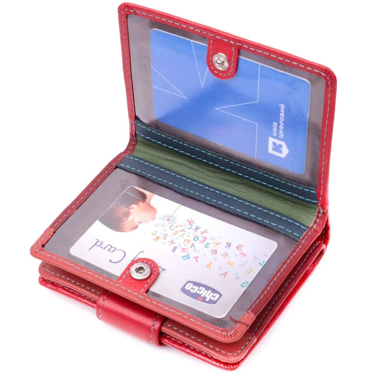 Яскраве портмоне в два складення компактного розміру з натуральної шкіри найвищої якості. Гаманець червоного кольору зовні та різнобарвний усередині, що дуже стильно та сучасно. Шкіряне портмоне дуже практичне і служить досить довго. Аксесуар складається з двох містких кишень для купюр, кишені на блискавці для монет, шести осередків для карт, двох прозорих віконців для перепусток або фотографій та двох прихованих кишень. Портмоне доповнено надійною фурнітурою і прошито по краю рівним рядком бірюзового кольору. Укомплектований гаманець у фірмову картонну коробку білого кольору. Виріб стане ідеальним подарунком для дівчини будь-якого віку.