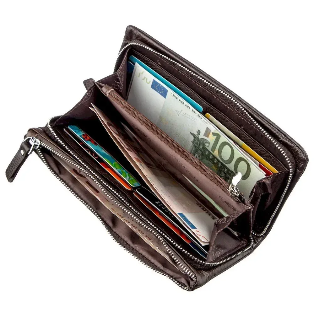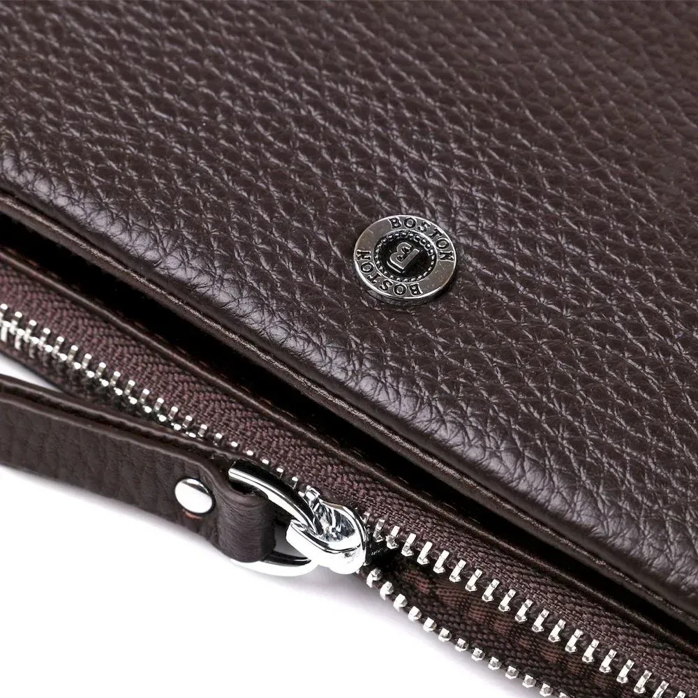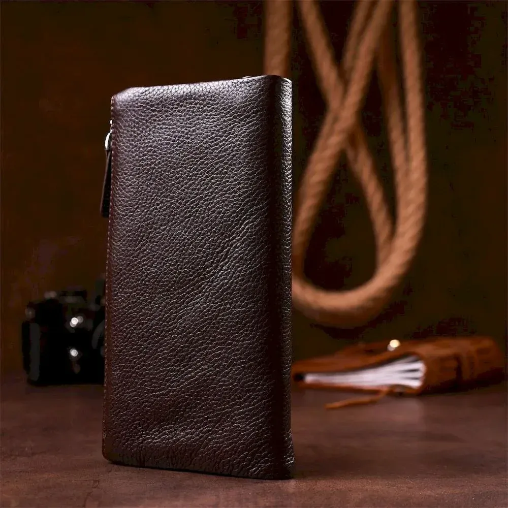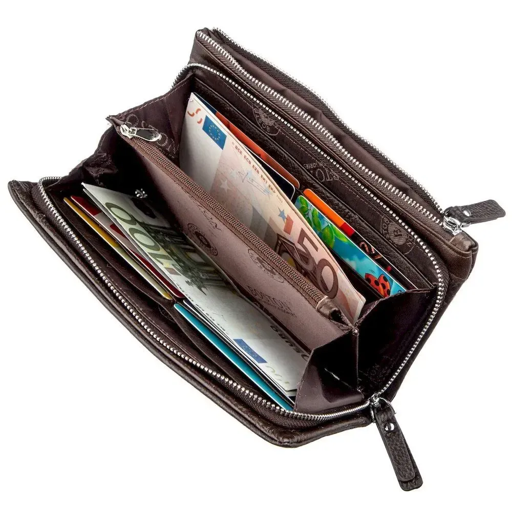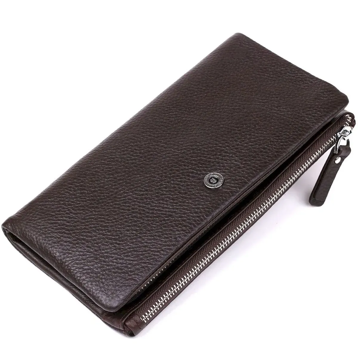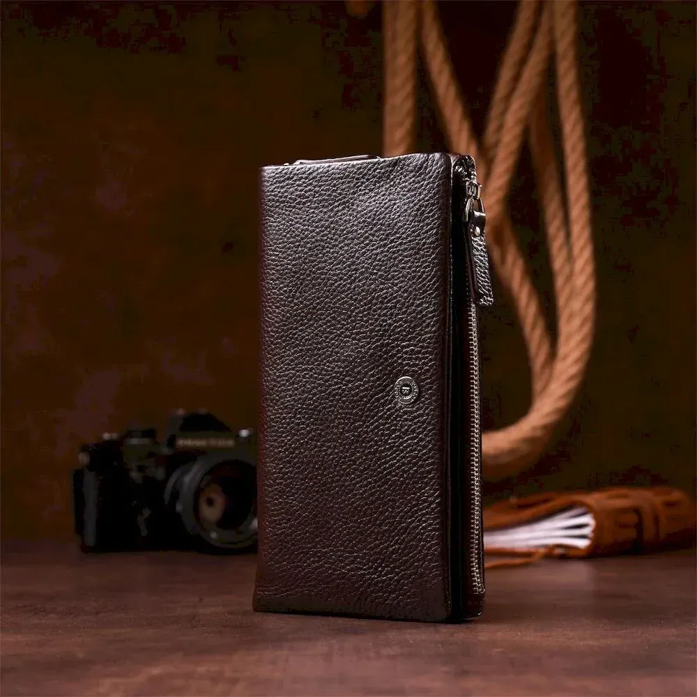 Чудовий жіночий гаманець-клатч у класичному строгому стилі. Матеріал виготовлення – високоякісна натуральна шкіра з відмінними експлуатаційними характеристиками та властивостями. Шкіра дуже м'яка і приємна на дотик, зерниста фактура. Колір виробу – насичено коричневий, що надає йому особливого шарму. Наповнення гаманця представлене зручними та місткими відділеннями для купюр, карток та монет. Слід зазначити, що монетниця розташована як автономне відділення та закривається на масивну металеву блискавку. Запакований аксесуар у щільну картонну коробку білого кольору з логотипом виробника.