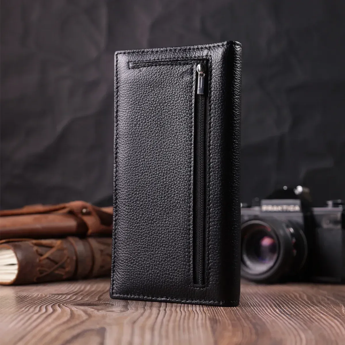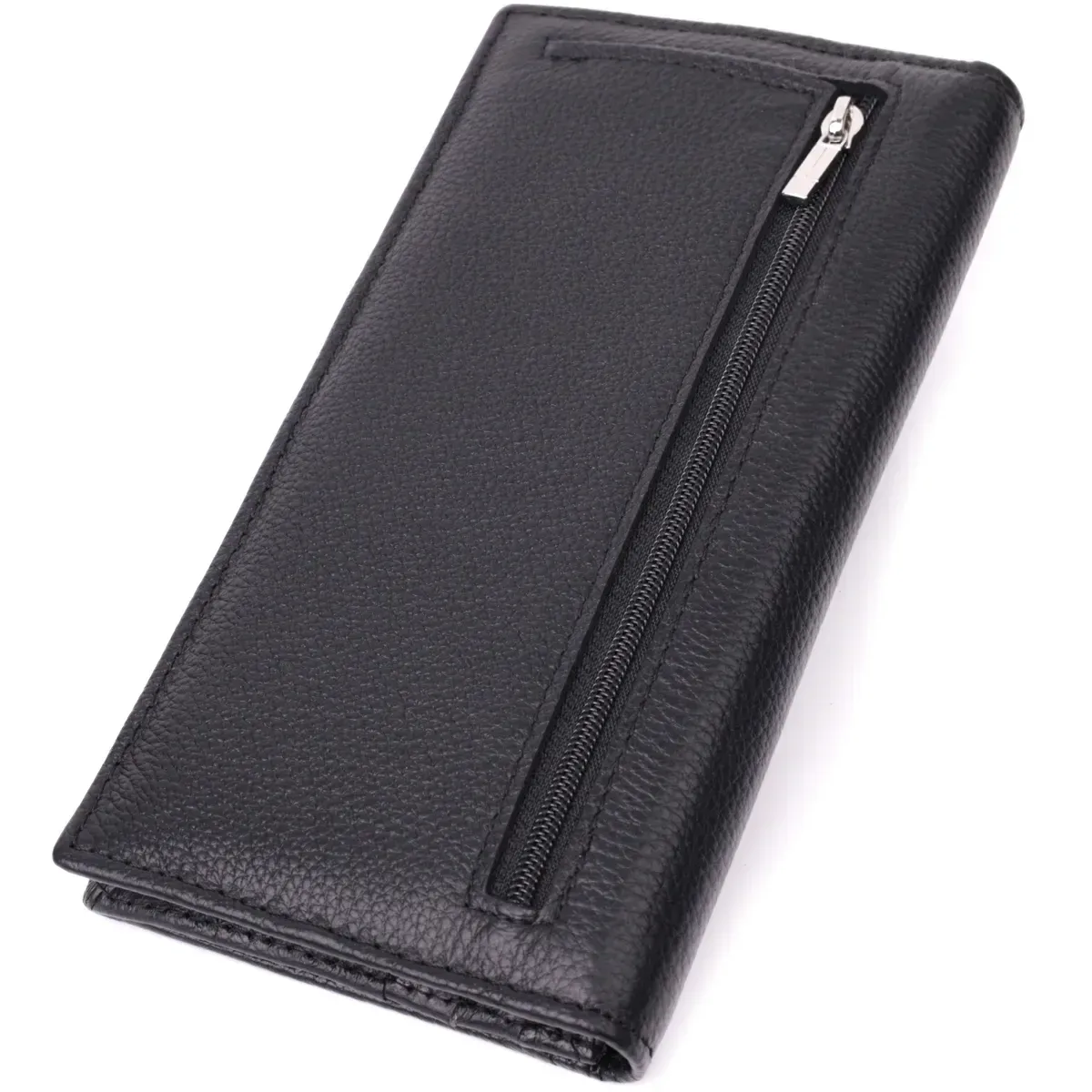 Стильний жіночий гаманець вертикального формату з натуральної добротної шкіри з металевим логотипом виробника в правому нижньому кутку. Аксесуар складається з двох відділень для купюр, кишені на блискавці всередині, одинадцяти осередків для пластикових карток, двох прихованих кишень, однієї кишені під плівкою та монетниці, зовні. З таким гаманцем Ви проходите не один рік. Модель упакована в коробочку, що дуже зручно, якщо виріб призначений для подарунка.