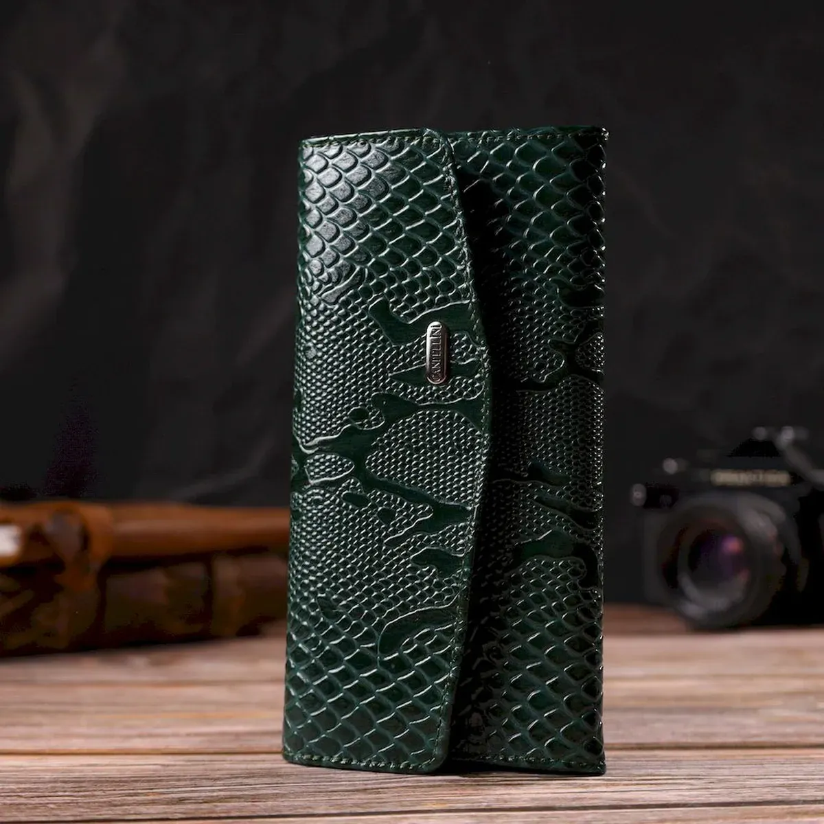 Локований жіночий гаманець горизонтального типу з якісної натуральної шкіри, з тисненням під рептилію. Аксесуар має одне основне відділення, шість кишень для карток, чотири прилеглі кишені та монетницю. Закривається аксесуар наполовину клапаном на кнопку. Купуючи шкіряний аксесуар цієї фірми, собі або на подарунок, будьте певні, що він прослужить Вам не один рік.