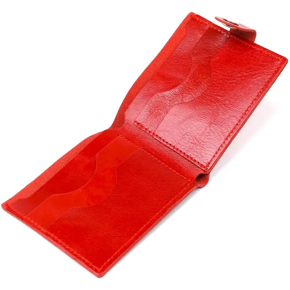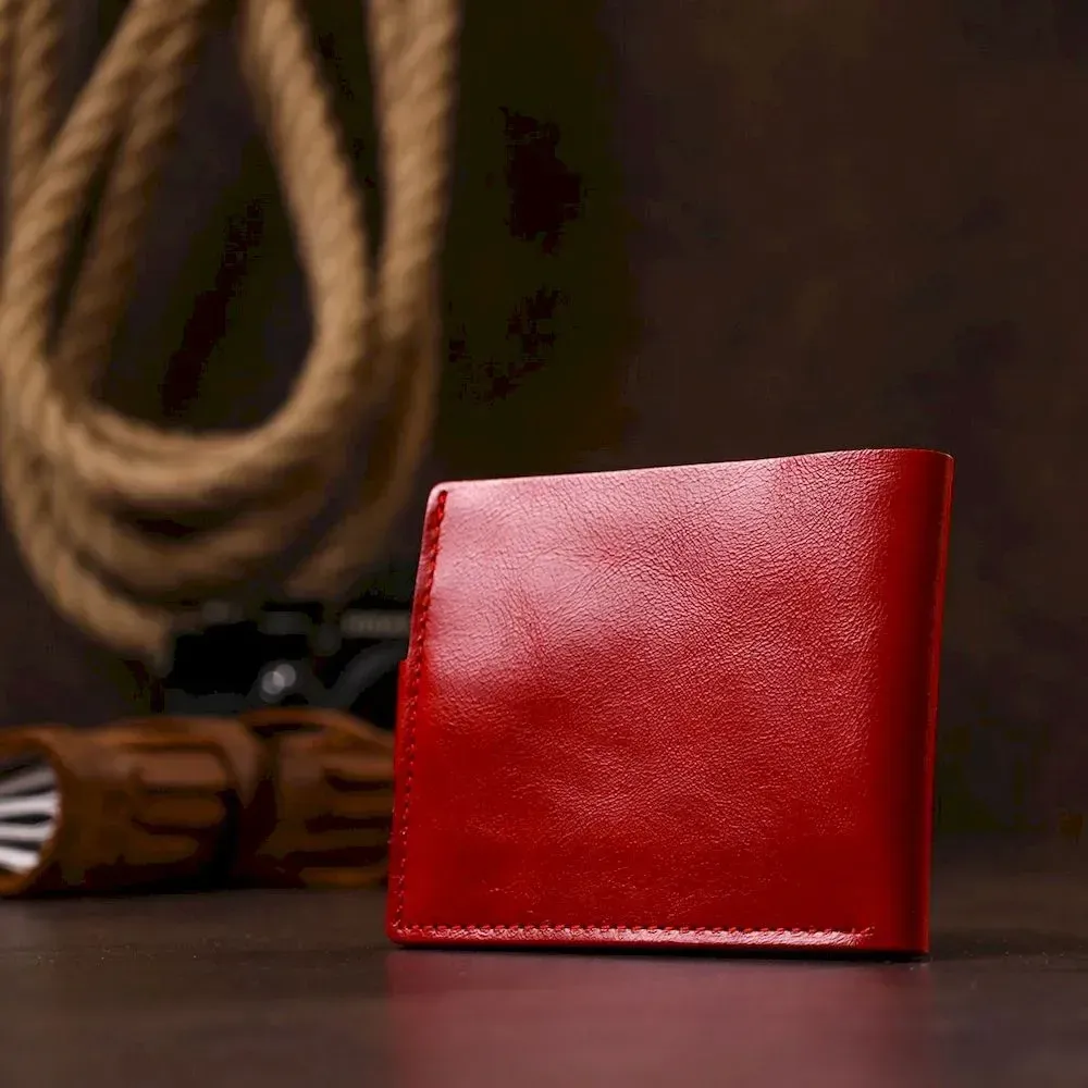 Компактне жіноче портмоне з натуральної висококласної шкіри від українського виробника. Колір виробу – насичений червоний, фактура – гладка. Всередині є просторе відокремлення на всю довжину для купюр і банкнот, кілька слотів для пластикових кредитних та візитних карток. Закривається аксесуар на шкіряний хлястик із кнопкою.