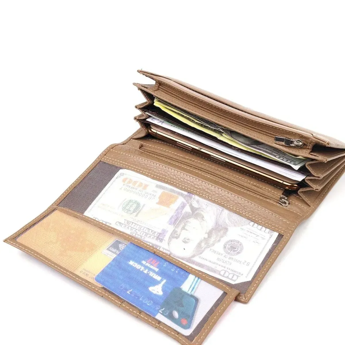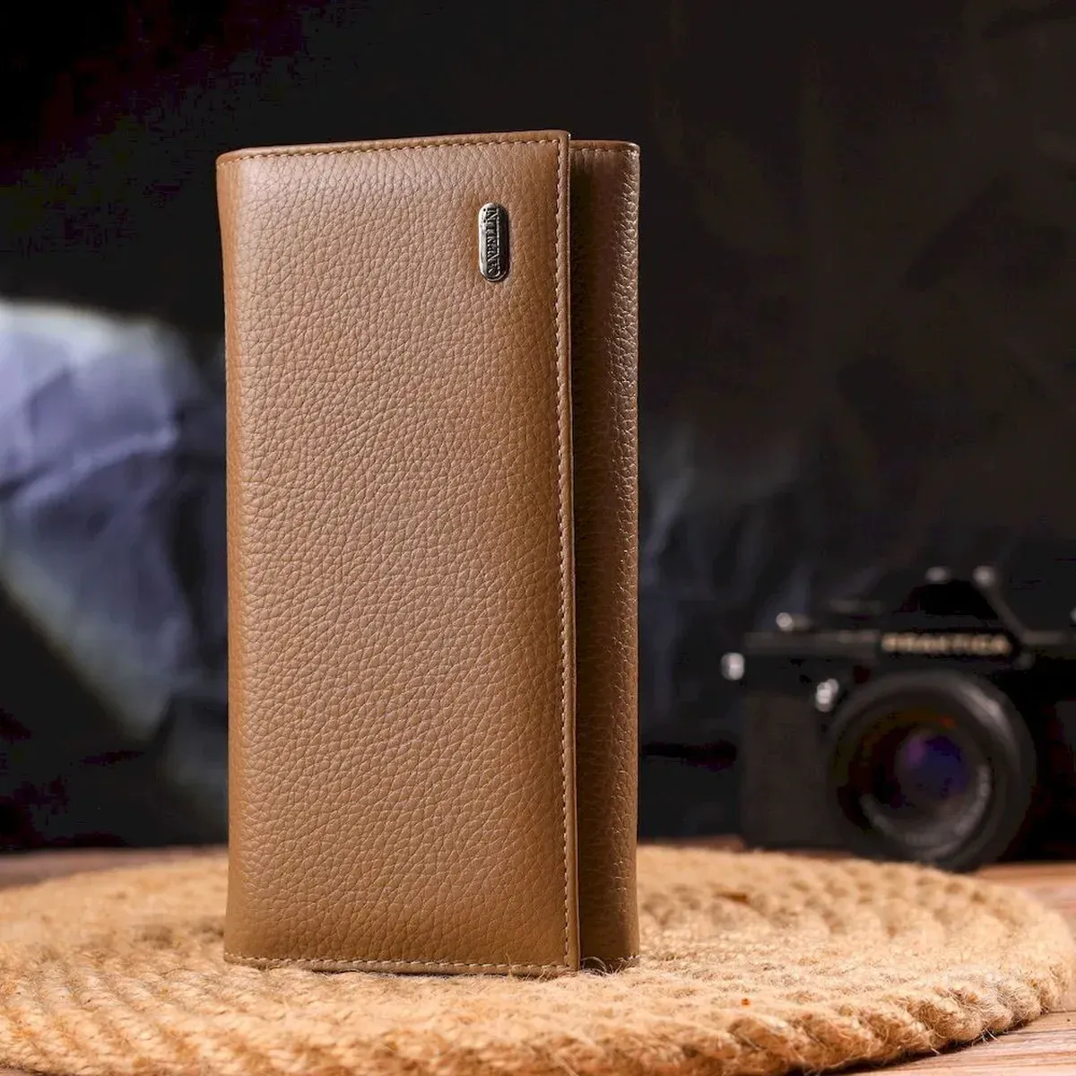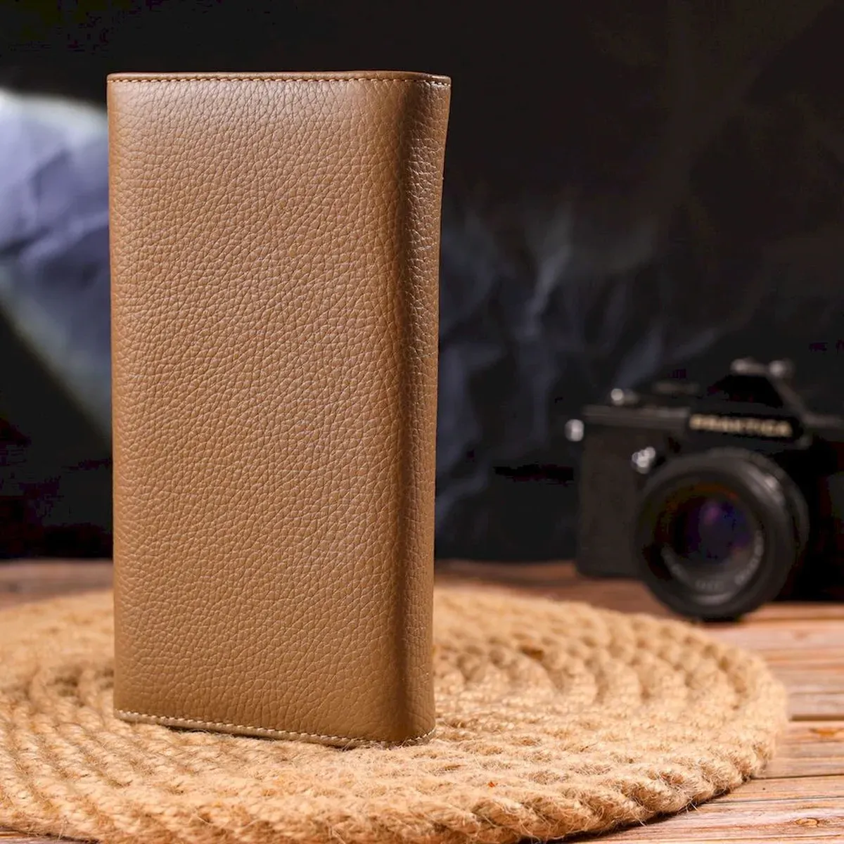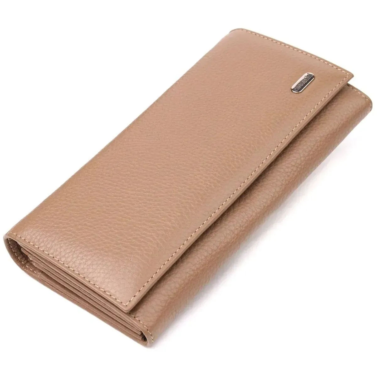 Міцний жіночий гаманець, з натуральної зернистої шкіри, в красивому бежевому кольорі. Аксесуар має три великі кишені для купюр, три прилеглі кишені, вісім осередків для карток, три з них під сіточкою, монетниця на блискавці. Виріб закривається клапаном на кнопку. Відмінна ідея для подарунка, яка не залишить байдужою жодну жінку.