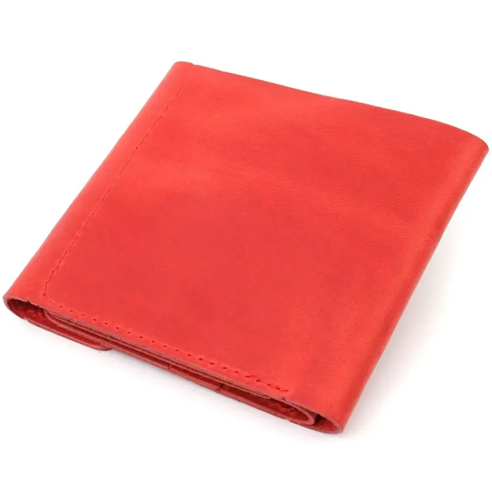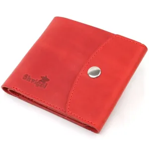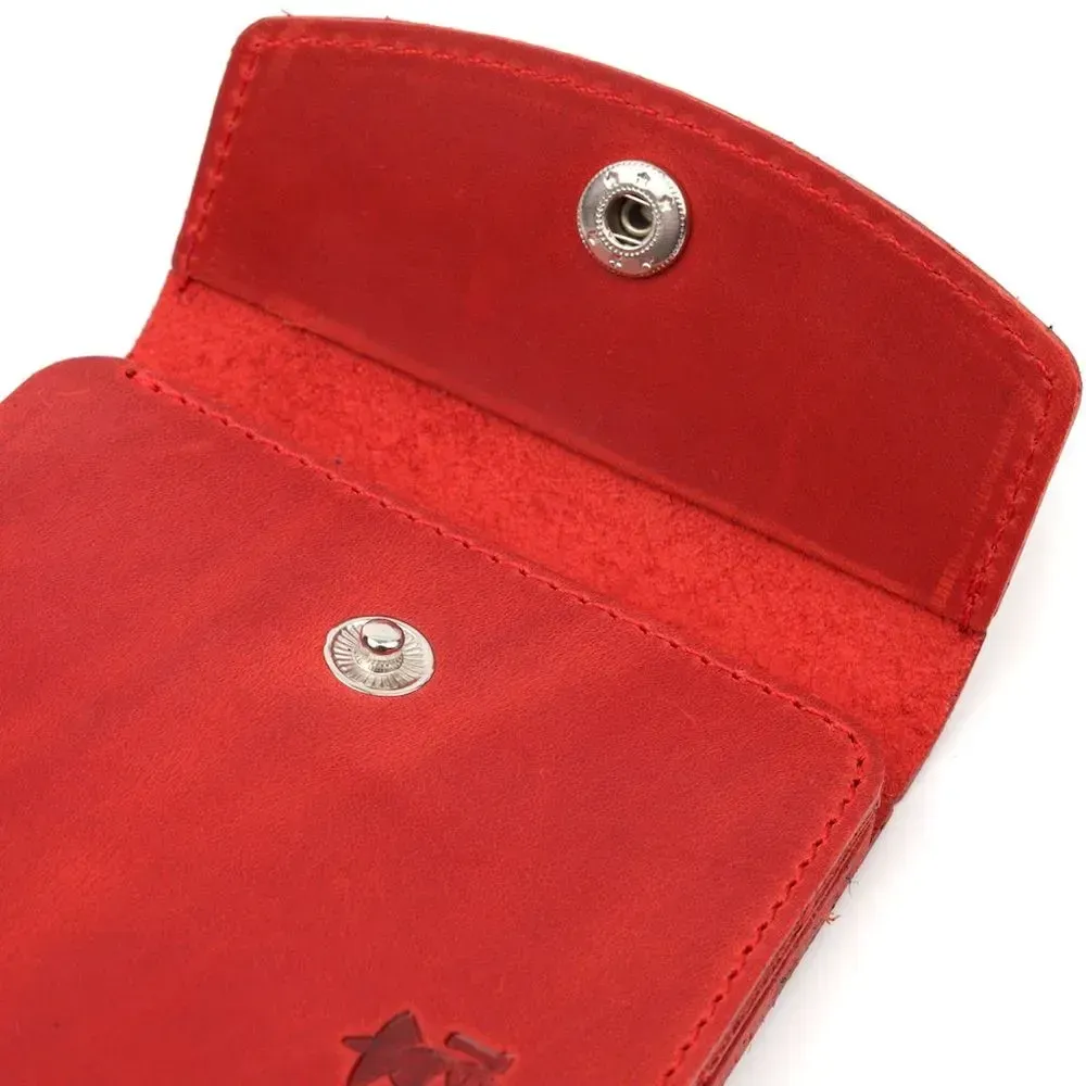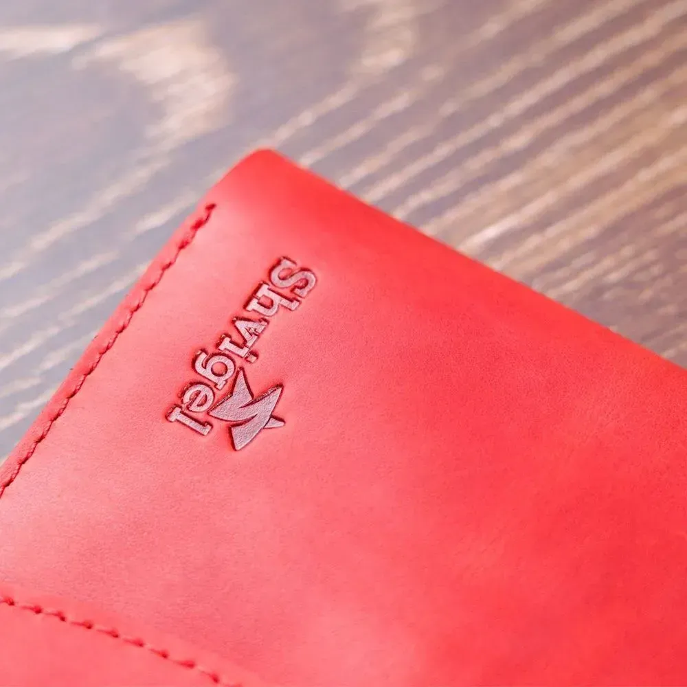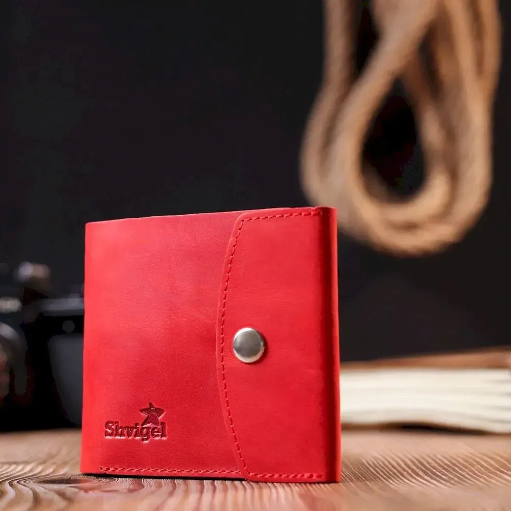 Яскравий компактний гаманець маленького розміру, який легко поміститься навіть у найменшу сумочку. Аксесуар не займе багато місця та не має зайвої ваги. Закривається гаманець хлястиком із кнопкою. Усередині виріб виготовлено також із натуральної шкіри. По краях аксесуара рівний червоний рядок. На лицьовій стороні гаманець прикрашений тисненим логотипом Shvigel. Добротна вінтажна шкіра прослужить Вам дуже довго.