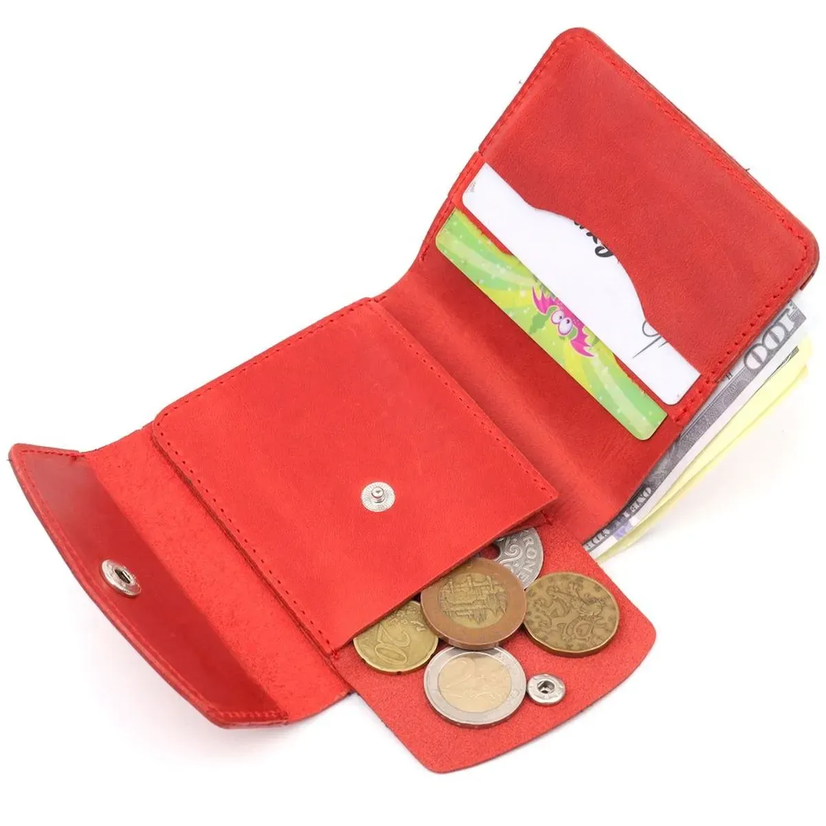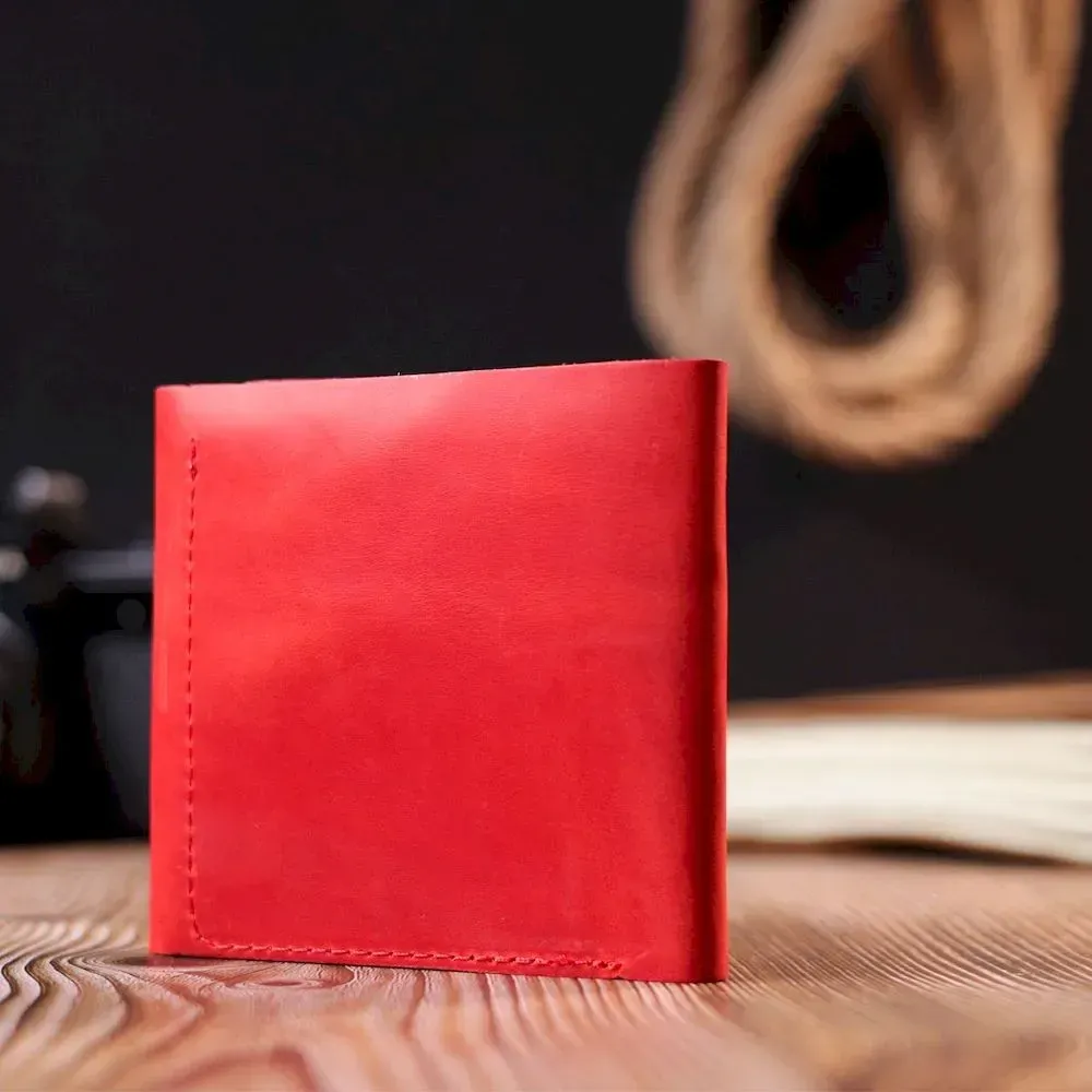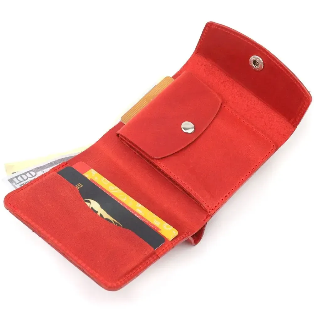 Яскравий компактний гаманець маленького розміру, який легко поміститься навіть у найменшу сумочку. Аксесуар не займе багато місця та не має зайвої ваги. Закривається гаманець хлястиком із кнопкою. Усередині виріб виготовлено також із натуральної шкіри. По краях аксесуара рівний червоний рядок. На лицьовій стороні гаманець прикрашений тисненим логотипом Shvigel. Добротна вінтажна шкіра прослужить Вам дуже довго.