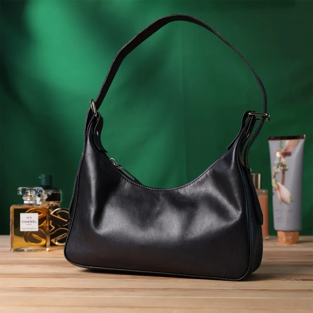 Витончена сумка для тих, хто любить красивий дизайн без зайвих деталей. Це невелика сумка з коротким ременем, яку зручно носити під рукою, вона набула своєї популярності завдяки своєму універсальному дизайну та незвичайній формі. Така сумка у модному світі має назву – сумка багет. Колір виробу – класичний чорний, фактура – гладка, із глянсовим блиском. Матеріал виконання – натуральна шкіра з високими показниками якості. Відмінний варіант сумки на кожен день, адже вона не тільки приваблива зовні, але й оснащена розумною системою внутрішніх відділень, що дозволить організувати простір усередині. Модель виготовлена з якісних матеріалів та добре тримає форму.