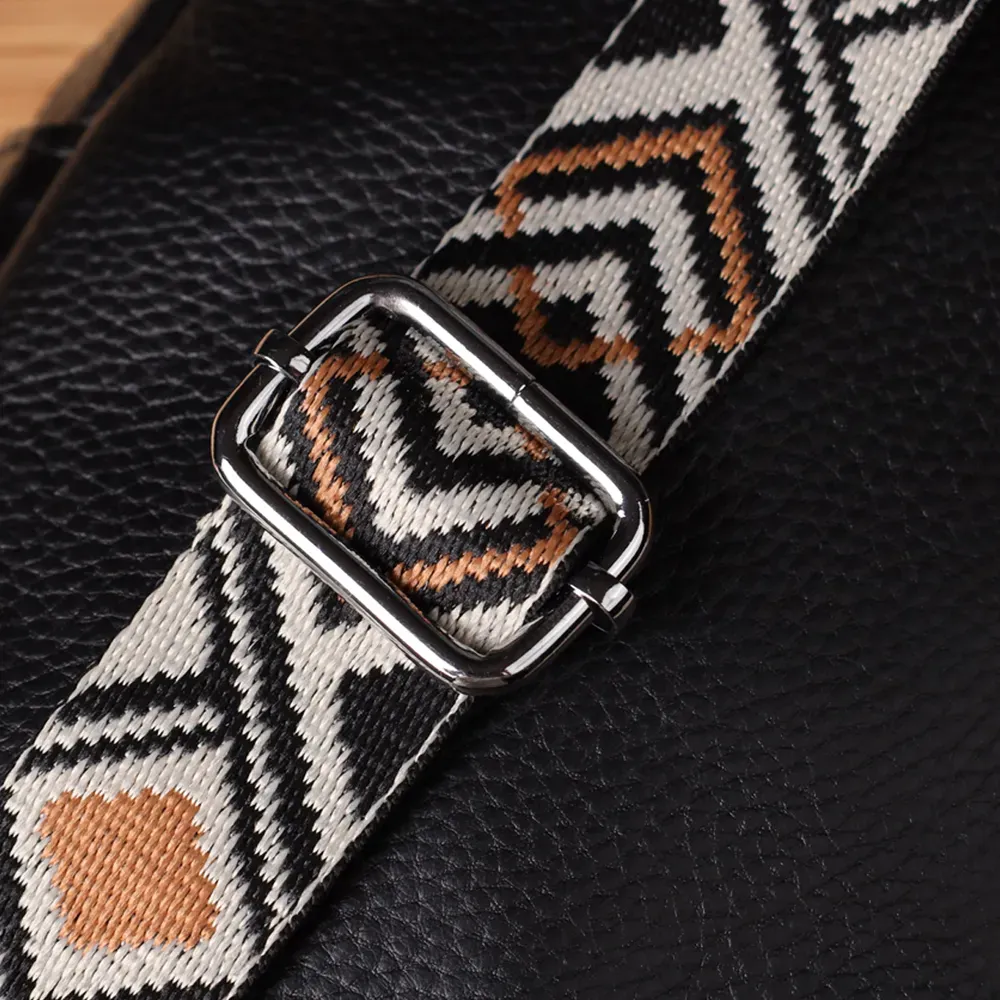 На особливу увагу заслуговує регульований текстильний ремінь з яскравим стильним візерунком - він не тільки забезпечує комфортну посадку на тілі, але і стає виразним елементом дизайну. Ремінь незнімний, але легко регулюється під ваше зростання і спосіб носіння. Фурнітура виконана в сріблястому кольорі, що надає аксесуару сучасний і стриманий блиск, який чудово поєднується з текстурою шкіри та акцентами ременя.