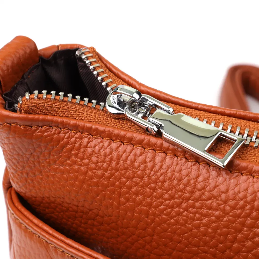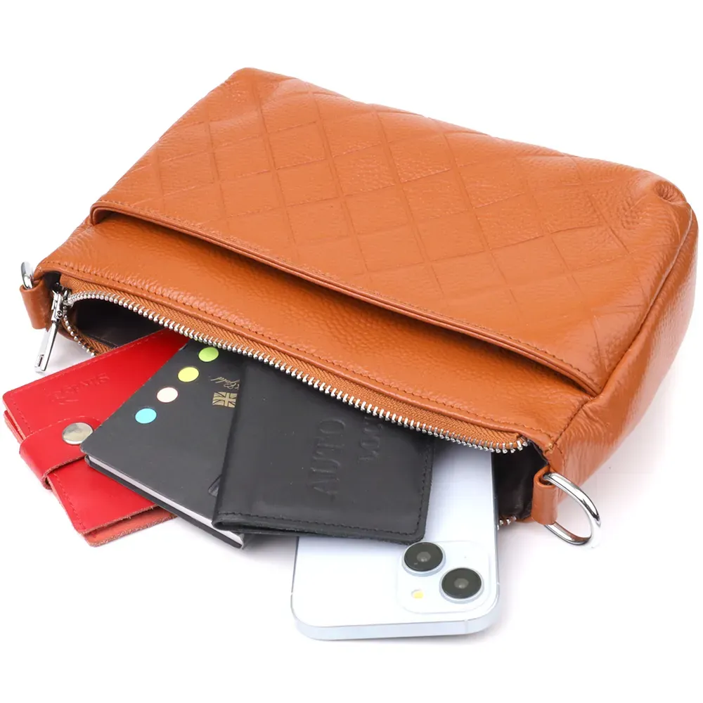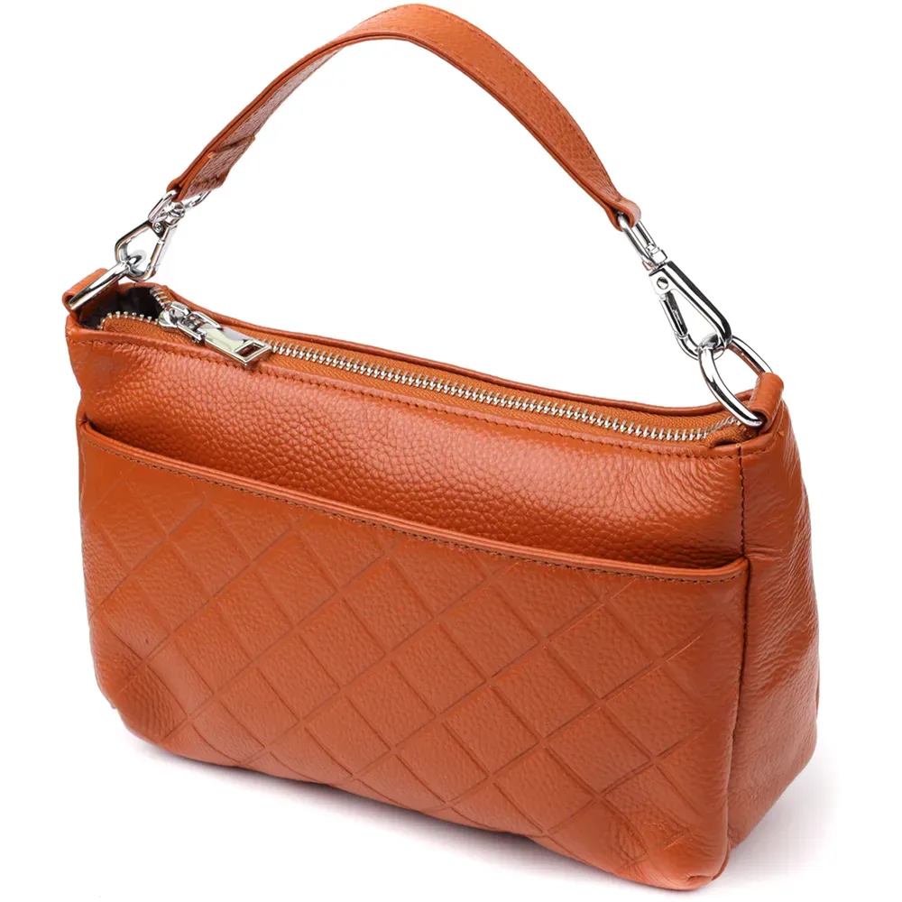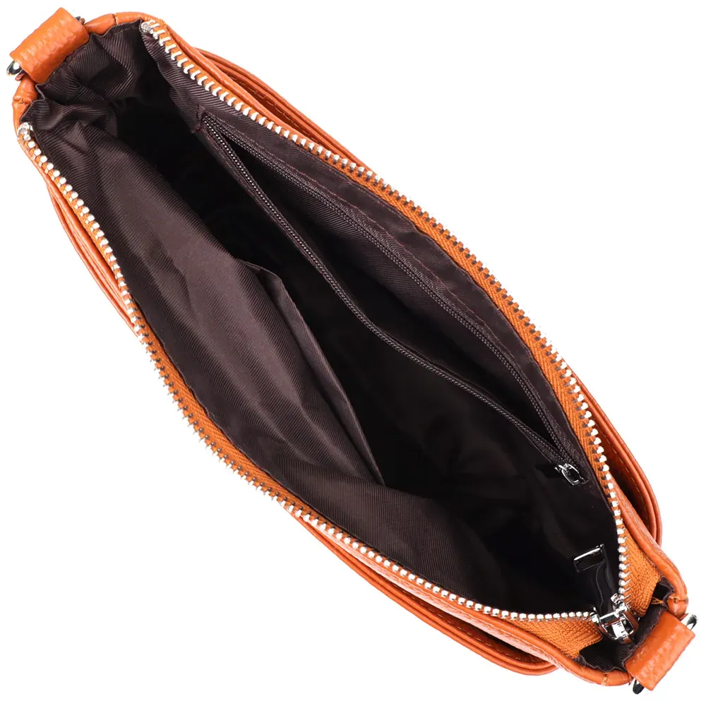 Стильна та практична сумка з натуральної рудої шкіри, яка стане яскравим акцентом у вашому образі. Основне відділення сумки закривається на надійну блискавку, забезпечуючи безпеку ваших речей. Усередині розташована зручна потайна кишеня на блискавці - ідеальне місце для зберігання цінних дрібниць, і кишеня відкритого типу для швидкого доступу до необхідних предметів.