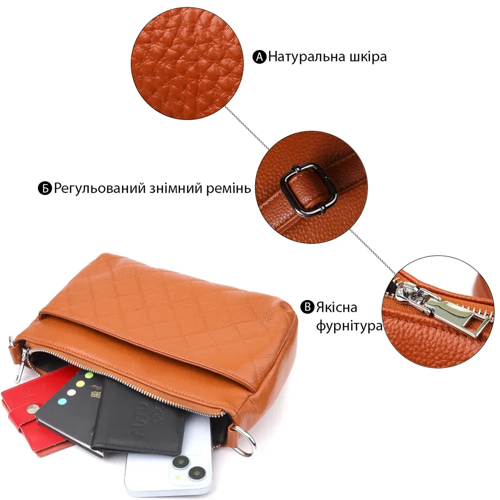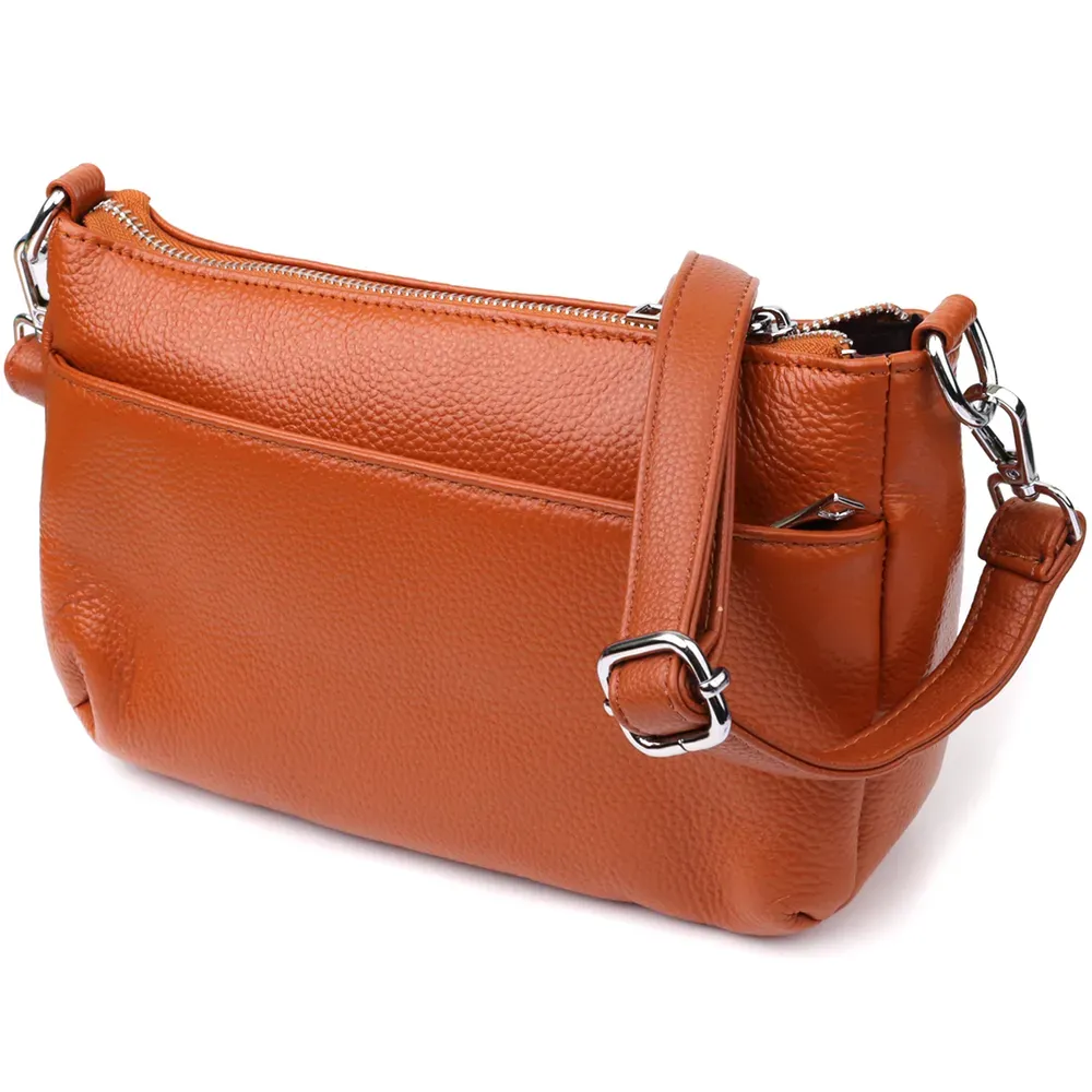 Сумка виконана з якісної, м'якої та приємної на дотик натуральної шкіри насиченого рудого відтінку, який надає виробу теплоти та виразності. З боків знаходяться дві прилеглі кишені, що також закриваються на блискавці, що додає функціональності та допомагає краще організувати простір.