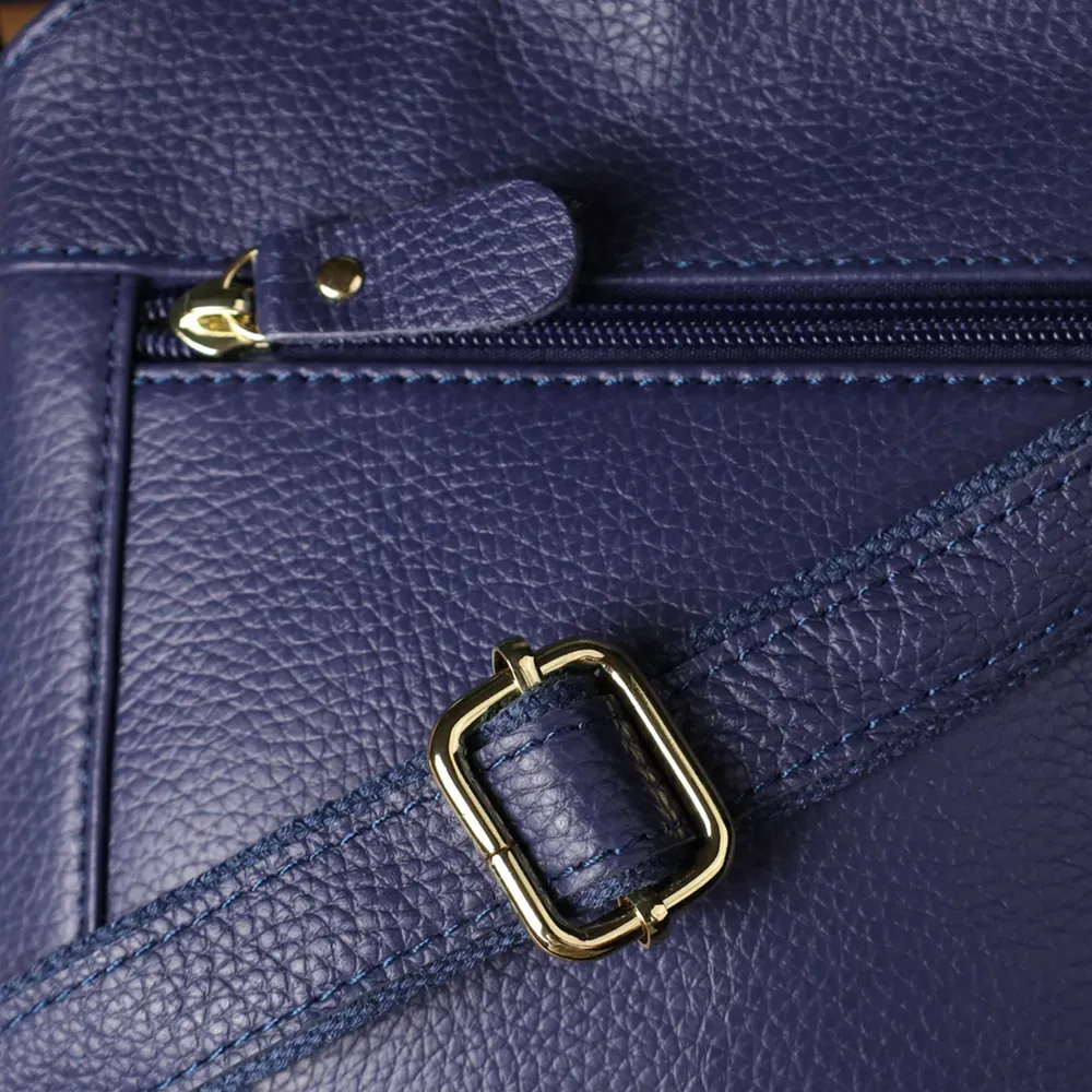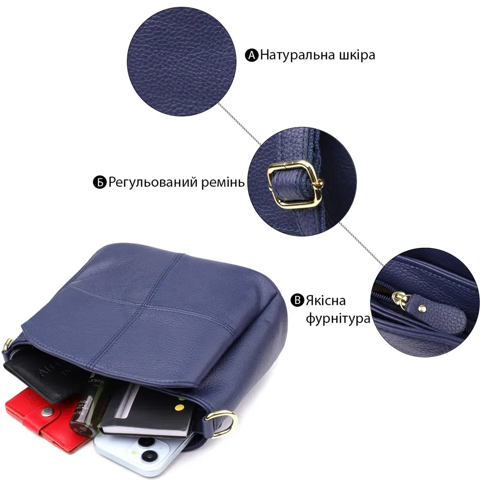 Ця синя шкіряна сумка – вибір тих, хто цінує елегантність, функціональність та нестандартні колірні рішення без зайвої химерності.