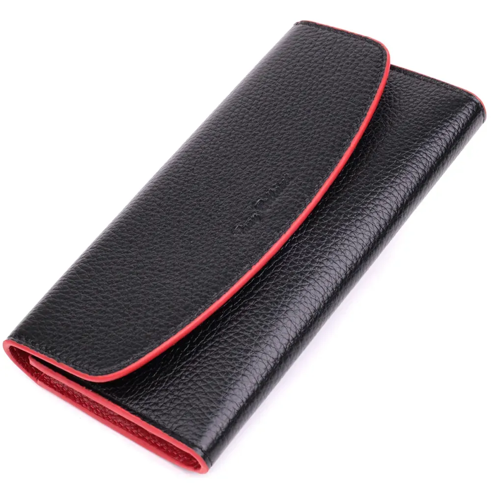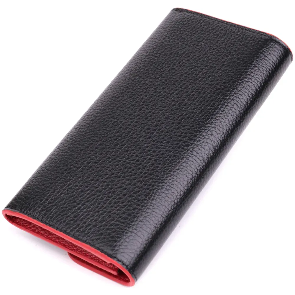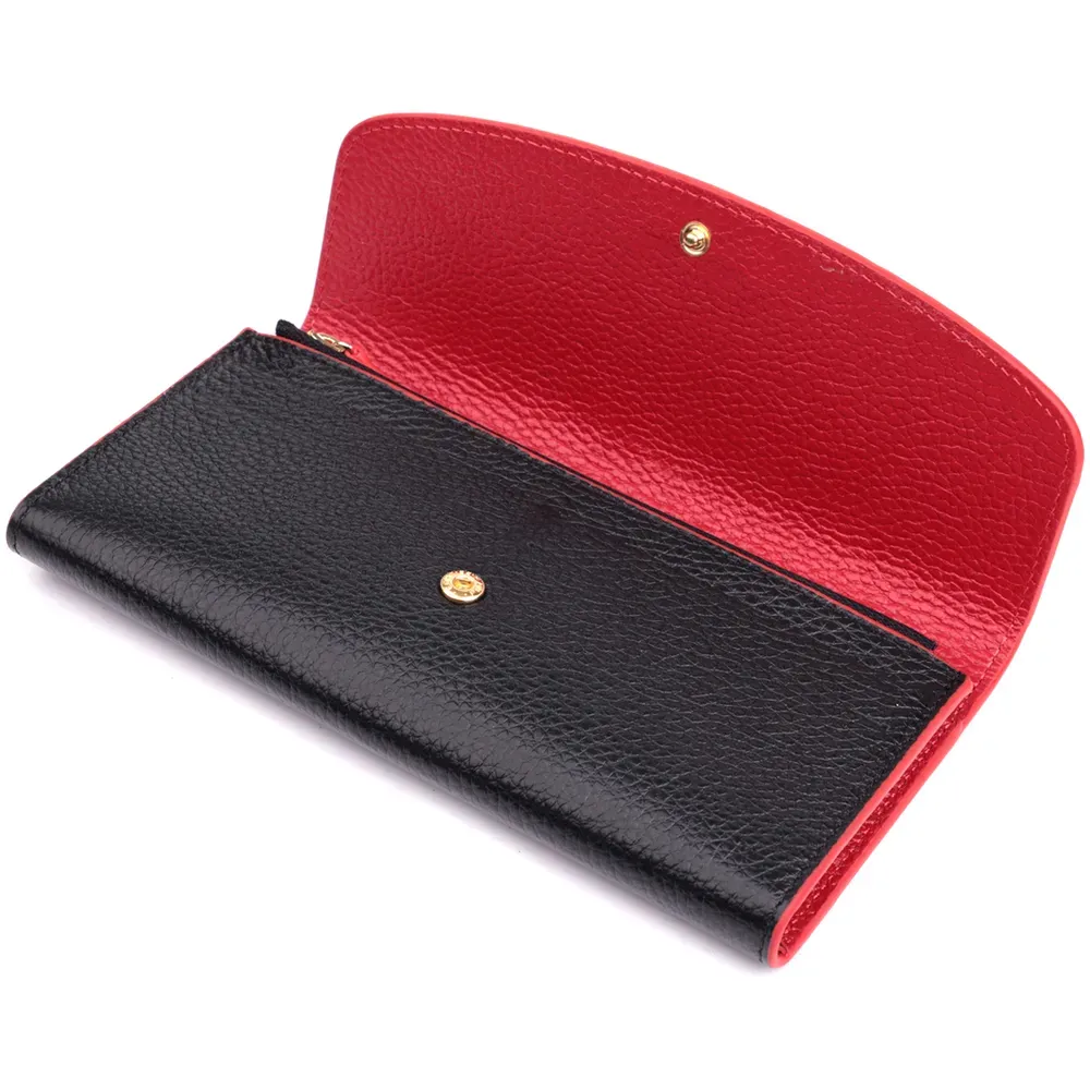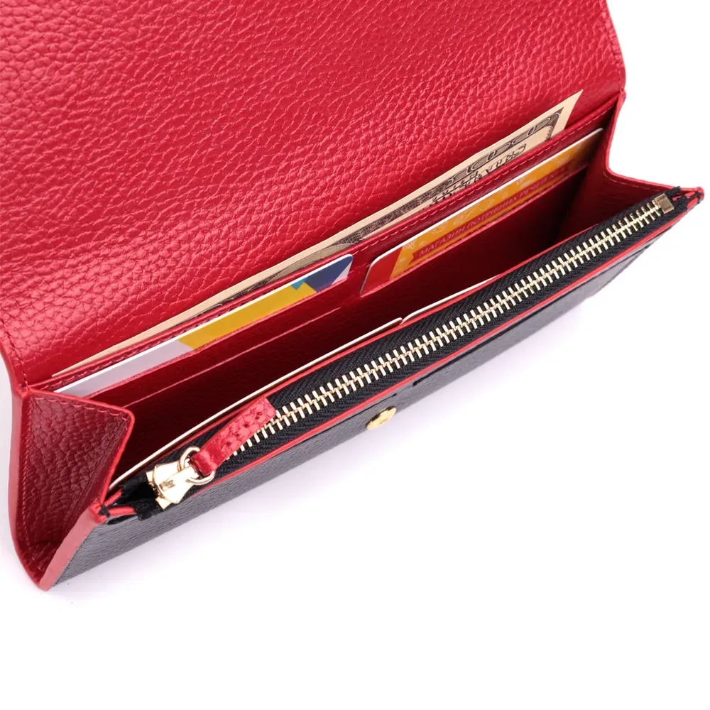 Місткий жіночий гаманець з натуральної шкіри, у комбінації з двох кольорів чорного зовні та червоного всередині. Аксесуар складається з одного широкого відділення для купюр, дванадцяти осередків для пластикових карток, однієї прилеглої кишені та монетниці на блискавці. У виробі використано якісну фурнітуру золотистого кольору. Закривається гаманець клапаном на кнопку. Купуючи цей шкіряний гаманець, Ви не тільки набуваєте стильної речі, але й отримуєте якісний аксесуар, який прослужить не один рік.