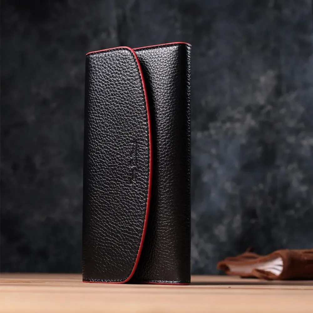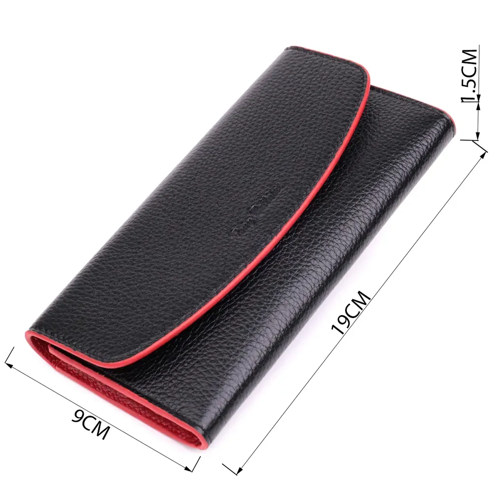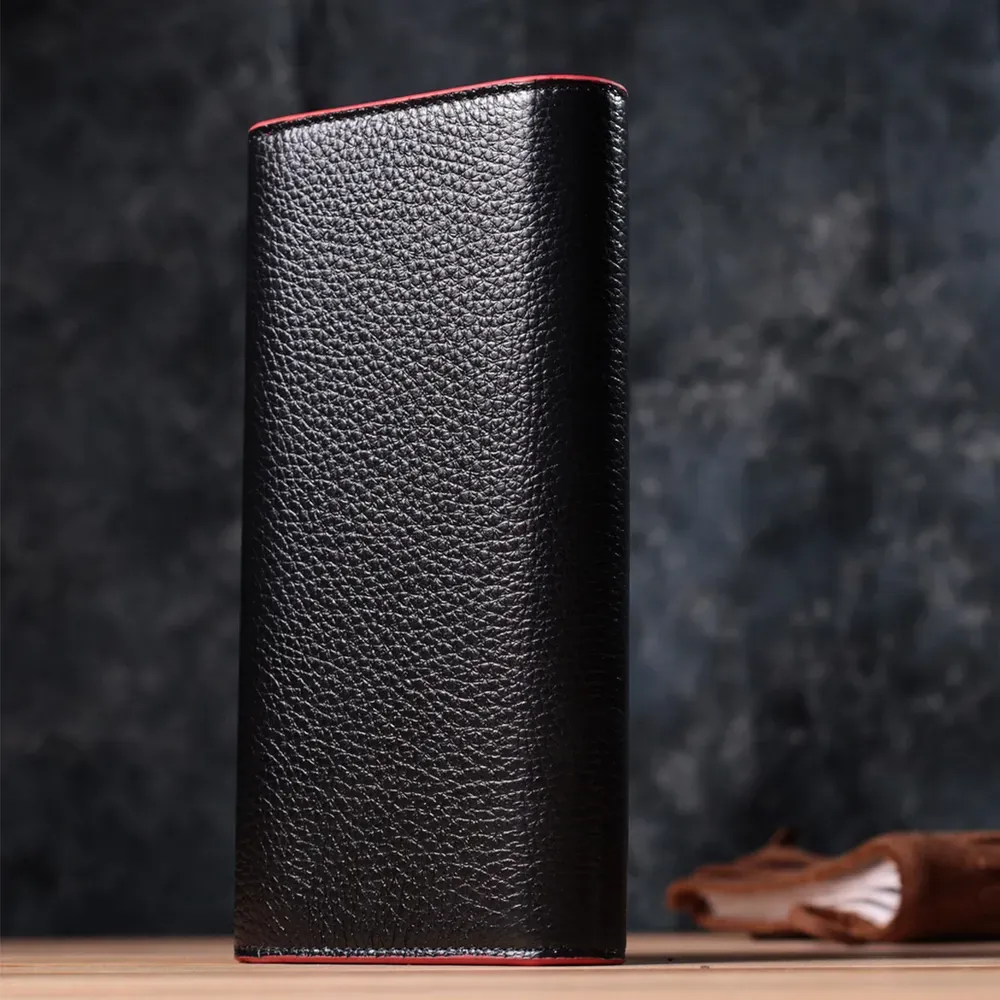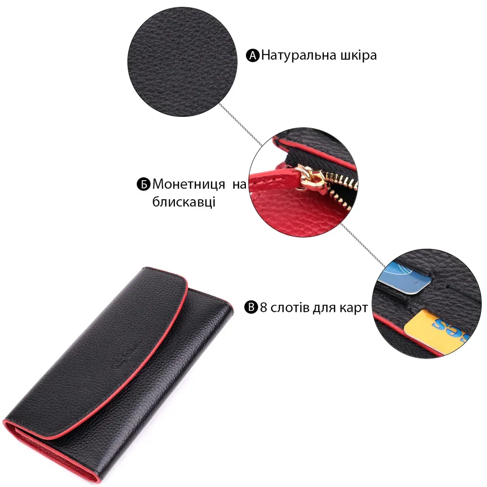 Місткий жіночий гаманець з натуральної шкіри, у комбінації з двох кольорів чорного зовні та червоного всередині. Аксесуар складається з одного широкого відділення для купюр, дванадцяти осередків для пластикових карток, однієї прилеглої кишені та монетниці на блискавці. У виробі використано якісну фурнітуру золотистого кольору. Закривається гаманець клапаном на кнопку. Купуючи цей шкіряний гаманець, Ви не тільки набуваєте стильної речі, але й отримуєте якісний аксесуар, який прослужить не один рік.