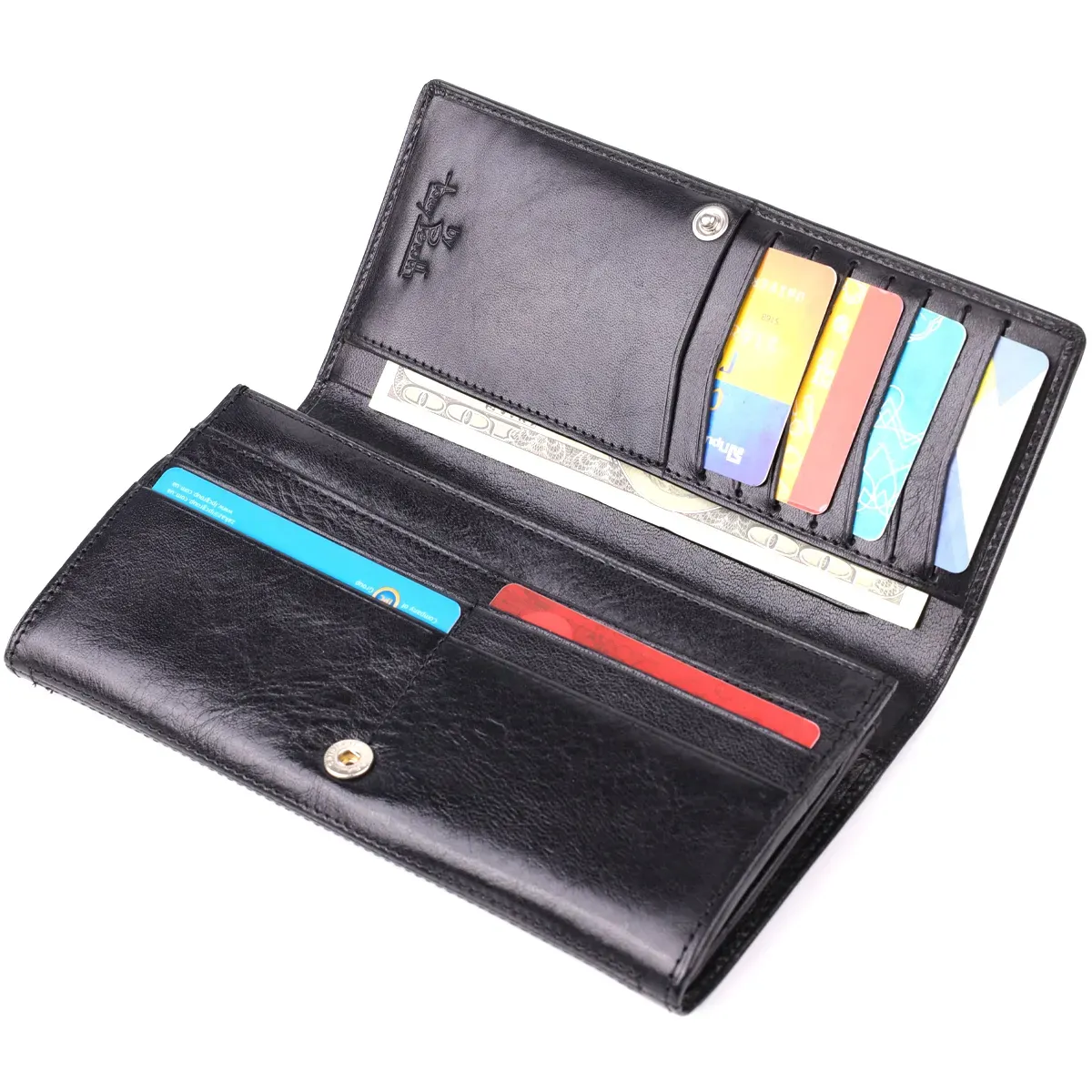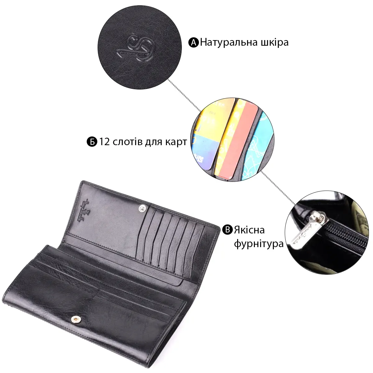 - 3 плоскі кишені на всю довжину портмоне;