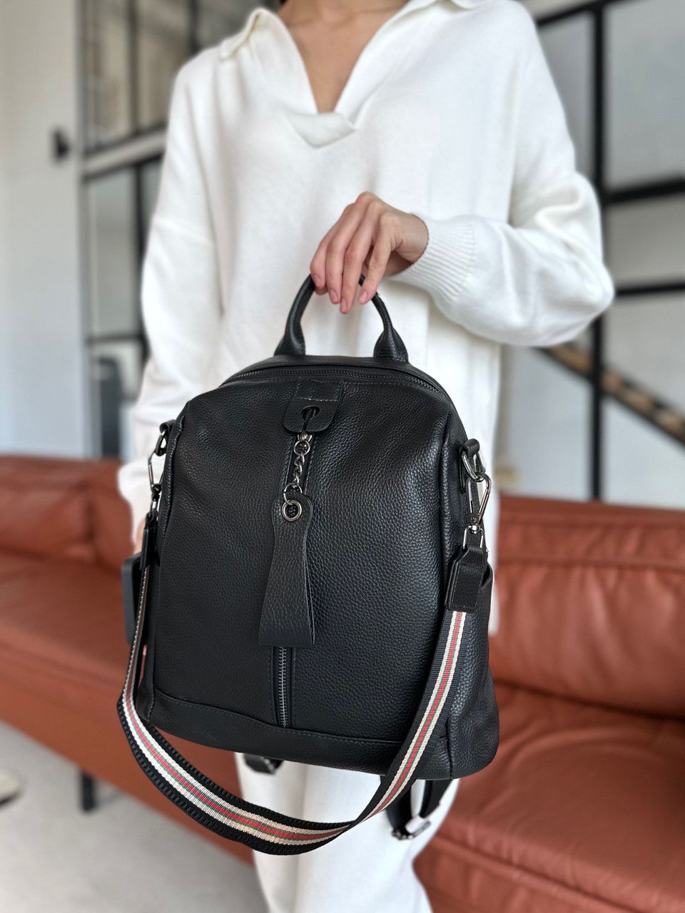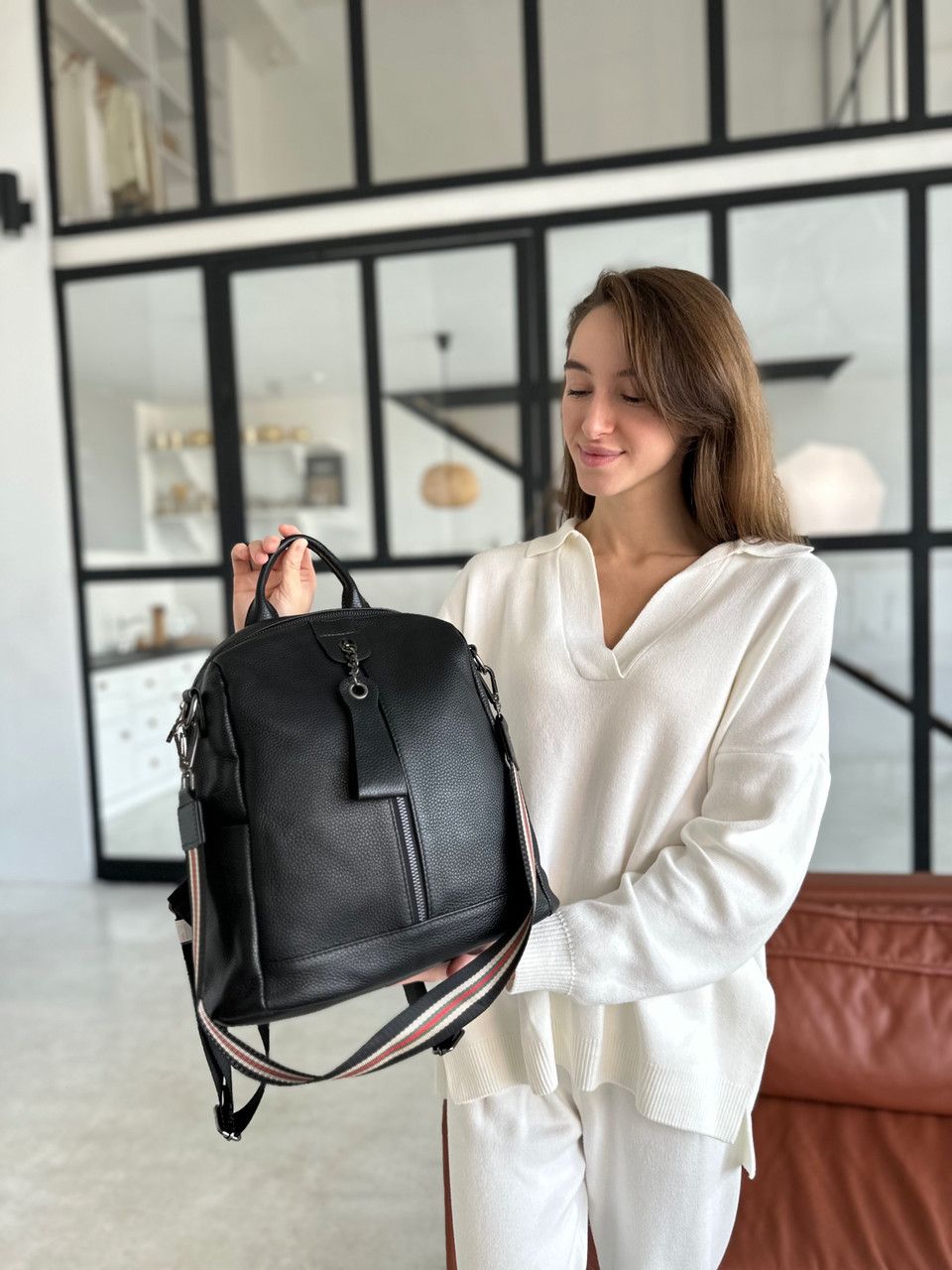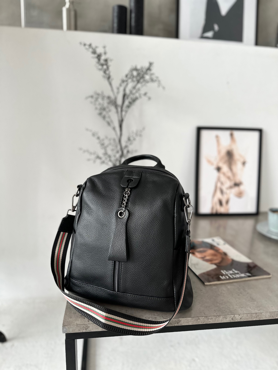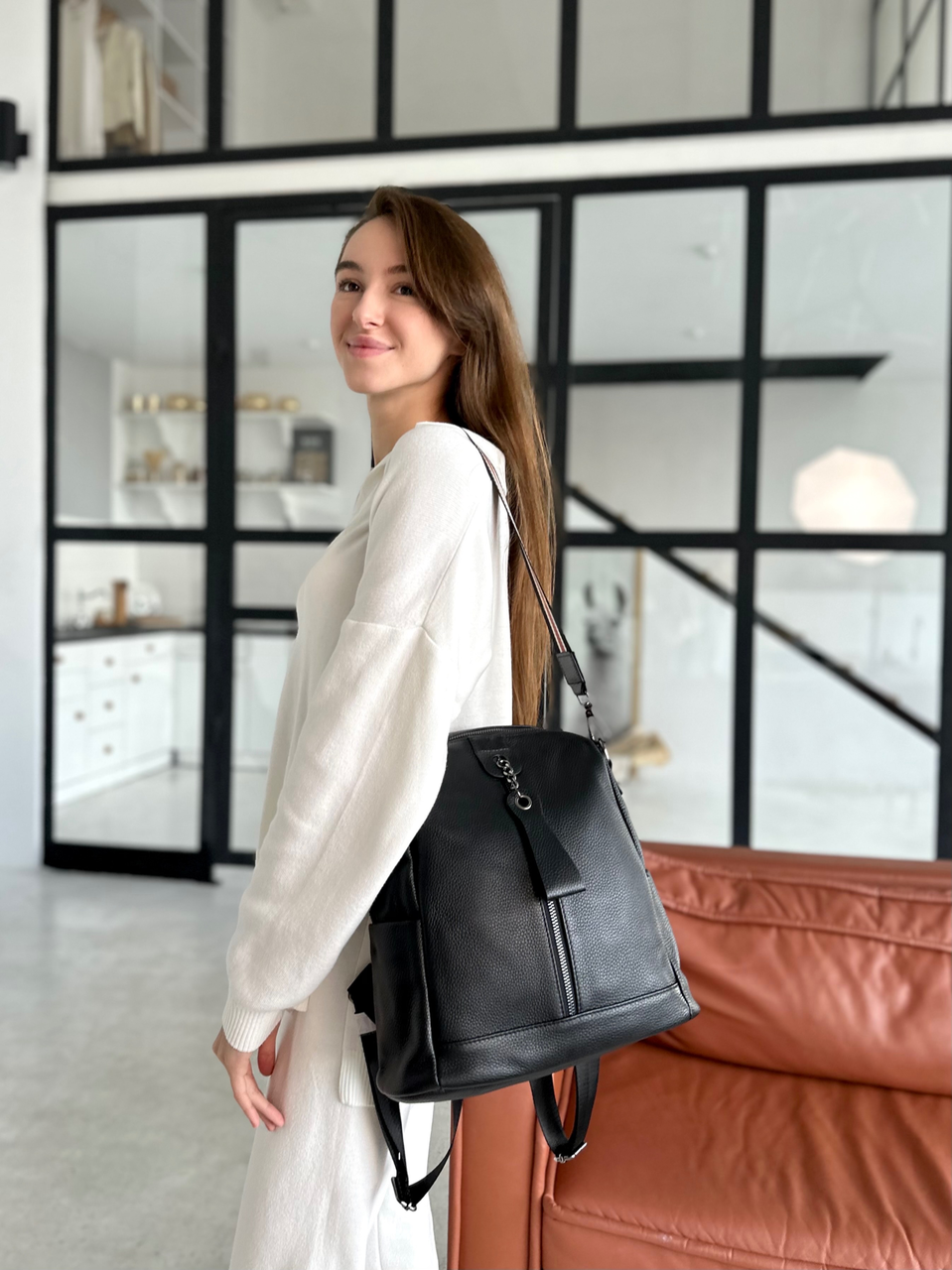 Стильний аксесуар для дівчат і жінок, необхідний для повсякденного життя, яка стає динамічнішою, активнішою та швидкіснішою. У такий практичний і функціональний рюкзак дасть змогу розмістити багато різноманітних речей. Виготовлений із натуральної шкіри, у практичному чорному кольорі, який буде доречний у будь-якій колірній гамі гардероба. Вміщує документи формату А5.