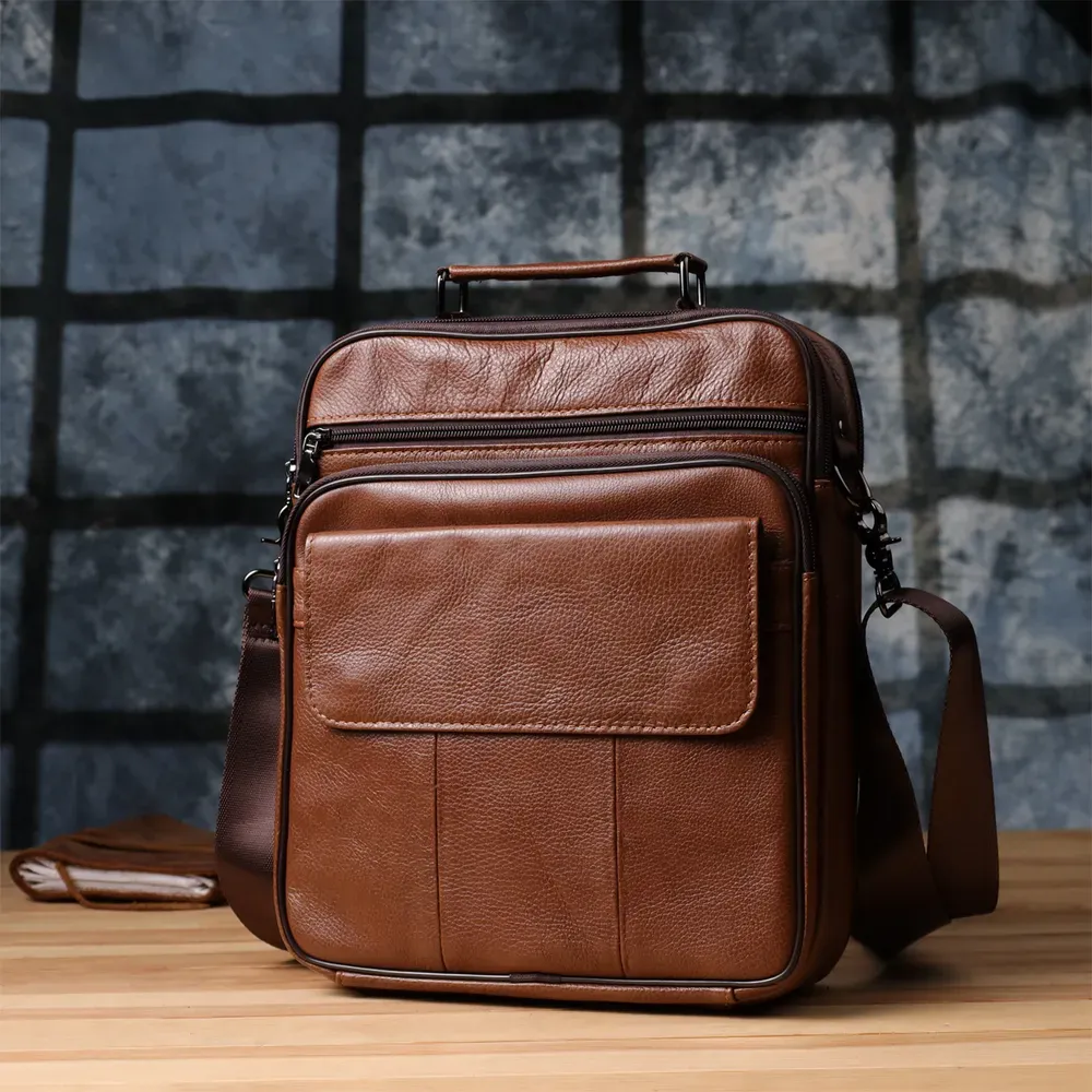 Практична чоловіча шкіряна сумка із зернистої натуральної шкіри поєднує в собі міцність, функціональність та стильний дизайн. Вона стане ідеальним аксесуаром для тих, хто цінує зручність та організованість у повсякденному житті.