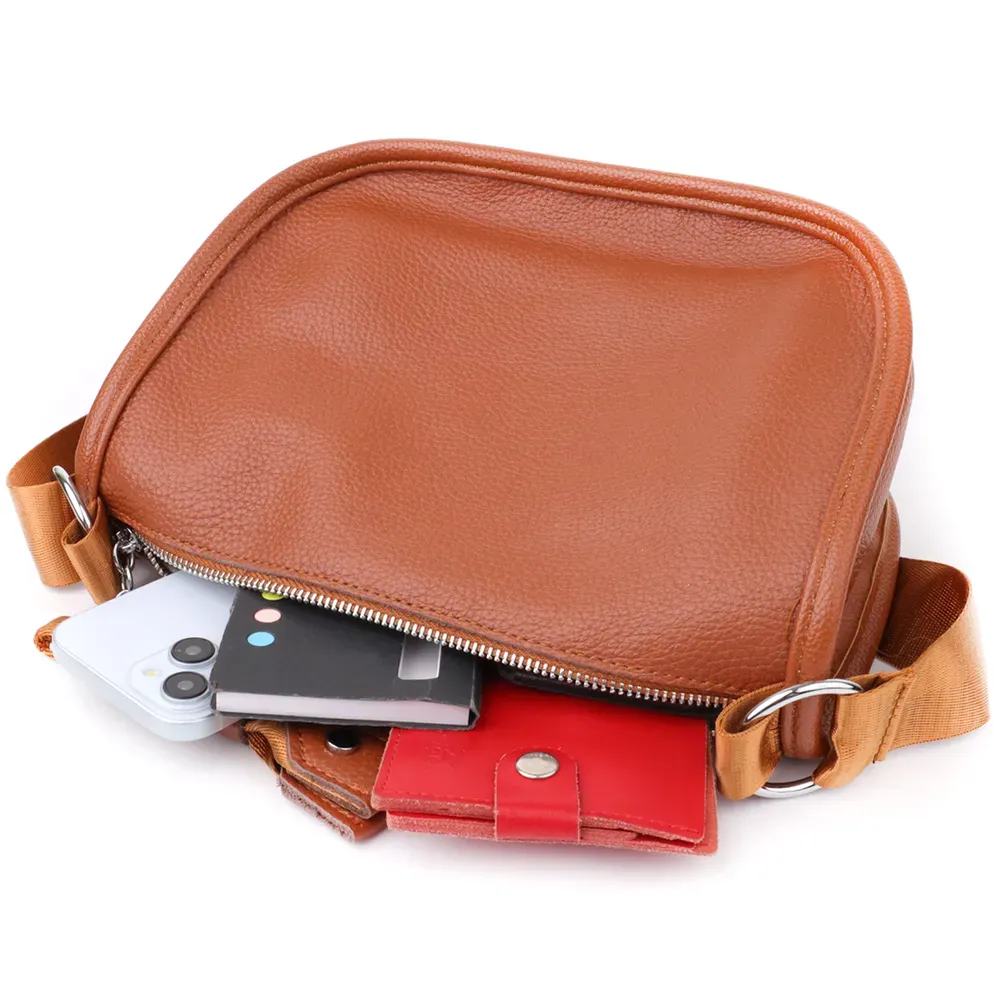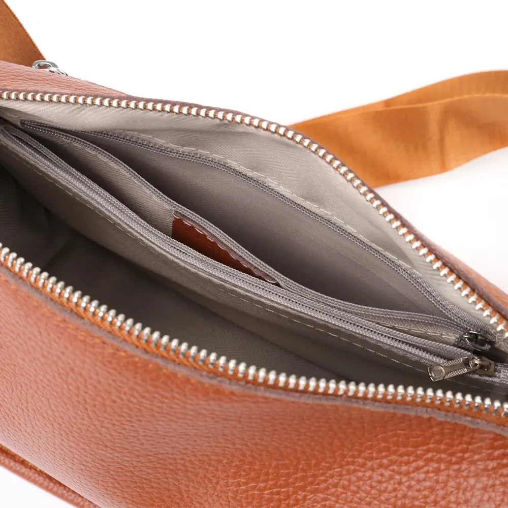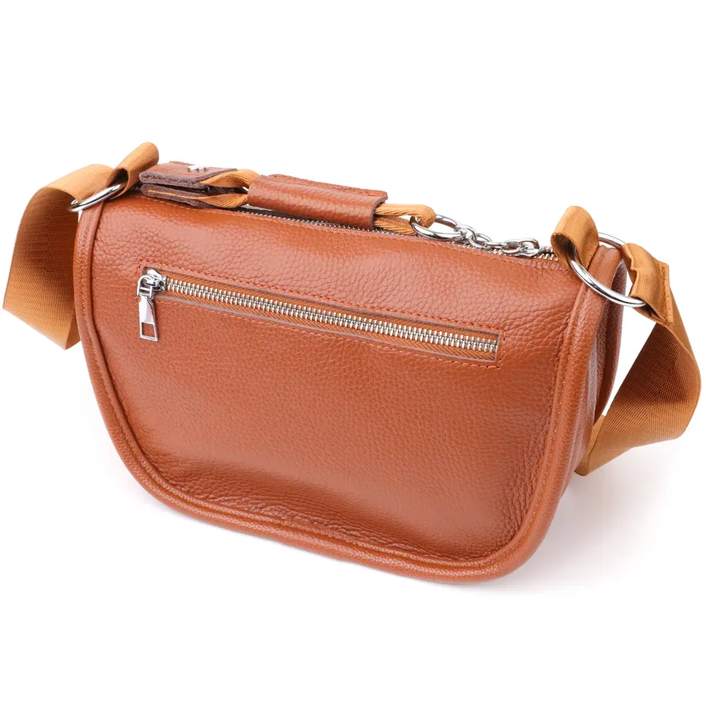 Жіноча шкіряна сумка коричневого кольору виконана з якісної зернистої шкіри і має напівкруглу акуратну форму, що підкреслює елегантність і сучасний стиль. Особливий акцент моделі - декоративний бігунок у вигляді стильного брелка, який додає індивідуальності та вишуканості. Сумка закривається на блискавку, всередині одне основне відділення з двома кишенями на блискавці та двома відкритими кишенями для дрібниць, на тильній стороні розташована зовнішня кишеня на блискавці. Текстильний ремінь не знімний та забезпечує зручне носіння, а фурнітура під срібло гармонійно доповнює теплий відтінок шкіри. Ця сумка стане універсальним аксесуаром для повсякденного використання та особливих випадків, поєднуючи практичність, стиль та увагу до деталей.