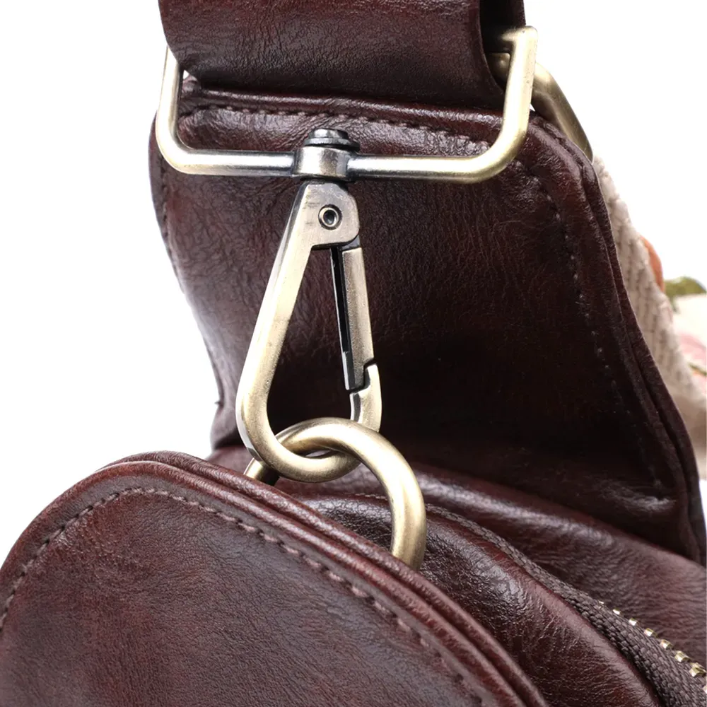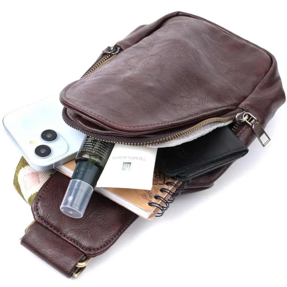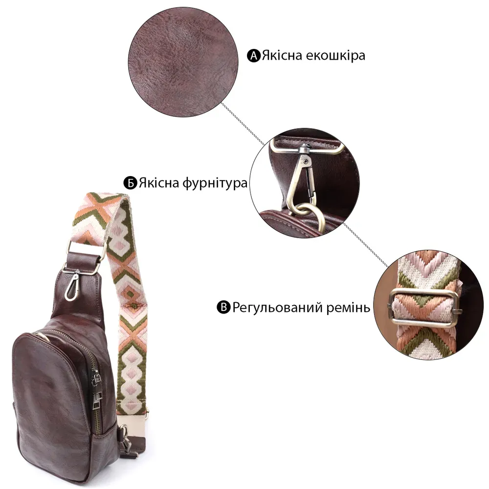 Стильна жіноча компактна сумка через плече на кожен день із якісного екошкіри, яка є альтернативою натуральній шкірі. Дана модель складається з одного основного відділення, яке закривається на блискавку і в якому знаходяться три кишені для кредитних карток усередині, а також однієї потайної кишені на лицьовій стороні, що закривається на карабін. Акцентом даної моделі є зручний регульований плечовий ремінець у етнічному стилі, що дуже модно вже кілька сезонів. Екошкіра – високоякісна альтернатива натуральному матеріалу, яка дуже стійка до тертя, до низьких температур, відмінно носиться на відміну від інших штучних матеріалів, а також має гіпоалергенний склад на відміну від натуральної шкіри. Мода не стоїть на місці, на зміну класичним сумкам приходять нові моделі, які обумовлені сучасним часом, саме такою є слінг сумка - зручна, практична, невелика, але містка і головне якісна.