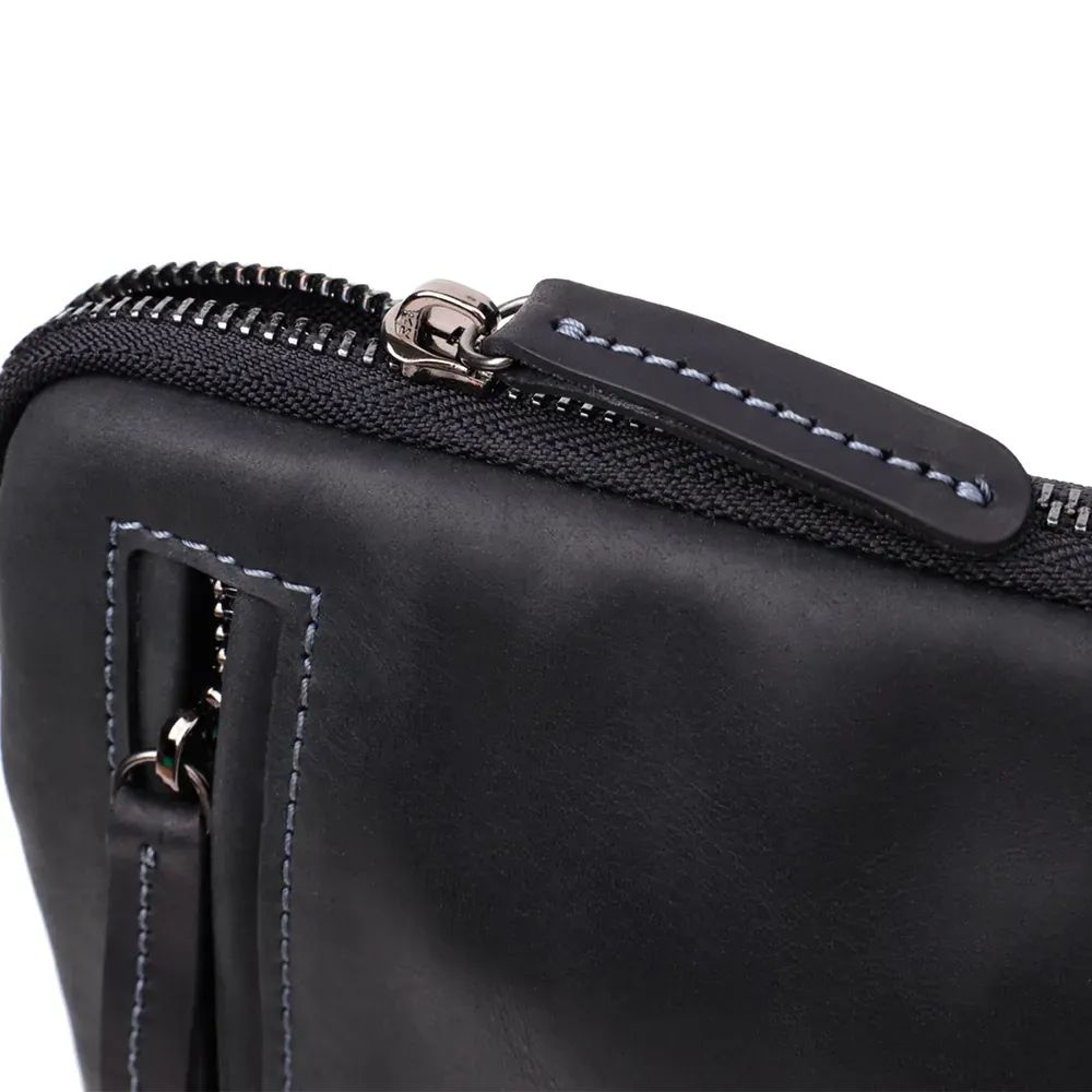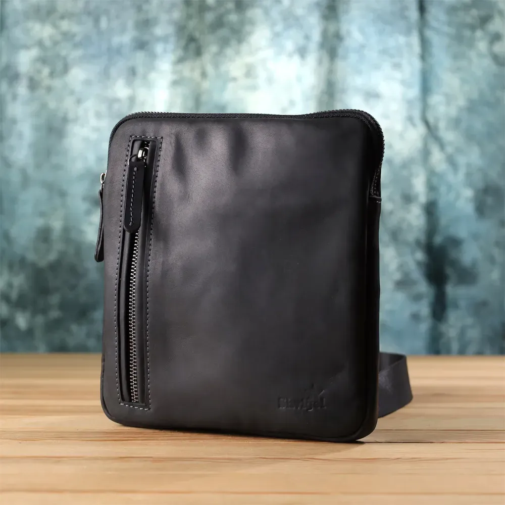Компактна чоловіча вертикальна сумка SHVIGEL виконана з натуральної вінтажної шкіри з декоративним синім рядком по контуру. Лаконічний дизайн у поєднанні з функціональною організацією простору робить її зручним аксесуаром для повсякденного використання.