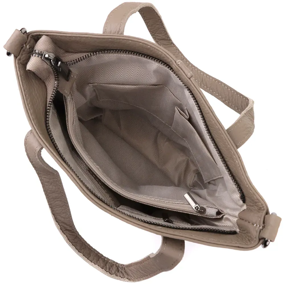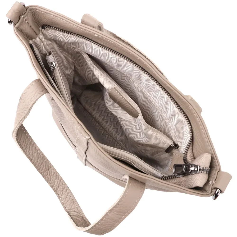 Сумка закривається на блискавку та має зручне основне відділення, доповнене потайною кишенею на блискавці, кишенею-перегородкою на блискавці та відкритою кишенею для дрібниць. Тверде дно дозволяє сумці добре тримати форму, а фурнітура кольору темного срібла підкреслює її стриманий і витончений характер.